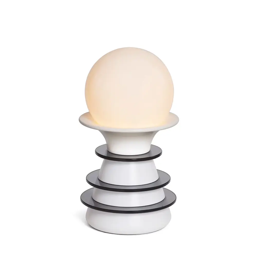 The result of an elegant combination of volumes and materials, the new Catodo lamp evokes the lines of the vase with the same name. A conical base in matte or glossy lacquered polyurethane, decorated with two dark smoked glass discs, accommodates an illuminating sphere in smoked glass or milk-white glass. It is part of the New Atomic Age collection designed by Elena Salmistraro for Scapin Collezioni. The designer takes inspiration from the historical period between the 1940s and 1960s.