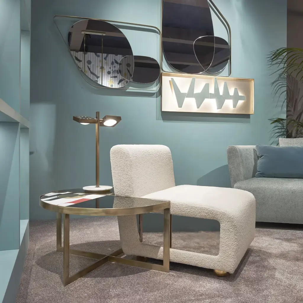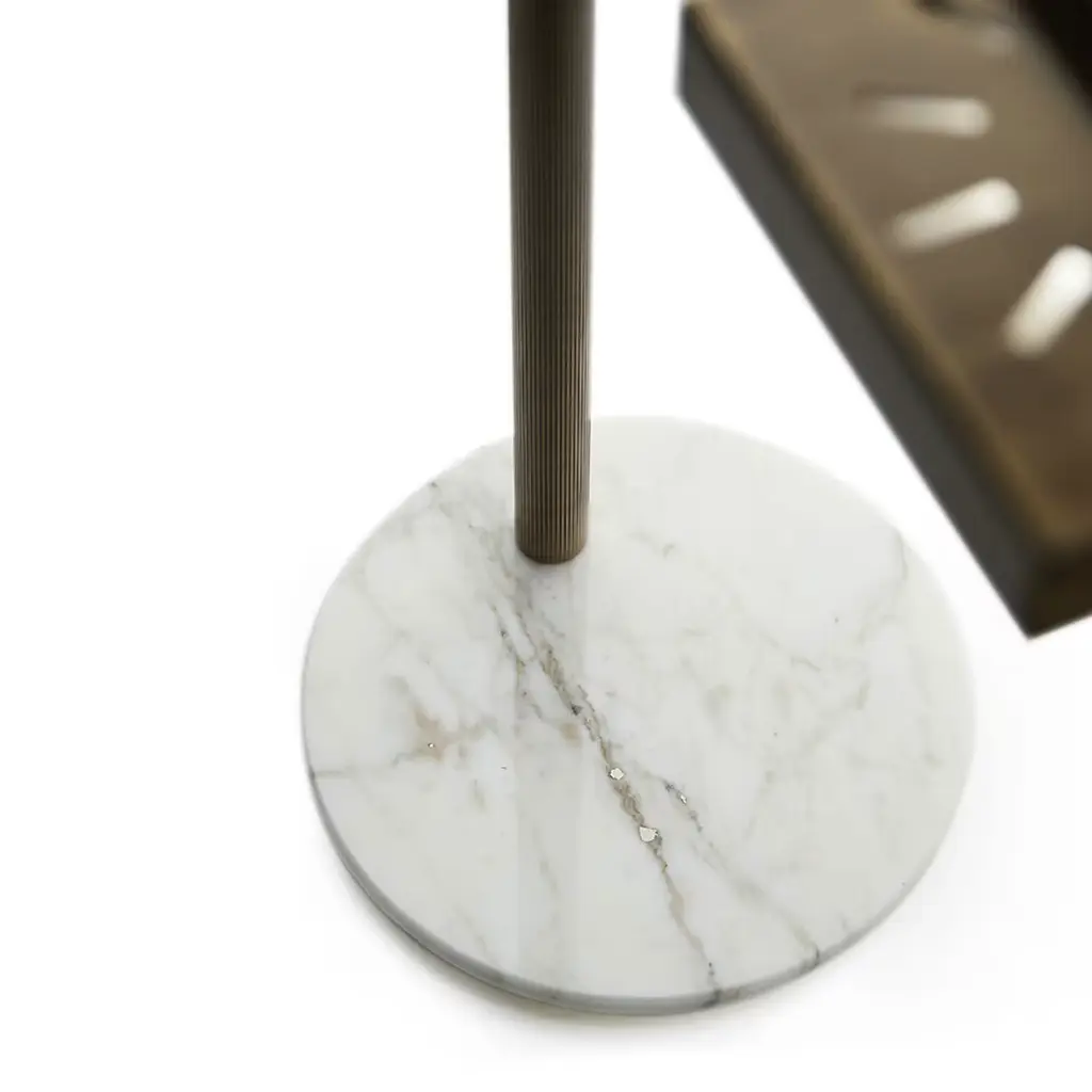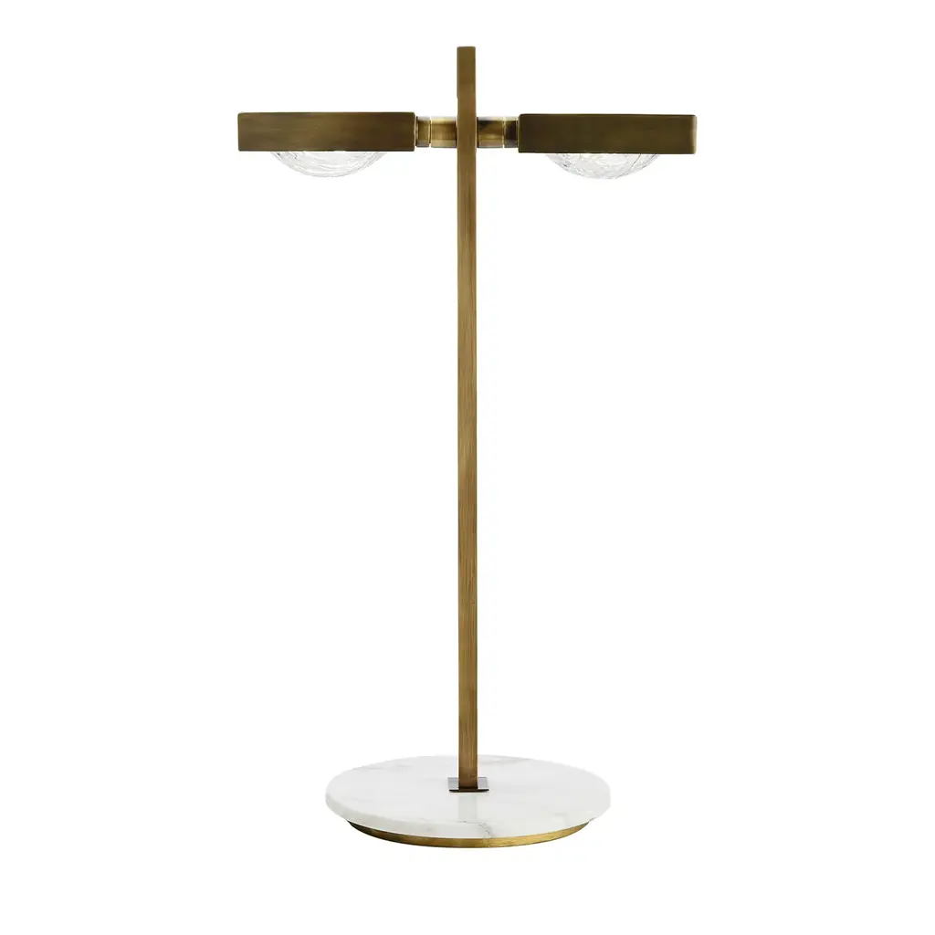 Part of the Cecile collection of lighting, this lamp features two LED lights, each covered with a round, textured plexiglas shade, mounted on a square structure in brass. The two shades project their light at different angles, for a very versatile effect and are supported by a central vertical element in brass, stemming from a round base covered in marble. The interplay between round and square elements creates a stunningly modern piece that will enrich any decor.