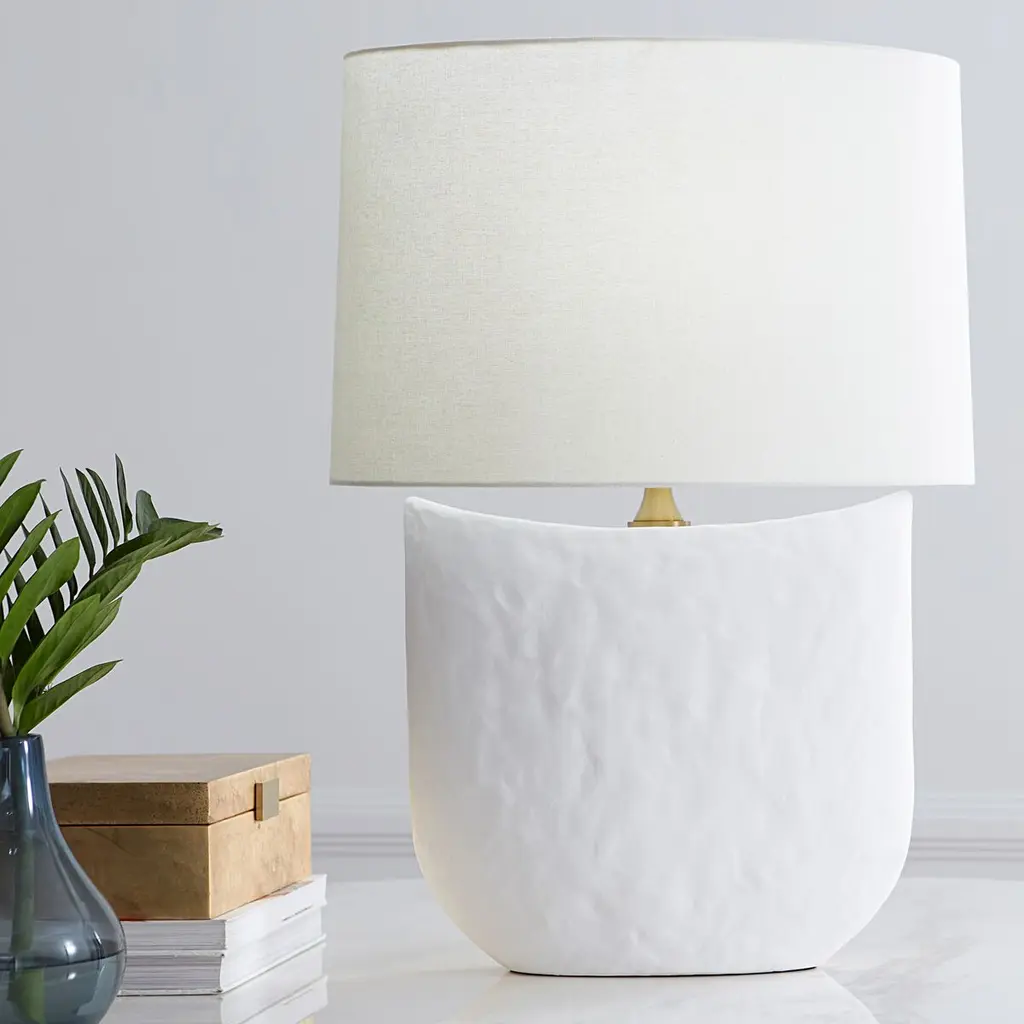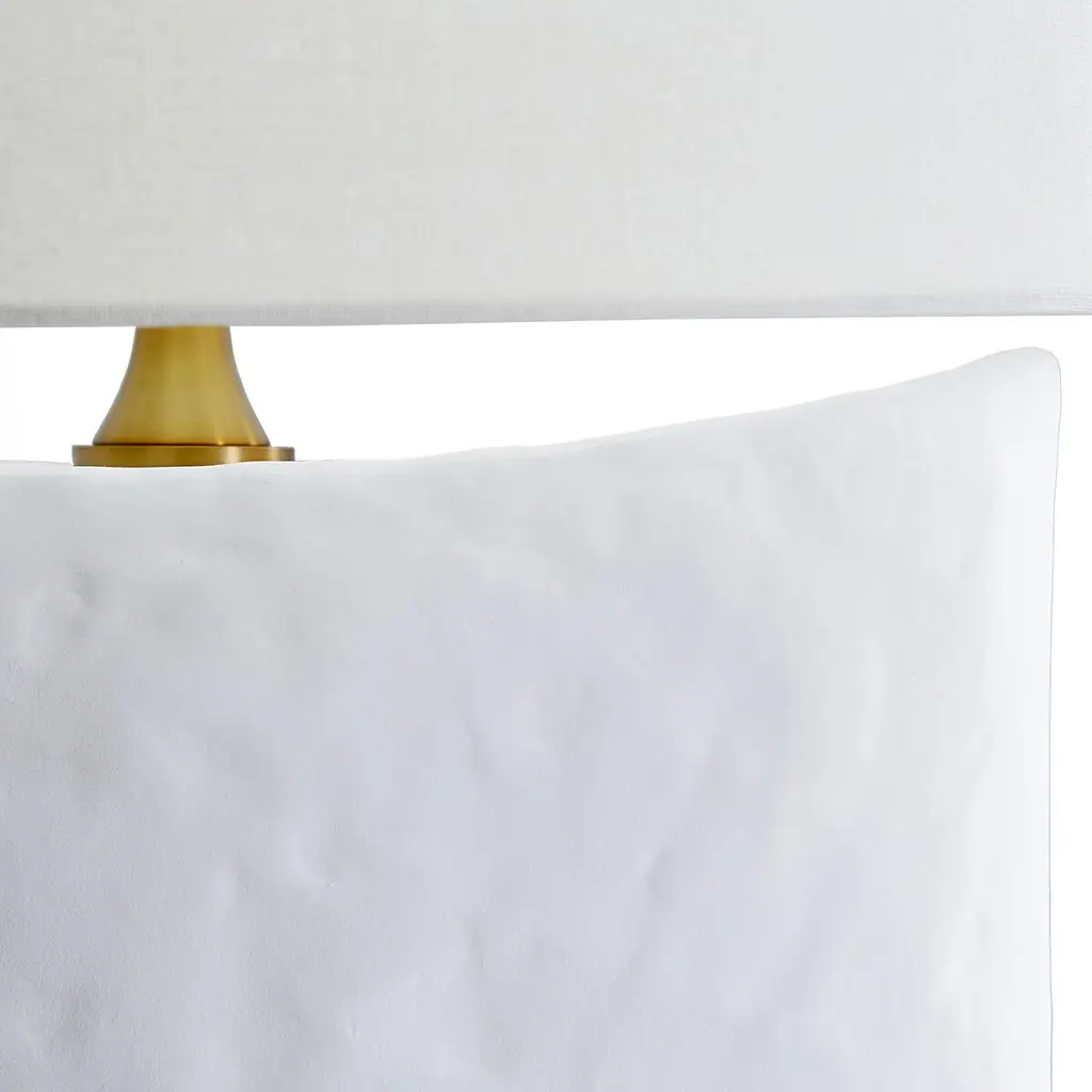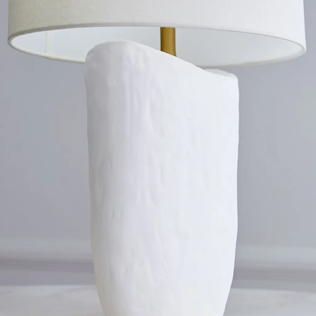 The matte white finish accentuates the sculptural form and organic texture of this table lamp's ceramic body. The white linen shade is an ideal complement.