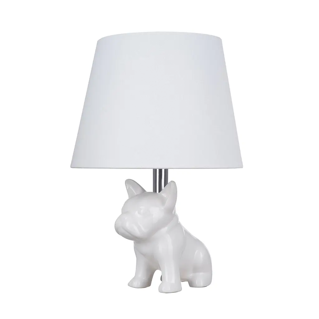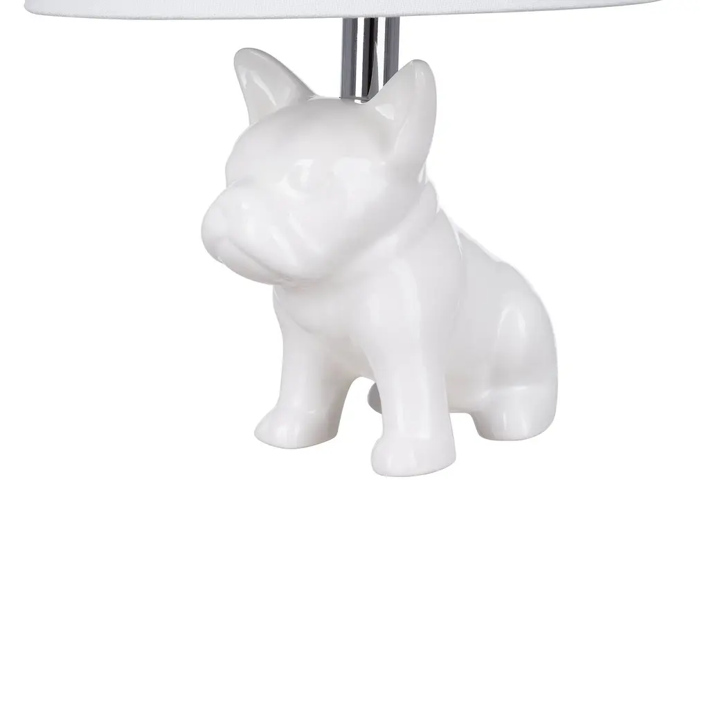 Here is a novelty lamp that knows how to sit, stay, and brighten any space. Featuring an ceramic bull dog figure sitting charmingly under a white shade, this whimsical accent lamp provides ample ambient light. This lamp features a white linen shade and an on/off switch on socket with a 60" clear power cord. A compact design makes it the perfect bedside companion or darling addition to the dorm, kids room, living room or office workspace.