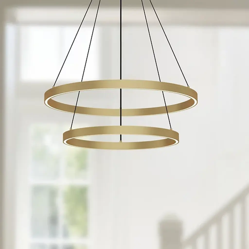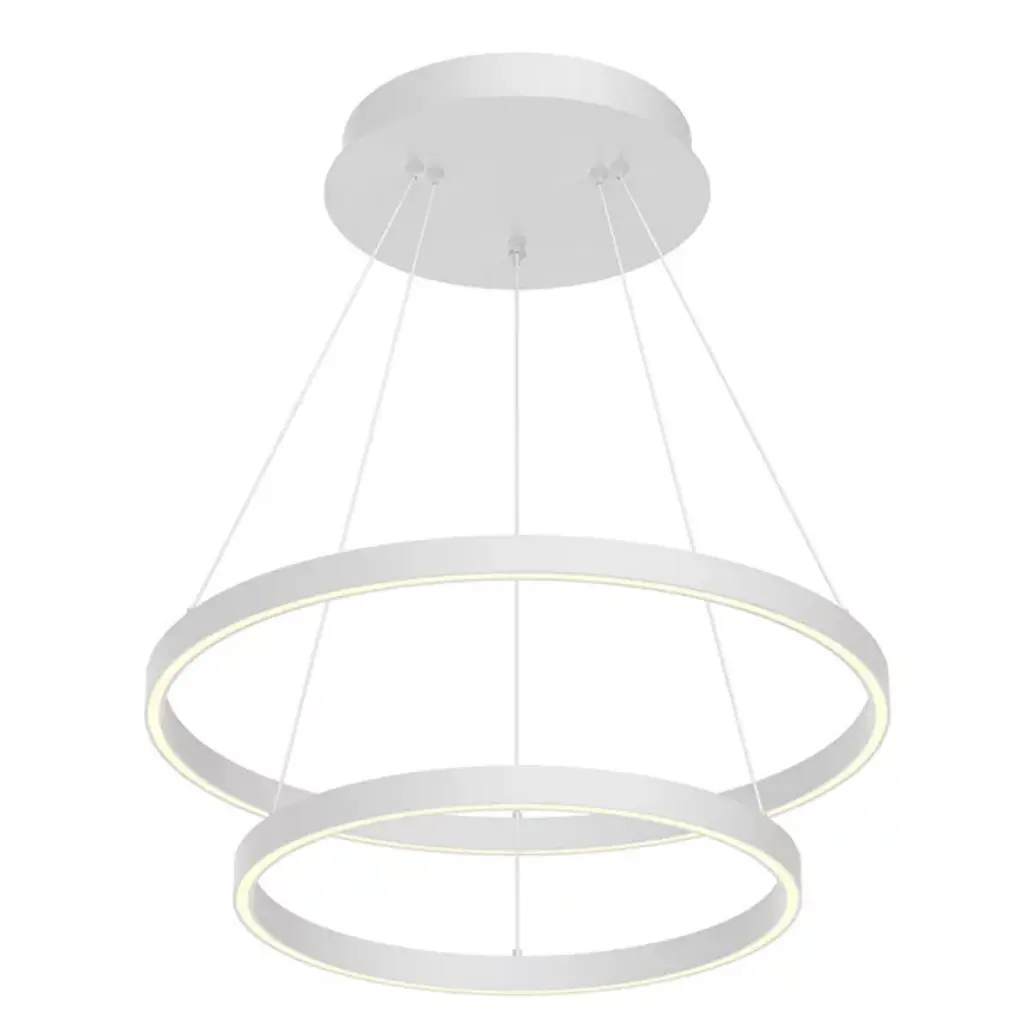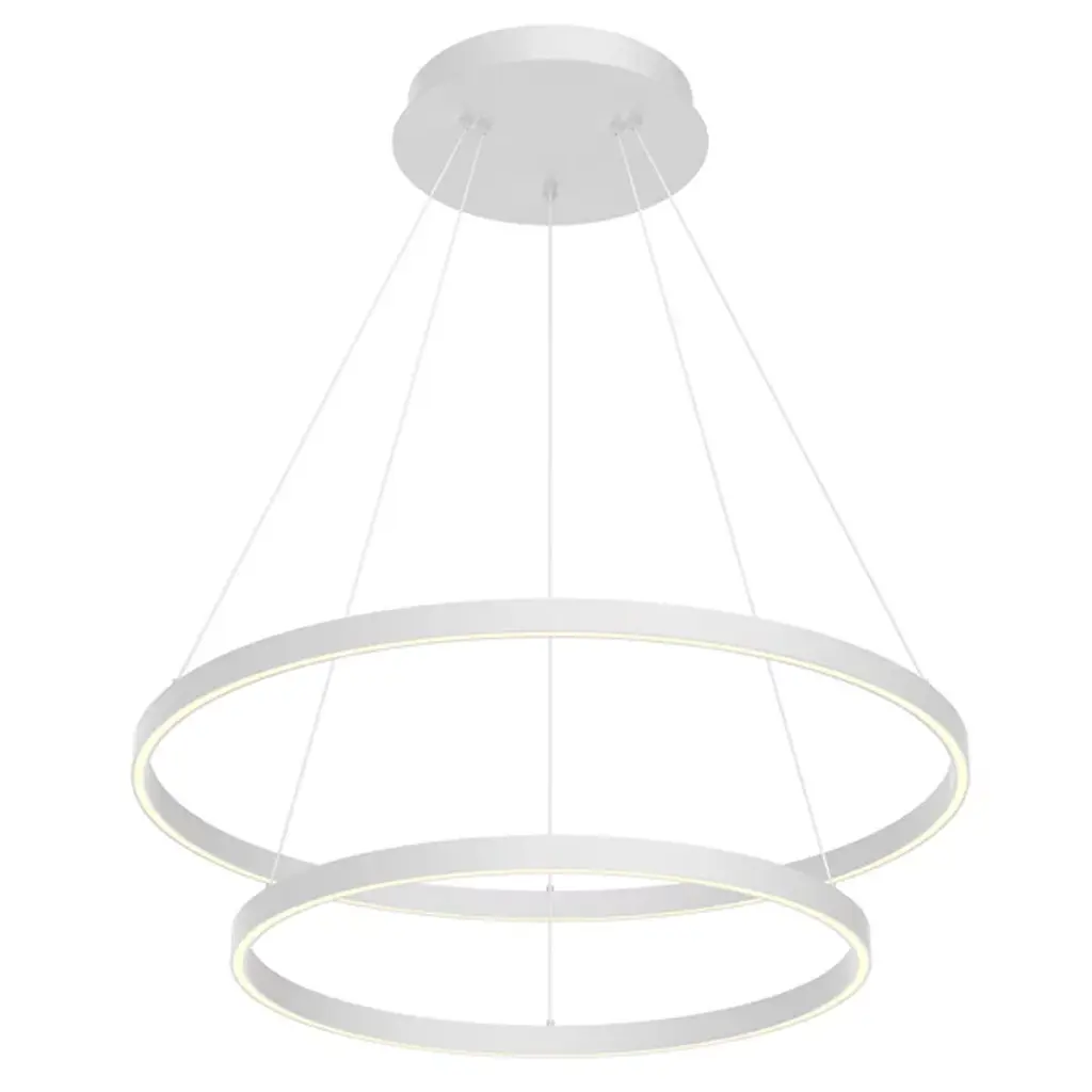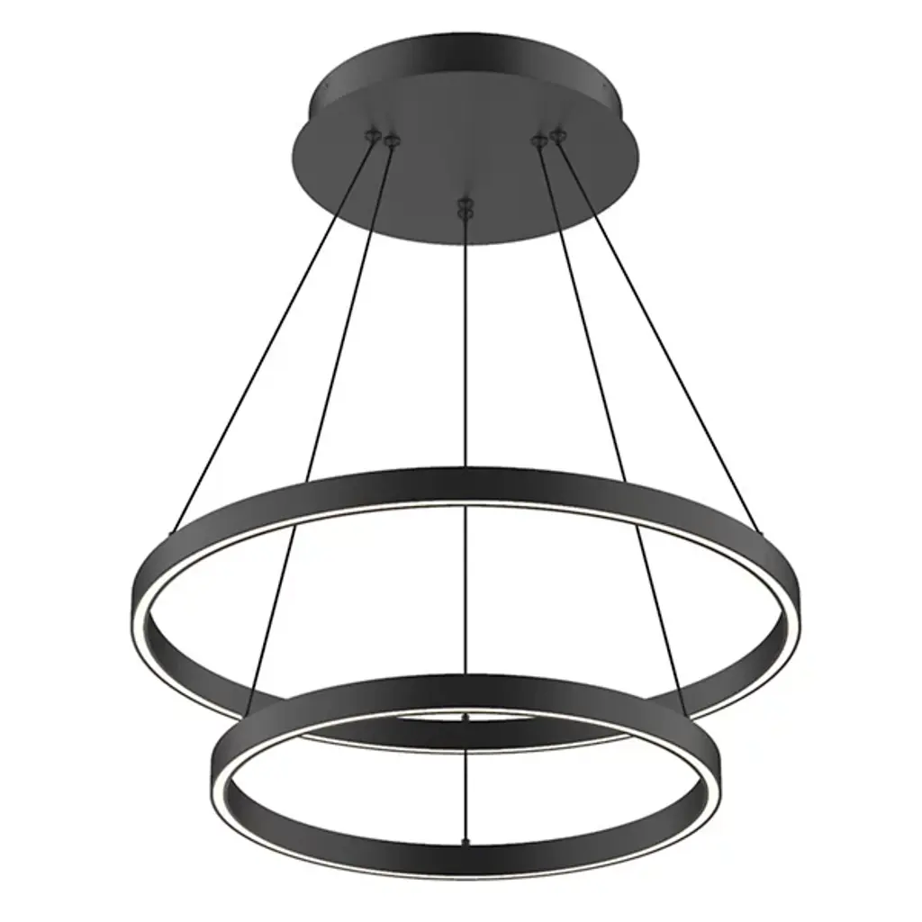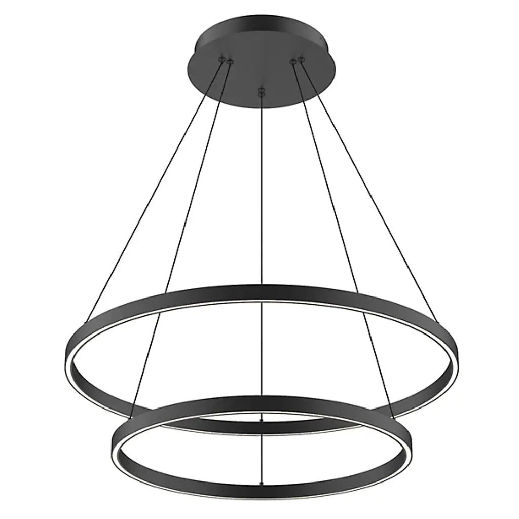 Bring layered elegance to inside ceilings with the Cerchio Up and Downlight LED Chandelier from Kuzco Lighting. A two-tiered contemporary design fashioned from smooth aluminum, it descends from a stepped circular canopy, sending down slim cables to two ring housings, a larger upper one and a smaller lower ring. LED lamping is set inside each ring, gentled by a translucent diffuser set into its base. This open configuration is excellent for high ceilings and transforms bright light from the strong, energy-friendly lamping into a generous glow that reflects off of the smooth metal structure around it.