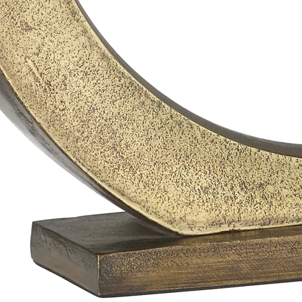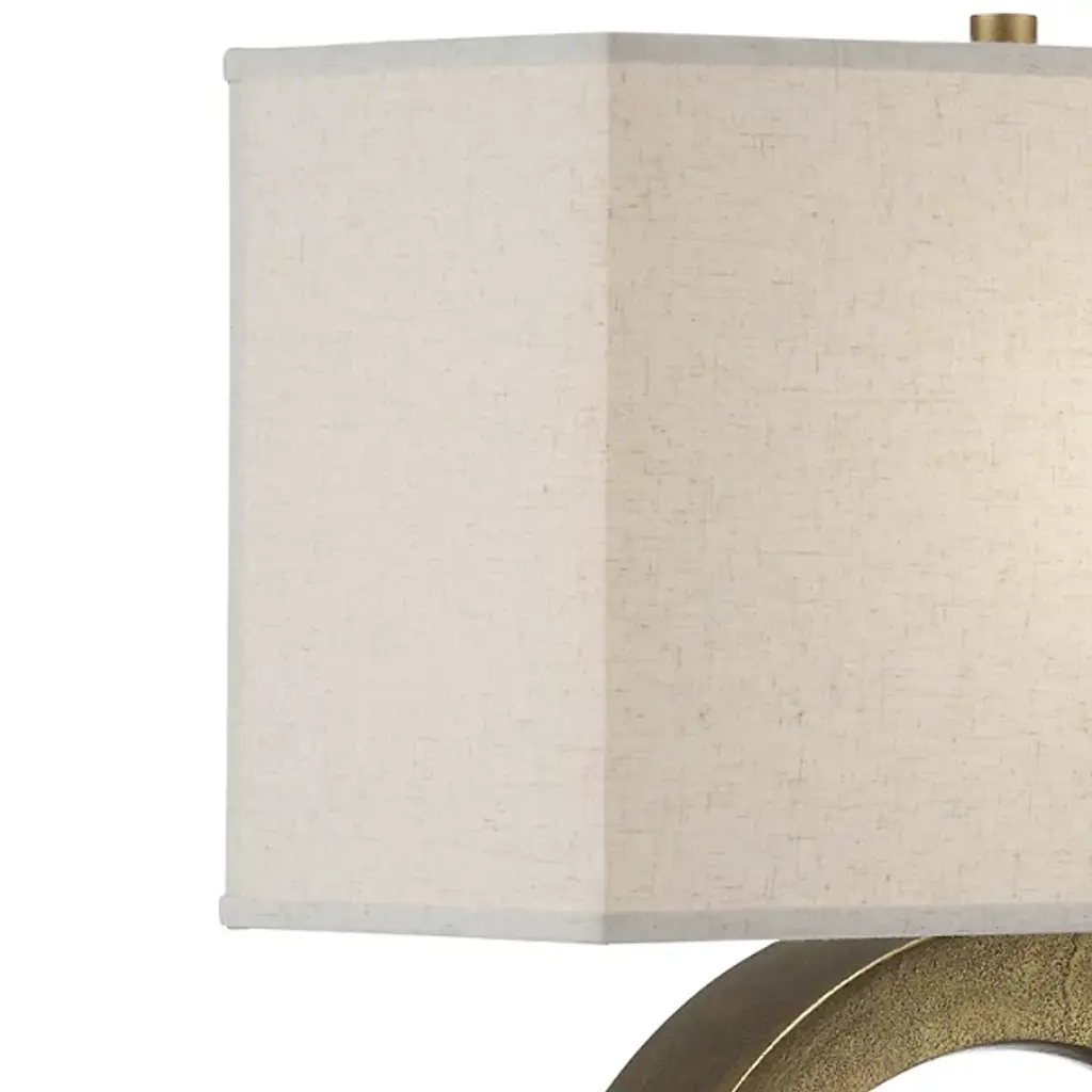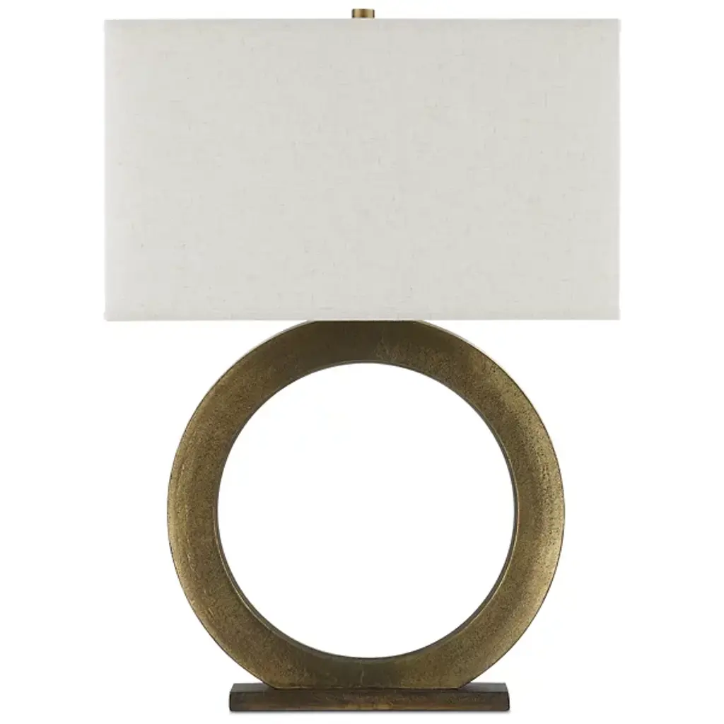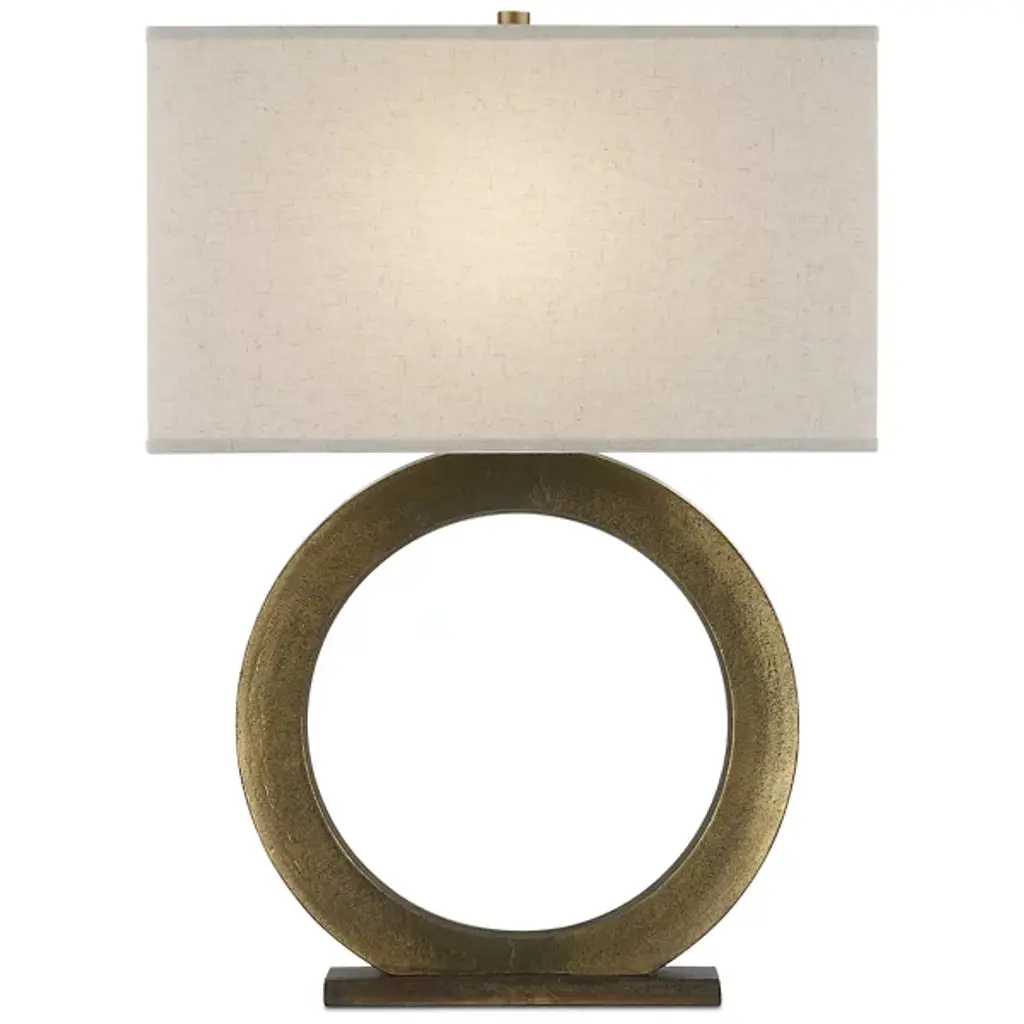 The Cercle Table Lamp from Currey & Company is a sculptural piece crafted from cast aluminum with a deep gold finish, reflecting the playful form implied by its French name. The elegant ring structure is mounted on a minimal rectangular base, complete with a dark brass antique finish. A contrasting rectangular shade of off-white linen features refined trim on the top and bottom edges, perfectly scaled to offset the lamp's open form.