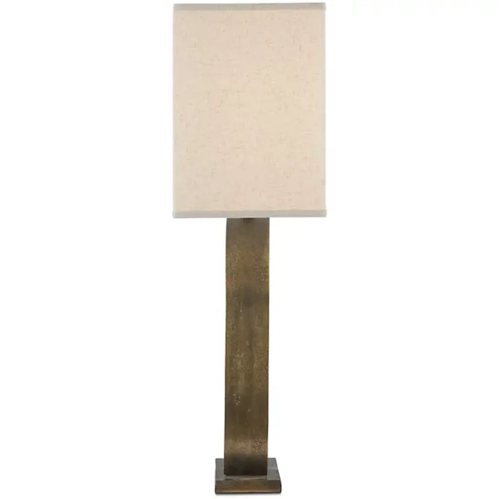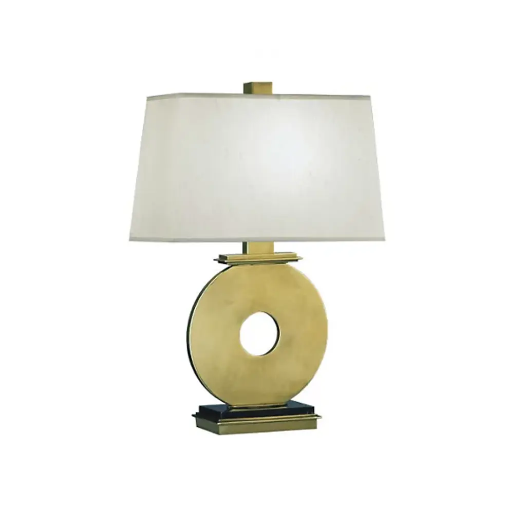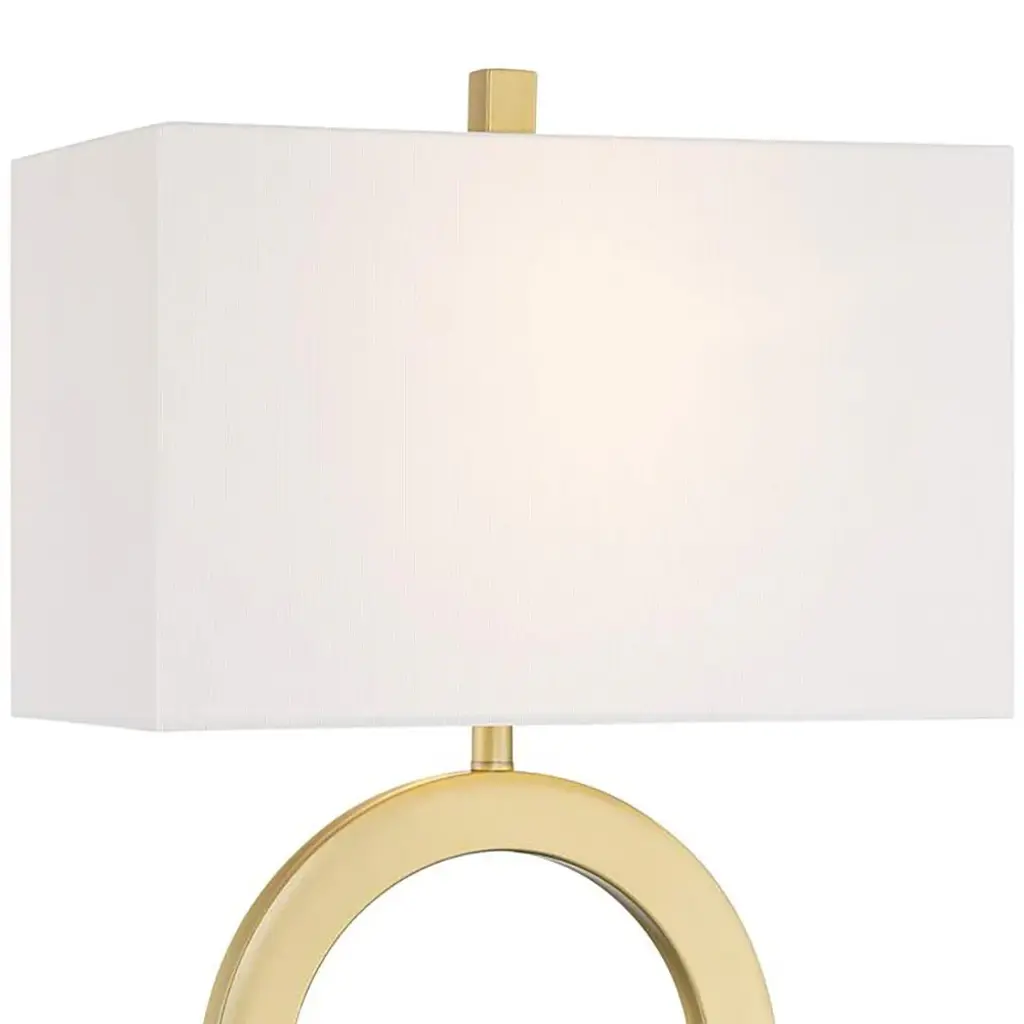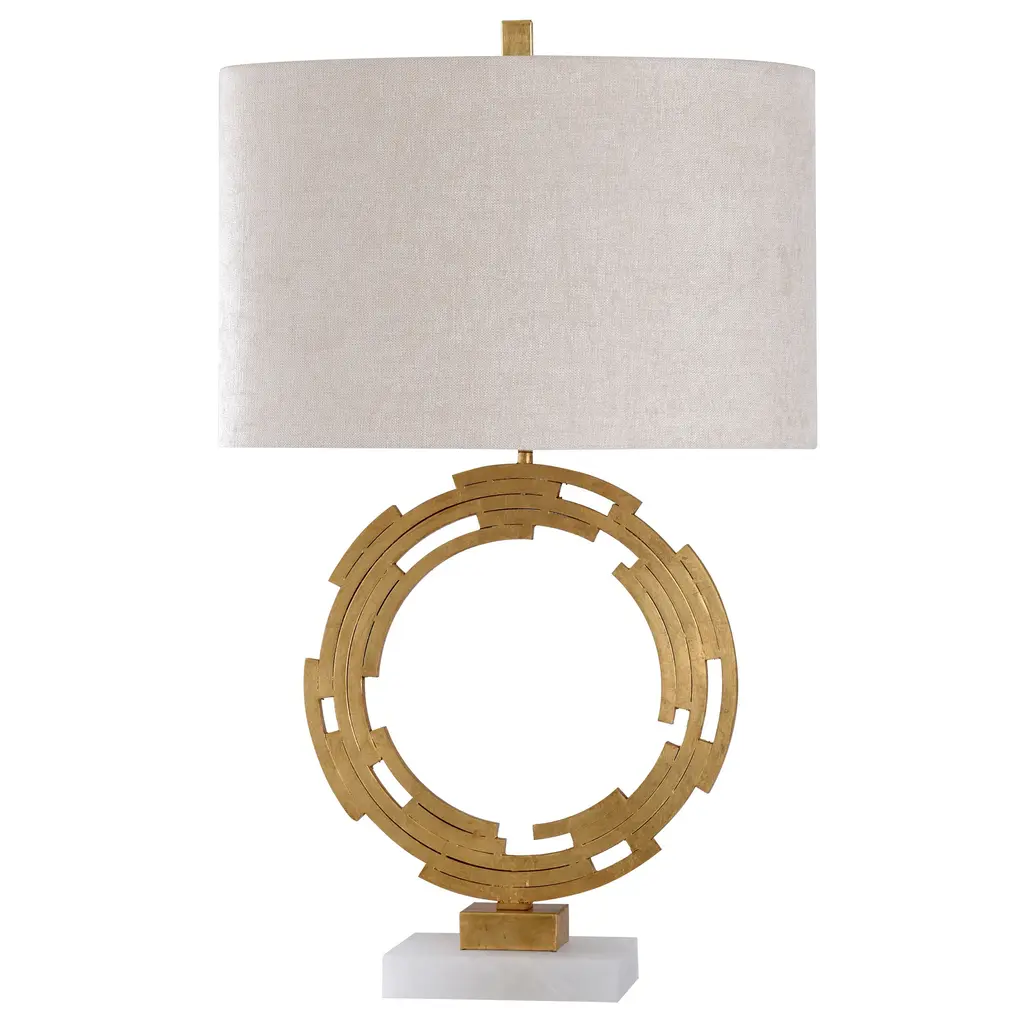 The Cercle Table Lamp from Currey & Company is a sculptural piece crafted from cast aluminum with a deep gold finish, reflecting the playful form implied by its French name. The elegant ring structure is mounted on a minimal rectangular base, complete with a dark brass antique finish. A contrasting rectangular shade of off-white linen features refined trim on the top and bottom edges, perfectly scaled to offset the lamp's open form.