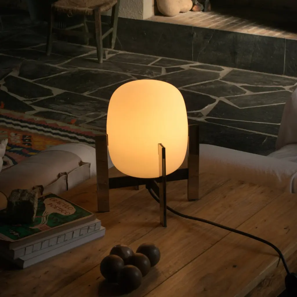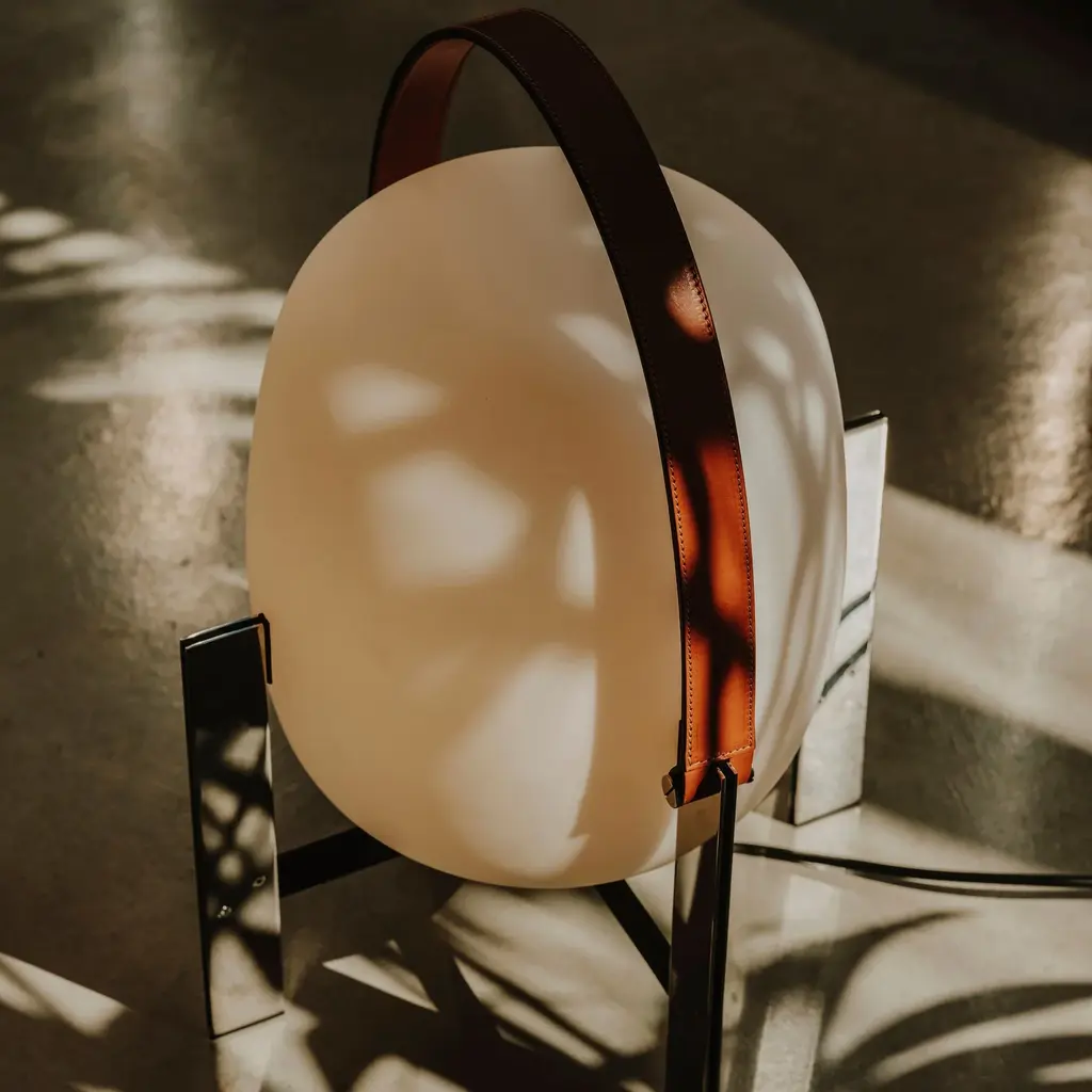 Cesta Metálica is a sleekly updated version of designer Miguel Milá's globe table lamp cradled in a footed stand. In this rendition, the base is fashioned in gleaming stainless steel, available with or without the natural color leather handle. The opal glass lantern is hand-produced by European craftsmen, using traditional mouth-blowing techniques, and brings a diffused glow of dimmable LED illumination in Santa & Cole's eye-catching take on a modernist classic.
