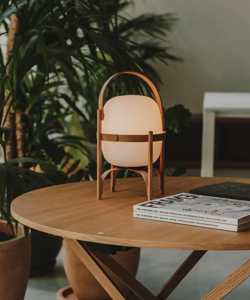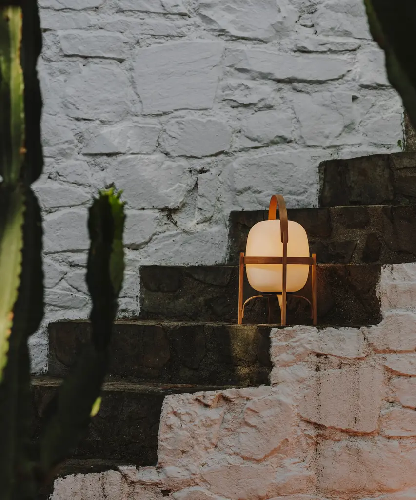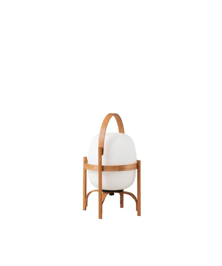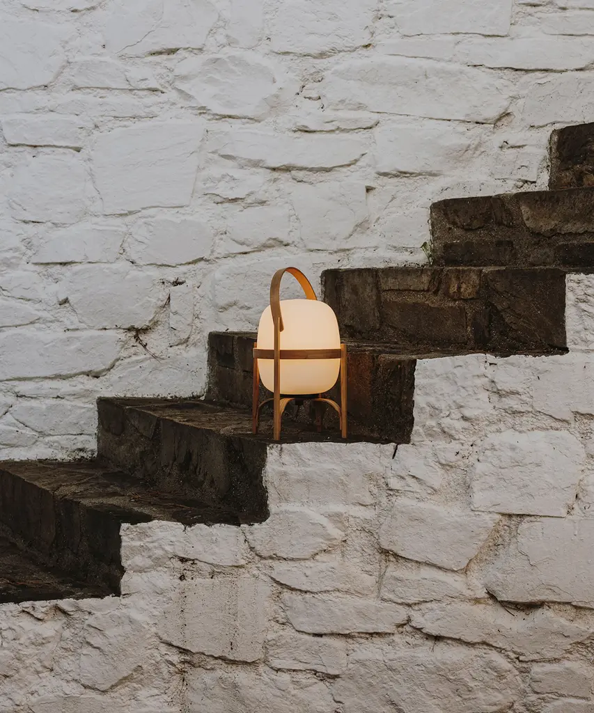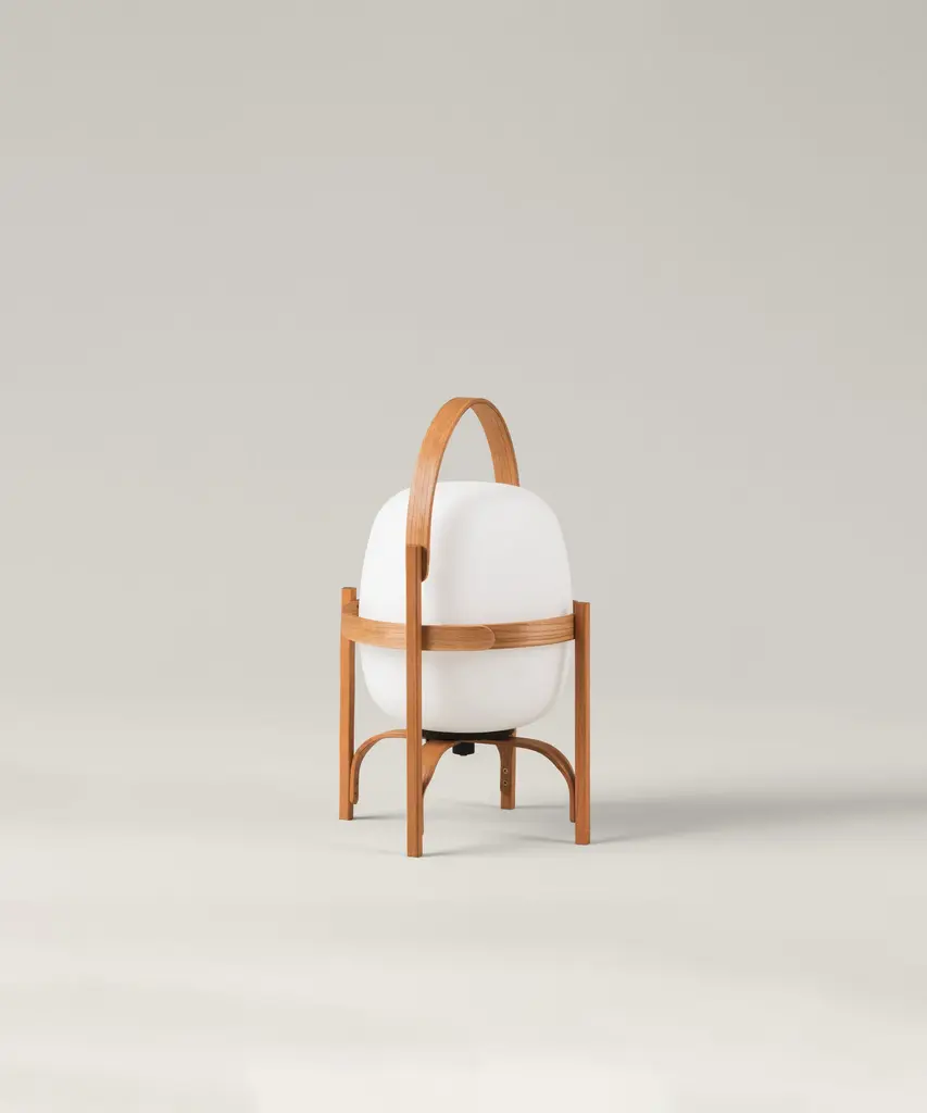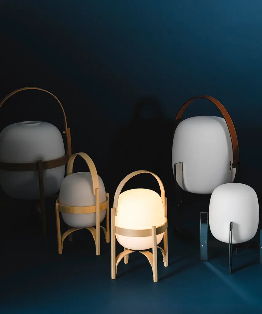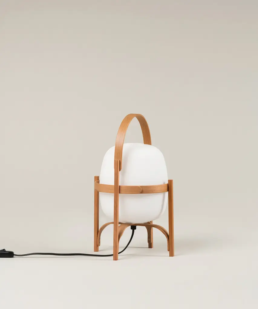 Cestita Batería is the new member of the Cesta family: a portable, cordless version. As with all of Milás objects, this version champions industrial craftsmanship, by combining functionalism and the legacy of local artisan creation. Keeping with the family's warmth and spirit, it features an opal glass shade supported by a beautiful cherry wooden structure. It is produced and assembled manually by European craftsmen, using traditional, steam bending techniques for the wood, and glassblowing techniques for its opal shade. Produced by the Barcelona-based lighting purveyor, Santa & Cole.