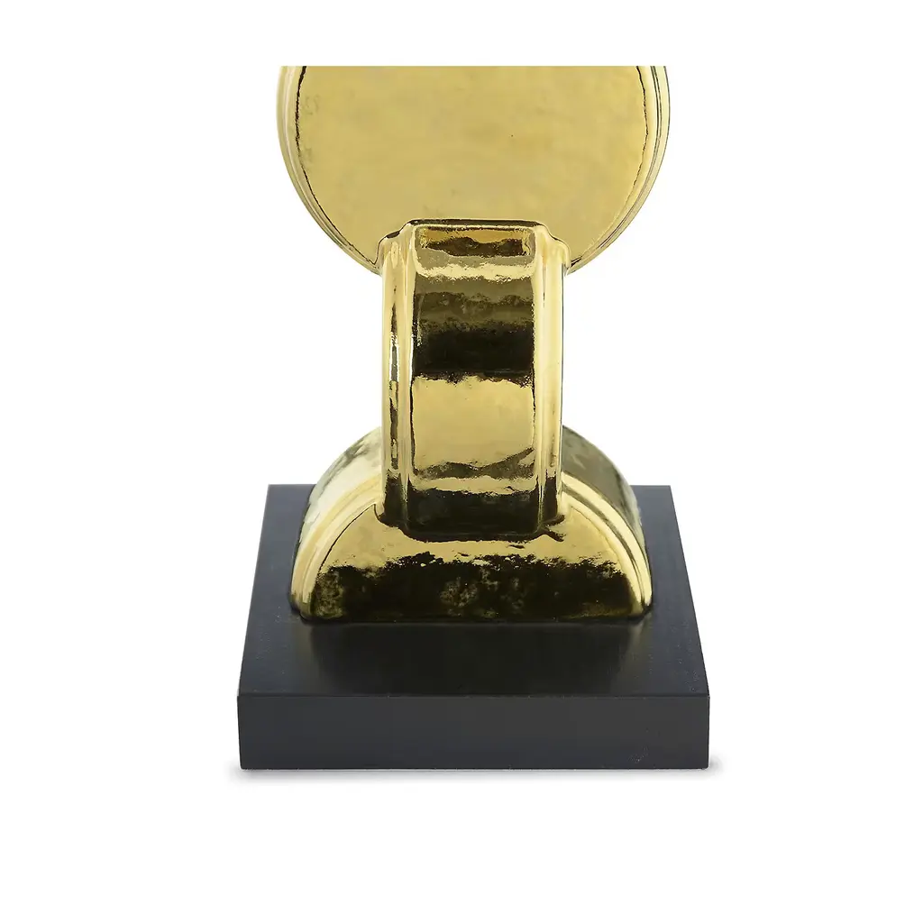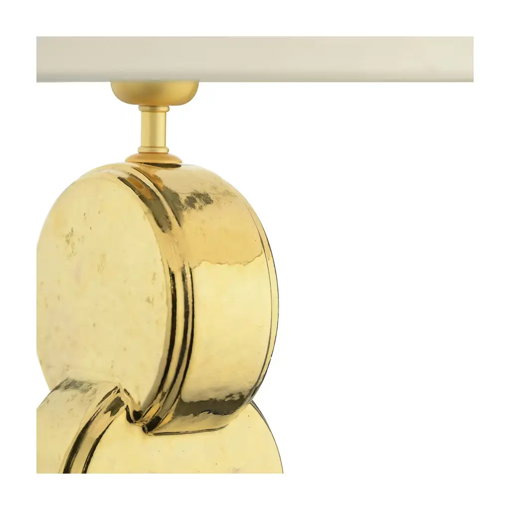 Entirely made of ceramics, the structure of this exquisite table lamp rests on a ceramic square base with a black finish that strikingly complements the golden glow of the vertical element made of a series of circular element connected to each other like in an endless chain. The fabric shade is included. Both colors and finishes can be changed. Please ask the concierge for details.