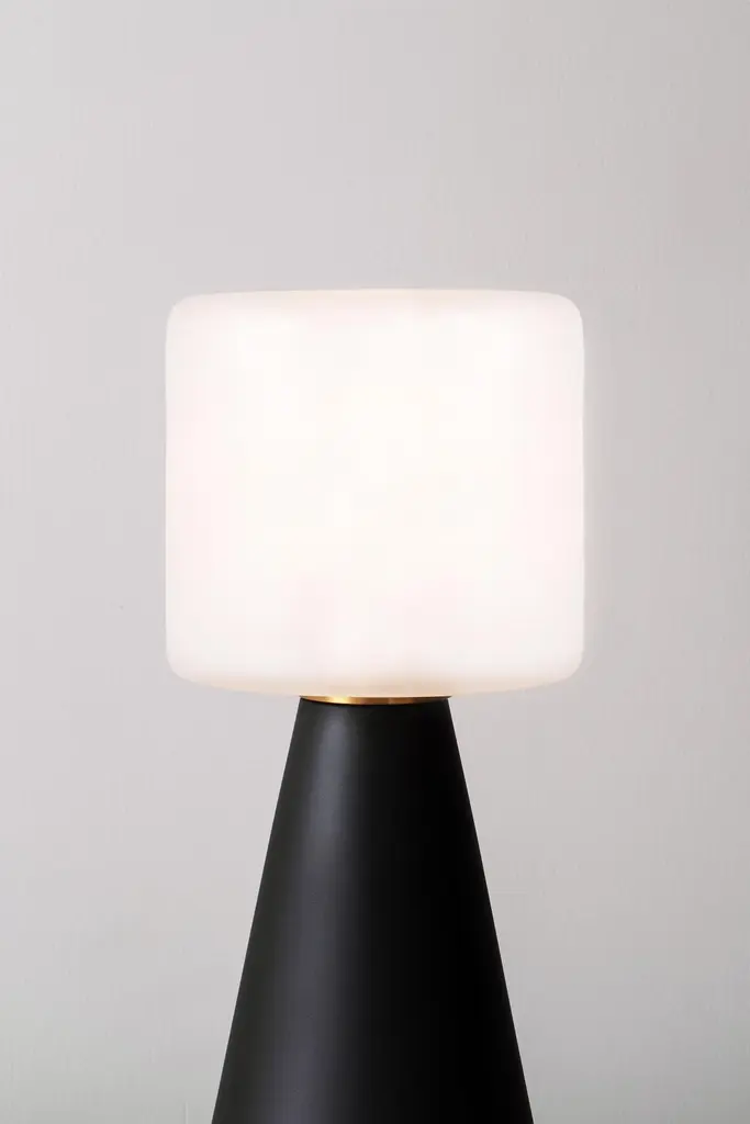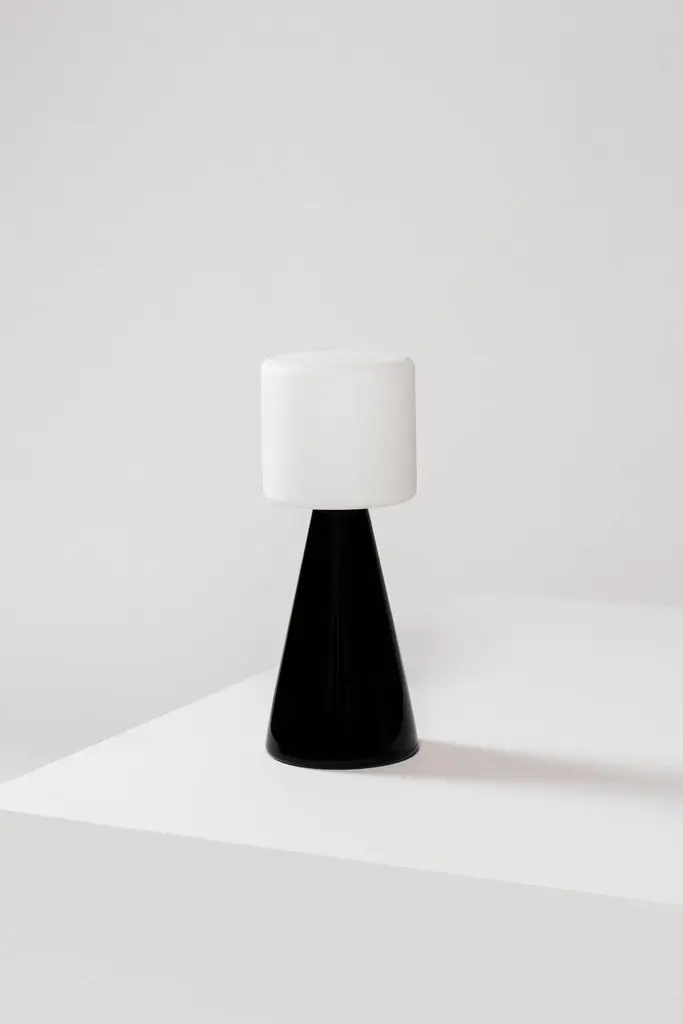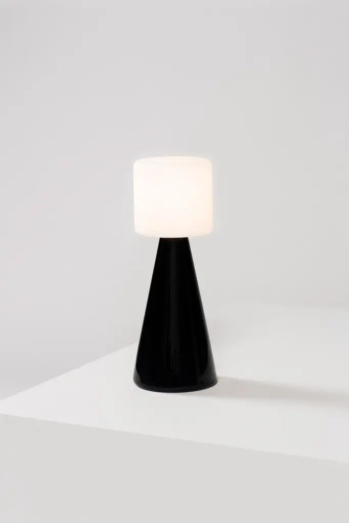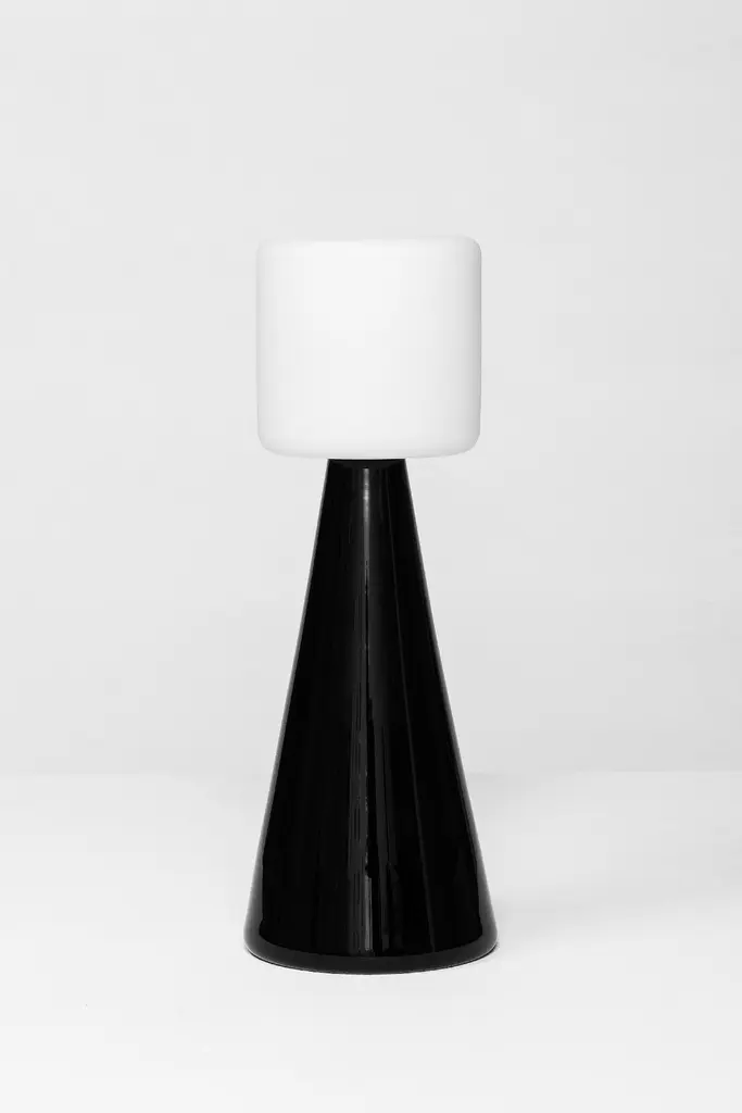 The Champion is made of handblown glass. The shade is an opal or clear sandblasted glass. The base is a black or sandblasted black glass. The lamp has a candelabra 60 w socket, a black cloth cord and hand switch.Measures: 17 in. tall 5 in. diameterHand blown in LAUL listed.