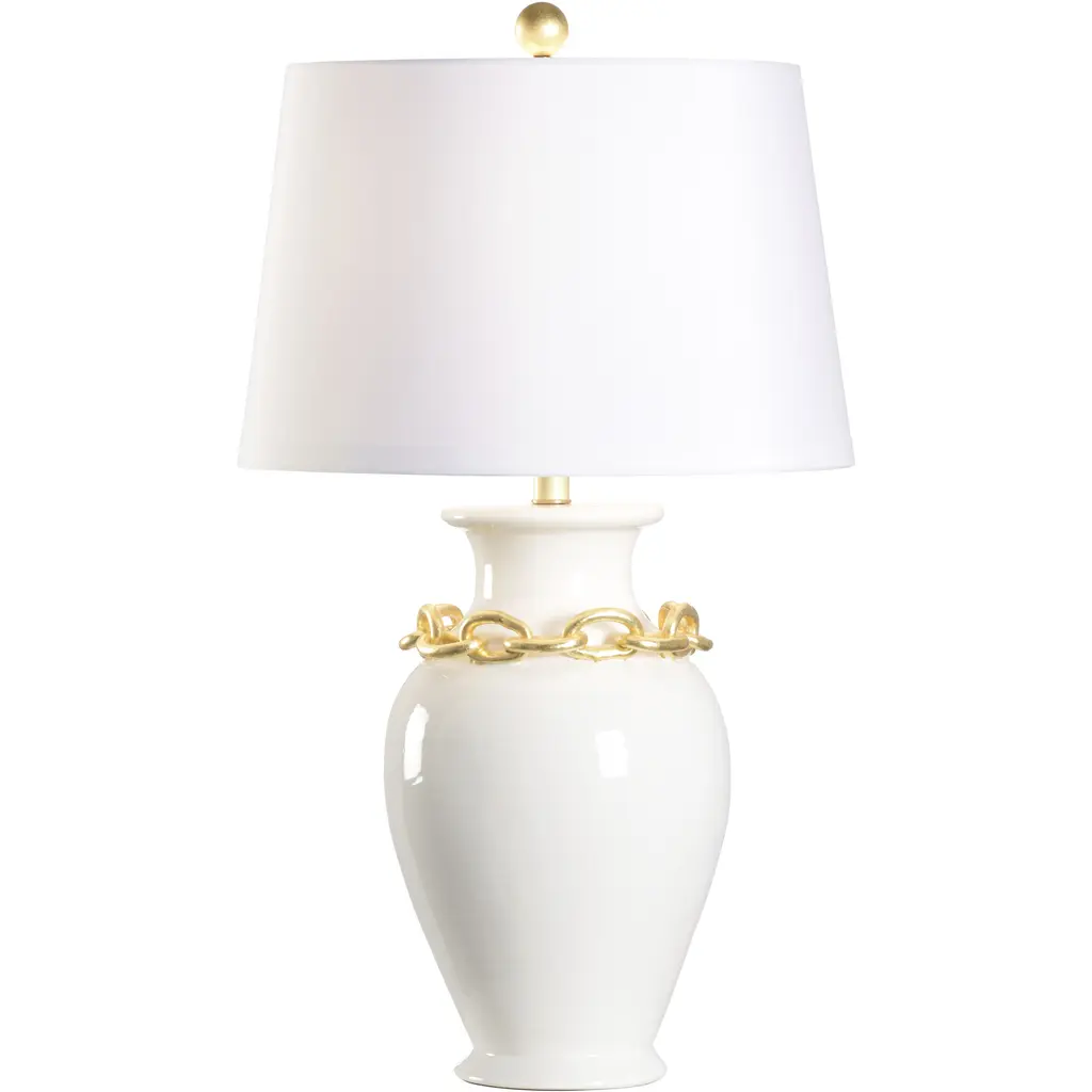 High fashion represents in the casual yet elegant design of the Channel table lamp; an excellent choice for sophisticated spaces. Crafted of ceramic, its layered cylindrical body is anchored with showy gold leaf chain accents and topped with a tasteful white linen drum shade.