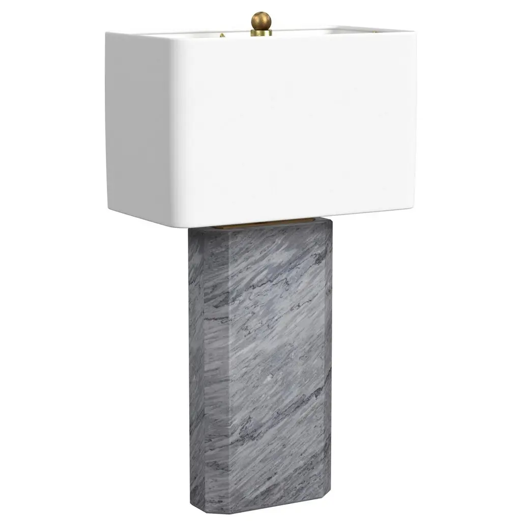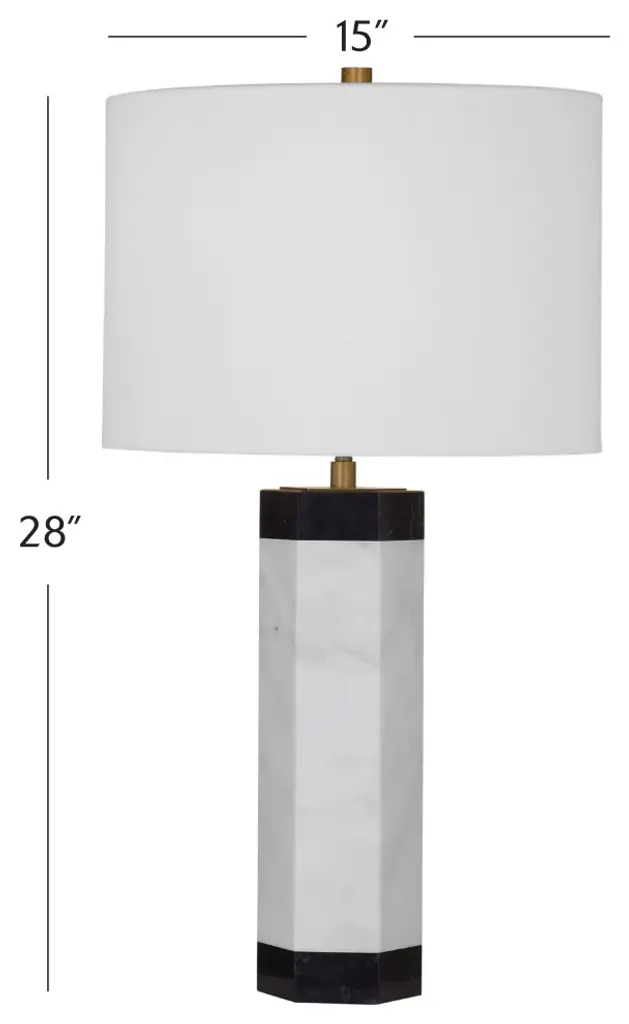 Discover the allure of the Charlie Table Lamp, a contemporary gem crafted with black and white marble. The octagonal-shaped lamp body adds a modern twist to the silhouette, complemented by a drum-shaped shade in elegant white linen. Enjoy adjustable illumination with the 3-way turn knob light switch, and with a generous 6-inch lamp cord, placement becomes effortless. Elevate your space with this modern marvel that seamlessly blends style and functionality.Features:Features contemporary style with a contrasting black and white marble lamp bodyThe drum shaped lamp shade is constructed with white linenFeatures a 3 way turn knob light switchLamp cord measures 6 inches, allowing for easy placementBulb type a required, not includedEasy assembly - just attach harp, finial and shadeFor over a century, Bassett Mirror has been synonymous with style and quality, transforming homes with its sophisticated and timeless designs. With a wide-ranging collection of furniture, lighting, mirrors, and art, Bassett Mirror seamlessly blends modern style with classic appeal. From rustic modern to luxe glam, each piece is thoughtfully crafted to inspire and elevate any space. Committed to exceptional value and customer care, Bassett Mirror makes it easy for homeowners to create beautiful, personalized interiors with confidence.