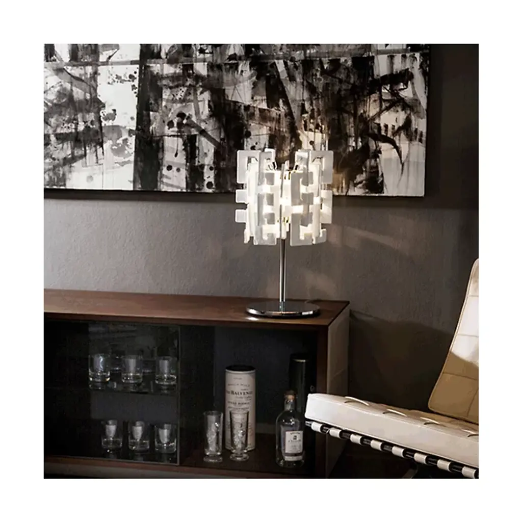 Inspired by the letter C, the Charlie Table Lamp from Mazzega 1946 imagines the third letter in the alphabet in handcrafted glass, interlocked for a staggering silhouette. With works included in the MoMA, storied designer Carlo Nason highlights the tradition of glass-making from his native Murano, Italy with a contemporary visual language. The table lamp presents contemporary shapes that come together with a retro silhouette. Handmade by glass artists, textured C-shape elements hook onto each other to create a dynamic shade. The multi-faceted shade appears to float thanks to a slender metal column and a low-profile base. When turned on, the light creates a graphic silhouette filled with perpendicular angles. The light radiates out as a seductive ambient glow.