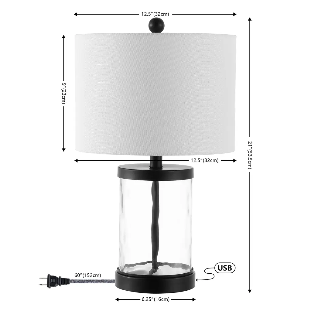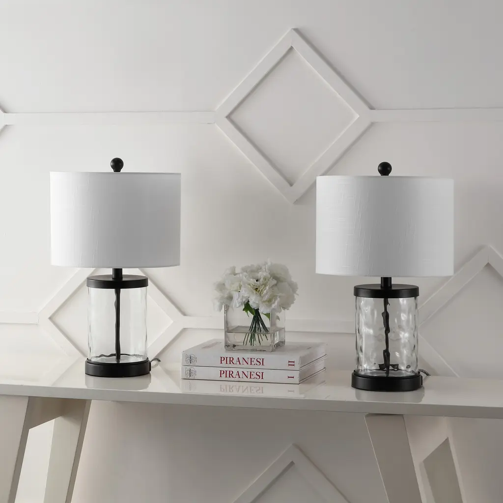 Elevate any bedroom or living room with our industrial inspired table lamp. The cylindrical, dimple textured glass base is complemented by a glam linen shade. The lamp, which comes in a set of two, will add a touch of modern design to any room.Features:Dimensions:About us:You see a lamp.We see a decorative work of art.A perfectly curved shade casts a dramatic shadow on a floor. A silk cord you never want to hide. Compatible with LED lightbulbs: as easy on the environment as they are on the eyes. The JONATHAN Y Lighting collection considers every detail from impeccably sourced materials to designer styling. And our prices are so attractive, we've transformed a functional necessity into a fashion accessory.JONATHAN Y Lighting - a fashion revolution in home decor.