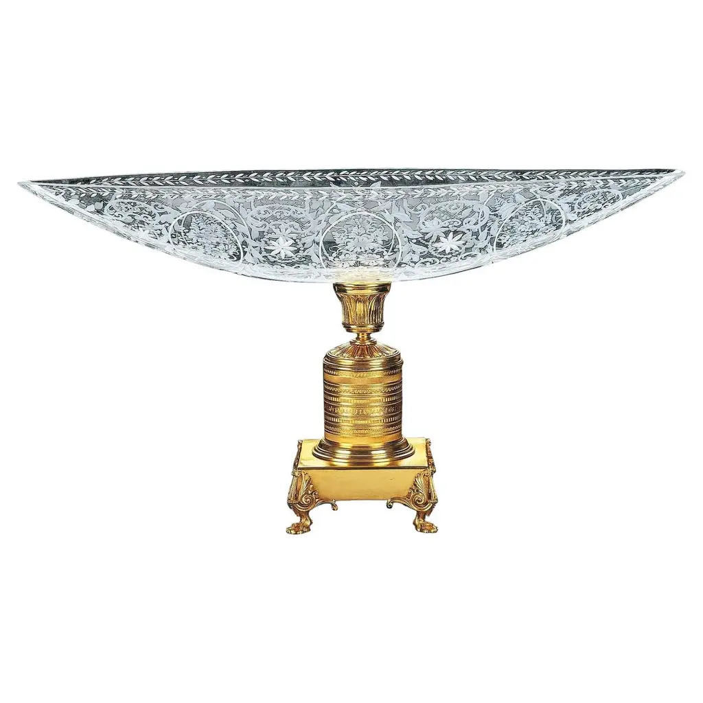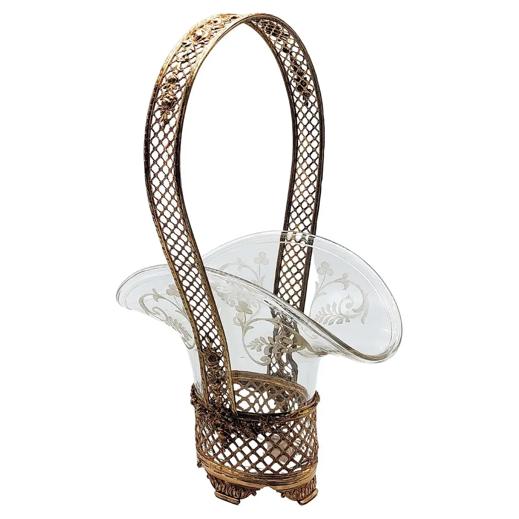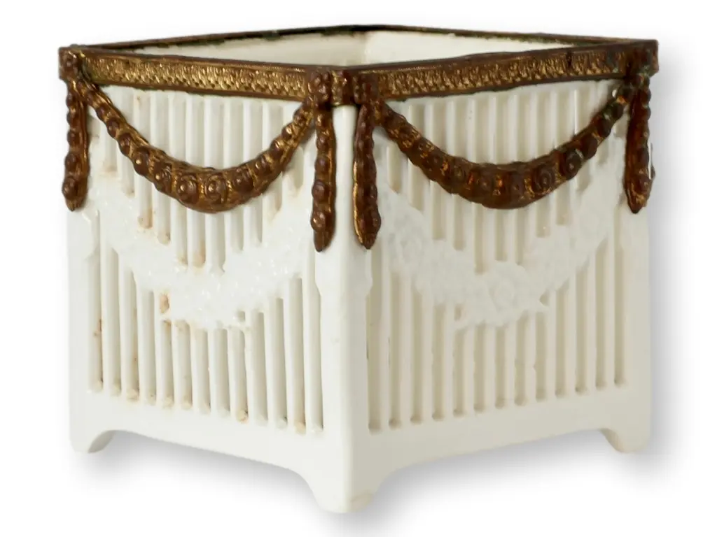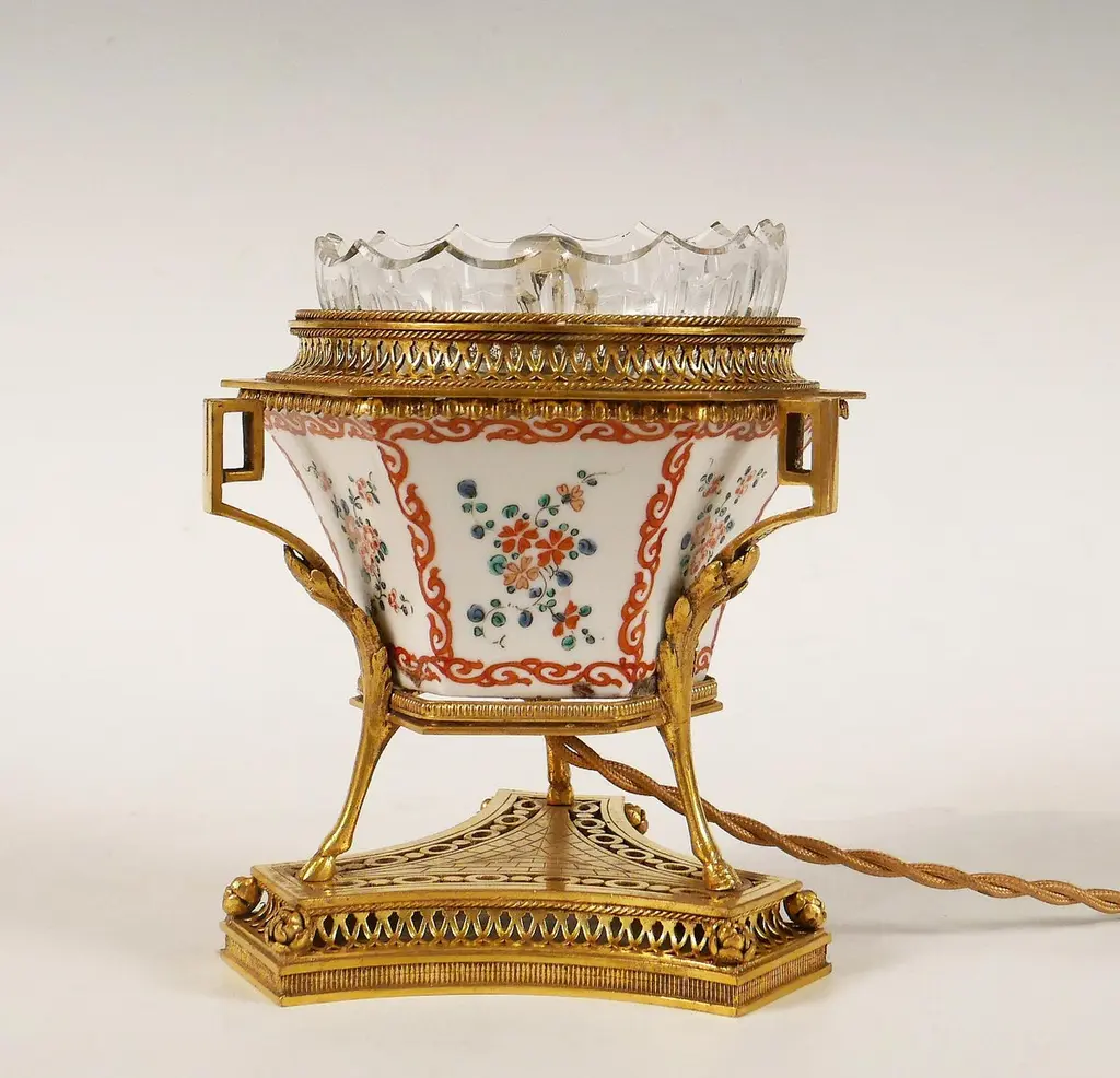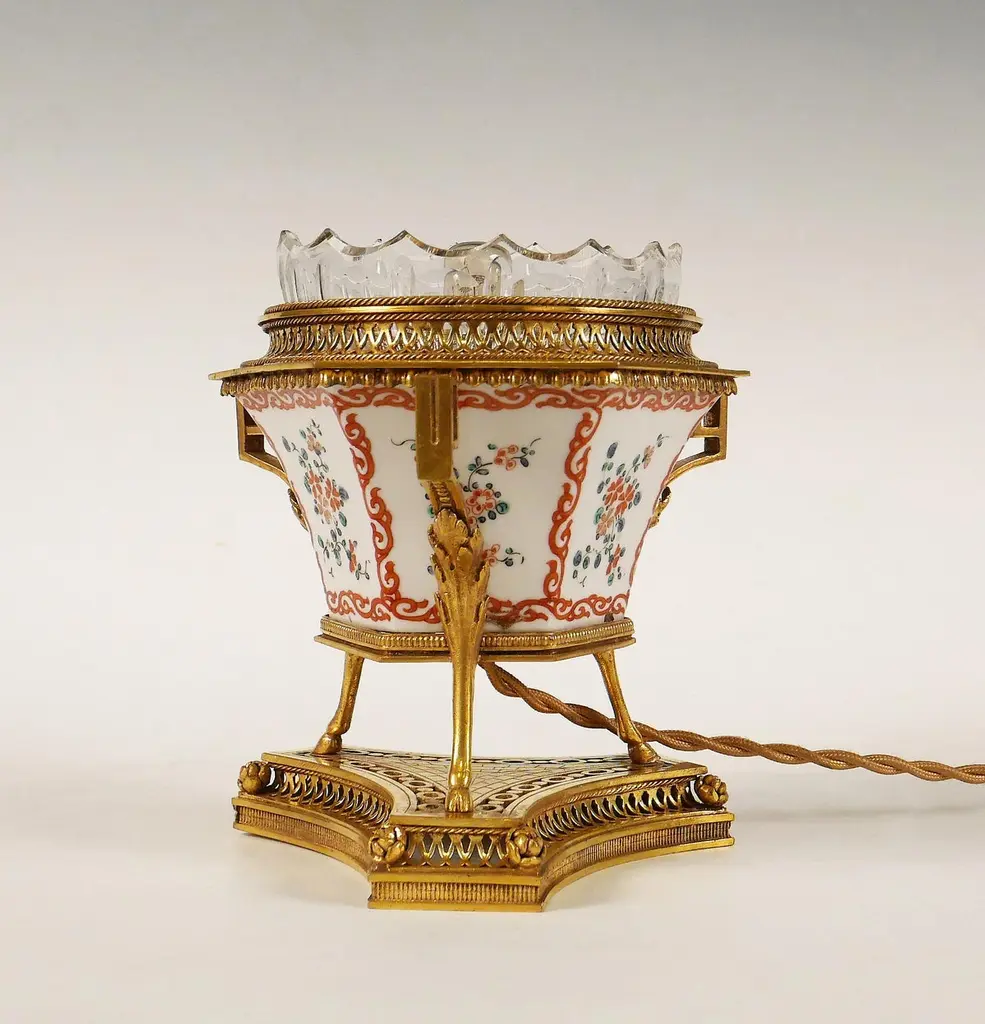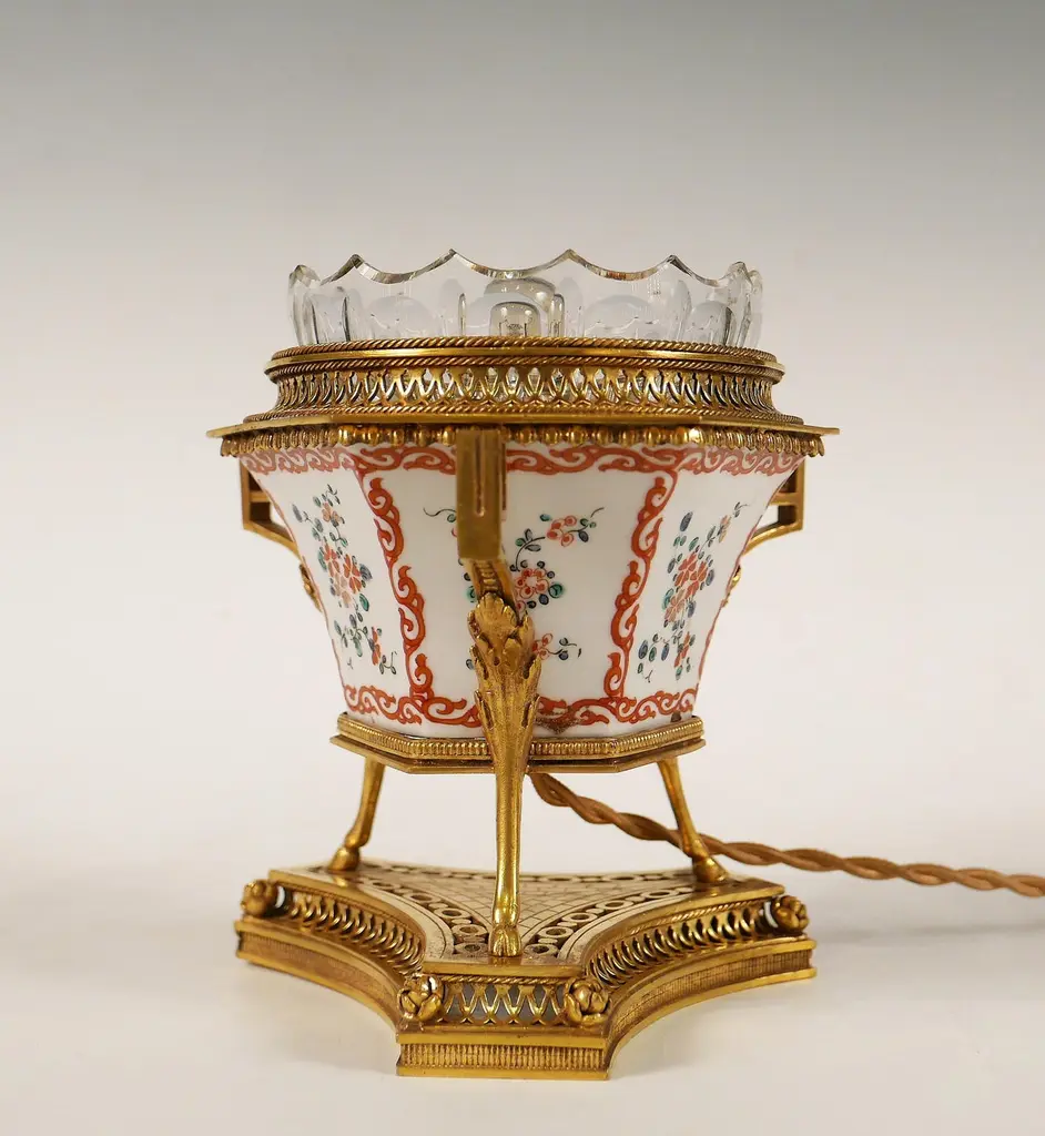 Height : 15 cm (5,9 in.) ; Diam. : 15 cm (5,9 in.) ; Base width : 12 cm (4,7 in.)Charming hexagonal night light in painted porcelain decorated with flowers, surmounted by an openwork gallery in gilded bronze containing a cut crystal corolla. Bordered by three Greek-shaped handles ending in hooves, it rests on an openwork tripartite base ending in rosebuds.Biography“L’Escalier de Cristal”, an old and famous Parisian firm, specialized in glass products and ceramics but also suggested furniture and bronze sculptures. It was led from 1885 to 1923 by Emile Pannier’s sons, who gave the name of Pannier Frères to the society, located at the corner of Scribe street and Auber street, next to the new built Paris Opera house. Their Japanese style creations were among many others much appreciated by the critics and the public. They were awarded many medals at various exhibitions, such as the Gold medal at the 1900 Paris Universal Exhibition.Lots of artists participated in that world success, such as Emile Gallé, who gave to Pannier Frères the exclusive rights of some of his models, or François-Eugène Rousseau, who designed many vases and gave the model of his successful Japanese style dining-set as well. This set was made by the Creil et Montereau Manufacture. In the Japanese style furniture branch, many famous makers such as Majorelle from Nancy, Edouard Lièvre or Gabriel Viardot worked for Pannier Frères. Some pieces are to be seen in the greatest museums: the Ermitage in Saint-Petersburg, the Orsay Museum in Paris, the Corning Museum of Glass in New York. The Maison “L’Escalier de Cristal” was sometimes the exclusive owner of the models and then those pieces were just signed by “L’Escalier de Cristal” or sometimes beside the artist signature. But “L’Escalier de Cristal” was also very creative, completing pieces with superb gilded bronzes, glass or enameled panels and often including authentic Japanese or Chinese elements.