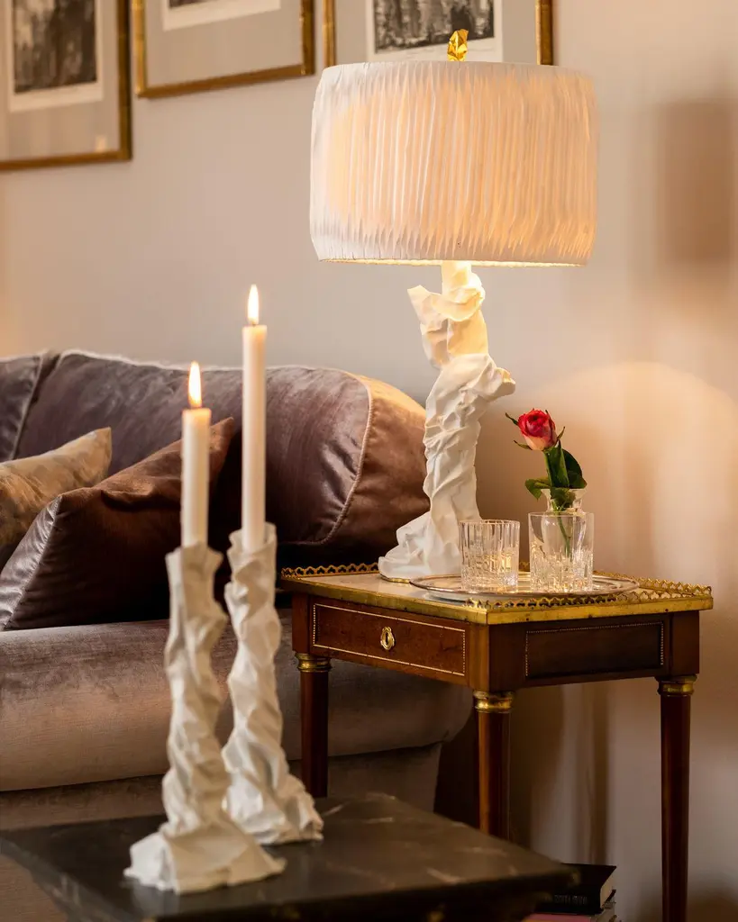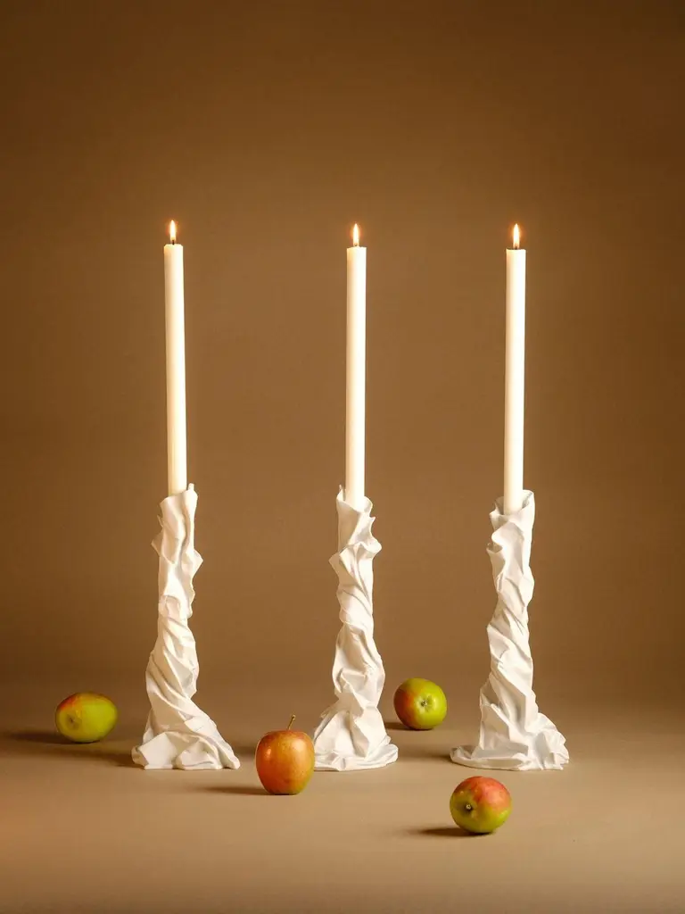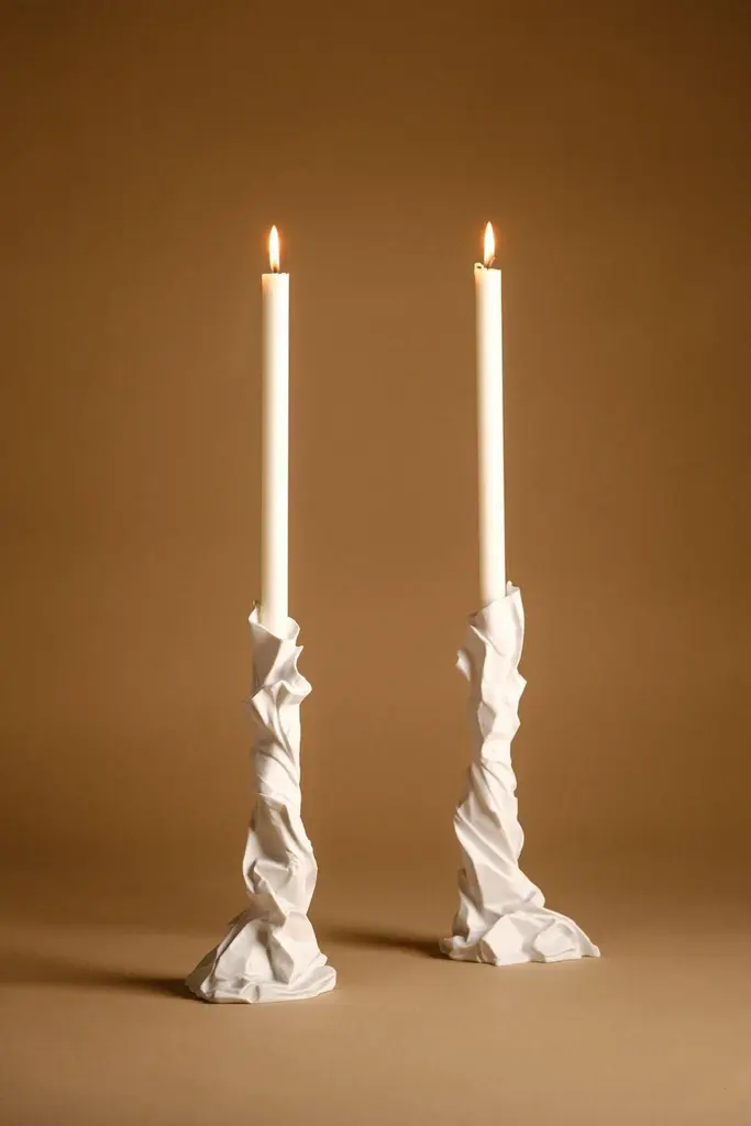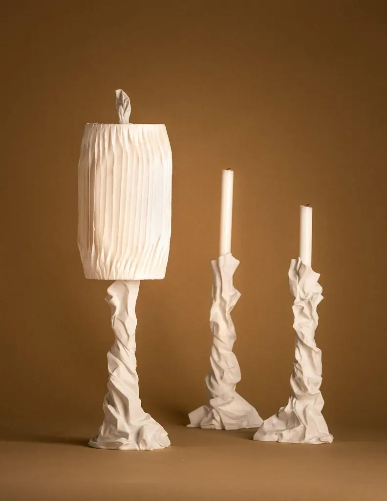 Charta candlestick by Studio PalatinDimensions: H 33.5 x D 16 cmMaterials: biscuit porcelain.The artist’s inspiration for the Charta Alba Collection came from a series of sculptures formed from brown wrapping paper salvaged from an Amazon shipping box. The objective was to create something new out of waste material. The sculptures were created by using a single piece of paper which the artist wound around a vertical axis to create each shape. The wrinkles of the paper created a perfect foundation for the play of light and shadow. The artist, Barbara Palatin-Doyle, wanted to visually transform the supple, brown, low-grade paper into a solid, white, high-end material that would surprise the viewer. Porcelain was the ideal material; revered through the centuries, it had been nicknamed “White Gold” in the 18th century. Charta Alba means “white paper “- a pun that refers to the color of porcelain and the original shape in paper form.Charta Alba I & II were designed as a Ying /Yang pair, but can equally be used as a matched pair or as a single table lamp. The special charm of the Charta Alba lamps is created by the combination of their sculpted white porcelain bodies and the romantic diffused light filtered through the handmade Japanese Hosho paper shades. The artist chose the Vienna Augarten Porcelain Manufactory as a collaborative partner. The company is 300 years old and is the second oldest porcelain manufactory in Europe. The quality of their porcelain, especially the “biscuit”, is exceedingly high which is especially important as the unglazed finish does not hide any flaws.Barbara Palatin-Doyle is an artist, a docent for the Decorative Arts Department at the Metropolitan Museum of Art, and the founder of Studio Palatin. Born and bred in Vienna, the artist lives and works between her home town and New York. She specializes in handcrafted, sculptural lighting in limited editions. Her passions are table lamps and candlesticks. As an artist, she incorporates materials and techniques reflecting the exquisite craftsmanship of the 17th and 18th century in contemporary design, combining art with functionality.