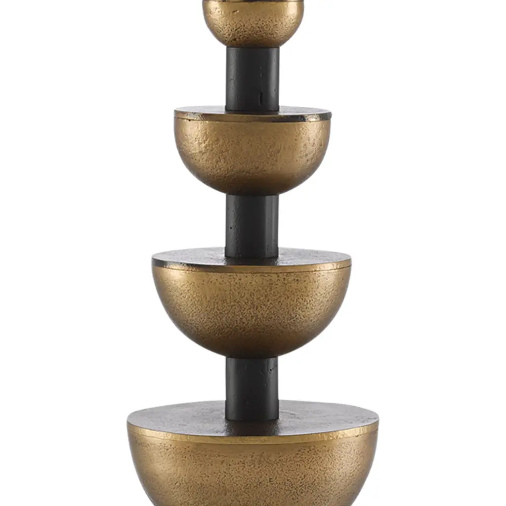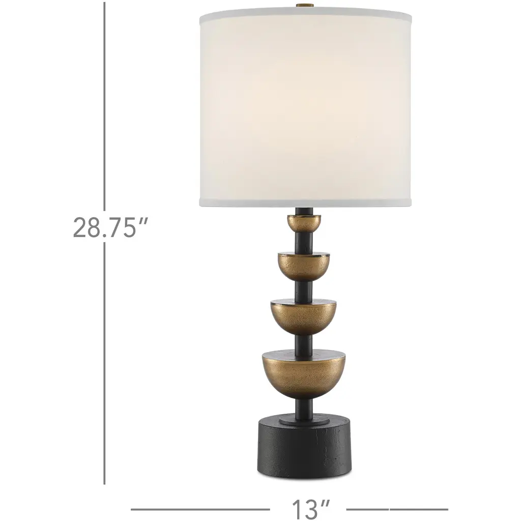 A study in contrasts, our Chastain Table Lamp fuses round shapes with flat planes and gleaming surfaces with matte darkness. Made of cast aluminum that we have treated to a mix of antique brass and black finishes, the lamp holds halved orbs set along the stem that grow as they flow downward. Topping this complex composition is an off-white shantung shade.