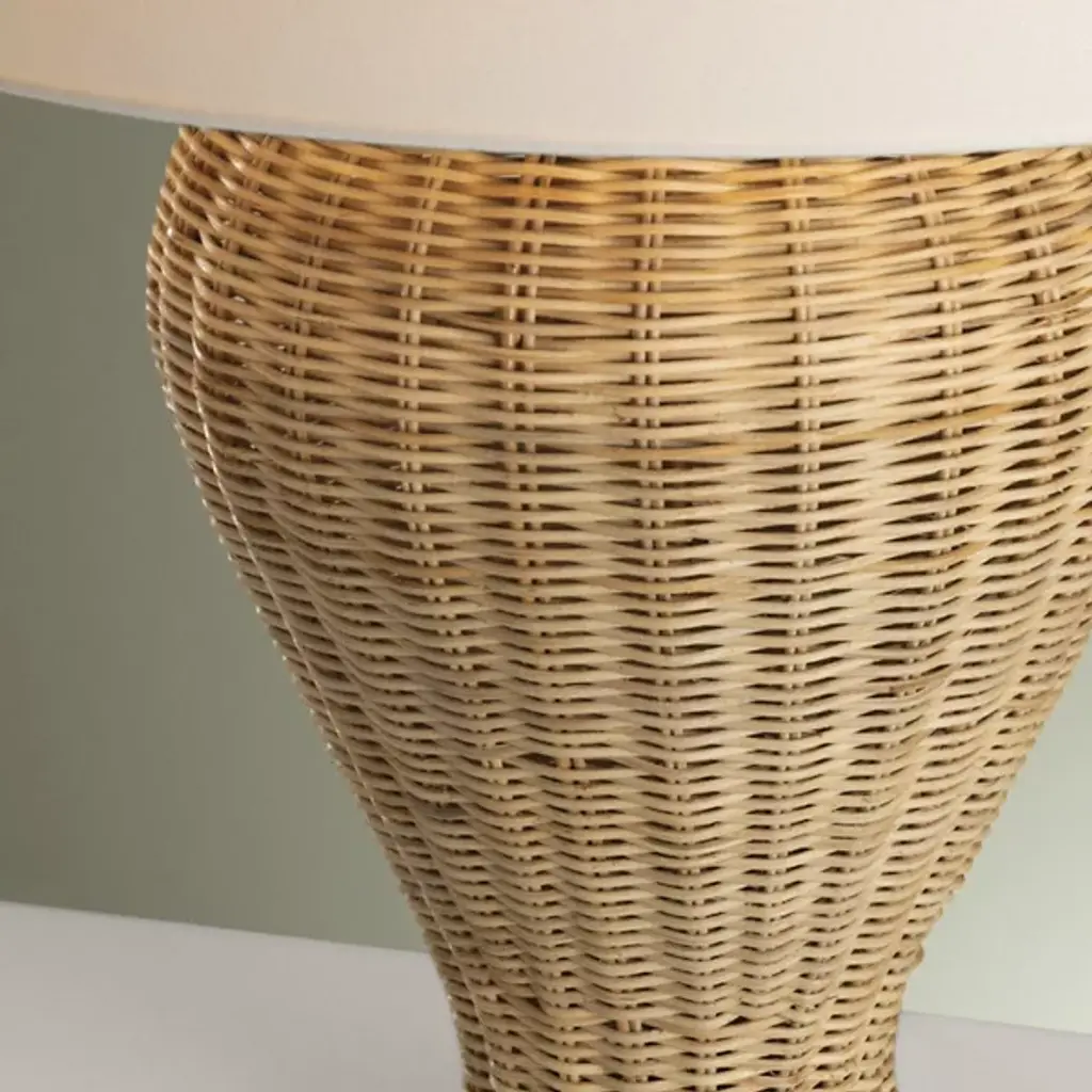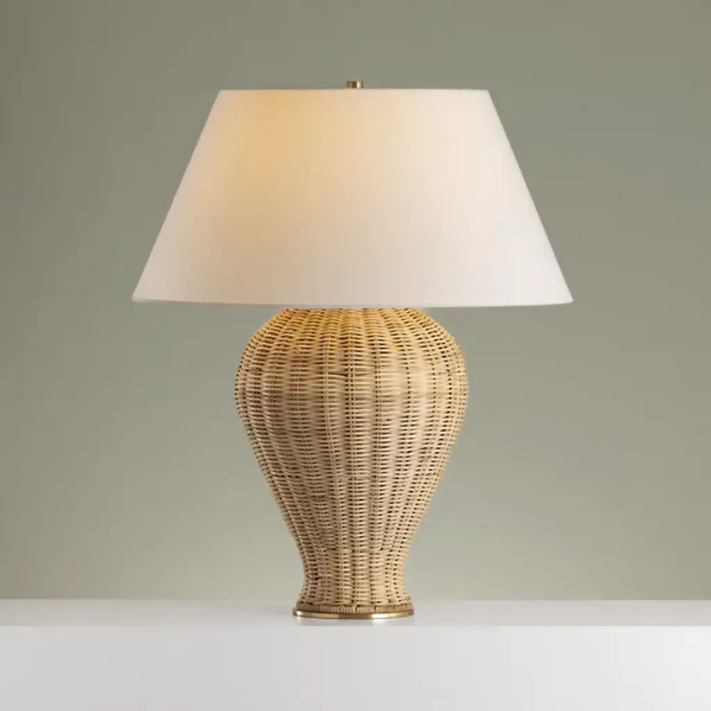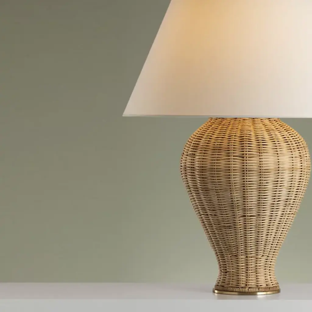 The Chatsworth Table Lamp from Hudson Valley Lighting shows a wicker base that swells generously before tapering down to a narrow foot. Designed by Mark D. Sikes, the lamp’s natural woven materials bring texture and warmth that manufactured pieces simply can't match, while a brass cuff at the neck adds just enough metallic accent to feel polished. An off-white linen shade keeps things classic without becoming predictable. This combination of natural materials and thoughtful proportions brings genuine character to bedside tables, console surfaces, or any spot that needs both light and personality.