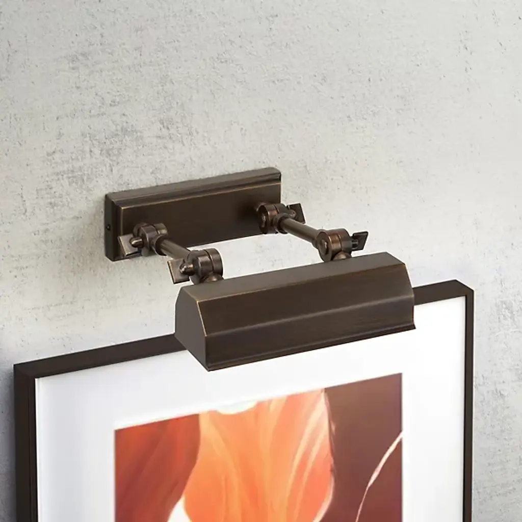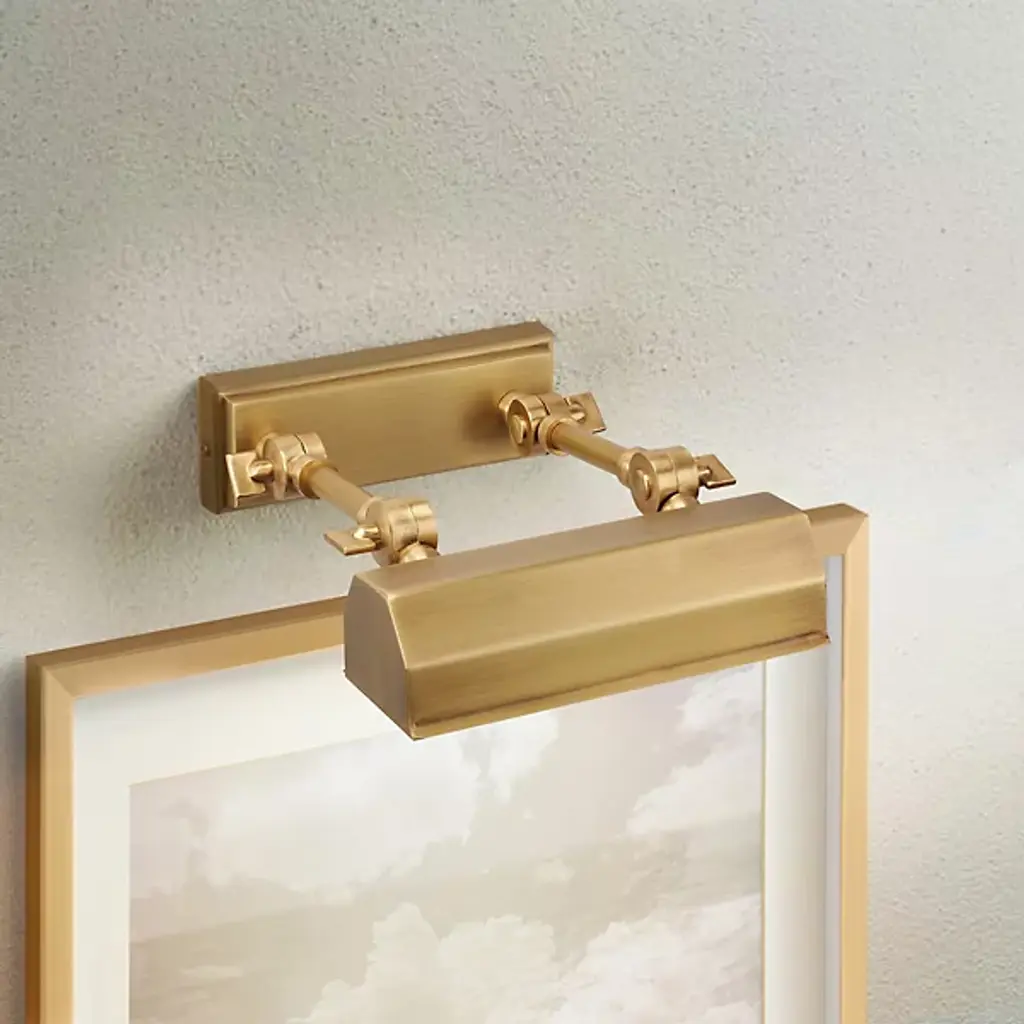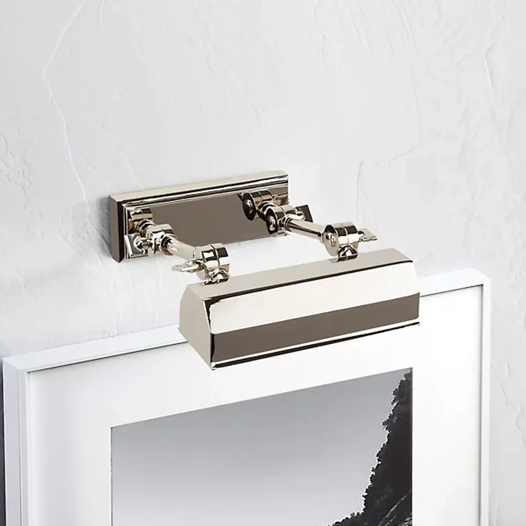 Put a spotlight on talent with the warm metal surfaces of the Chawton Small Picture Light from Lucas McKearn. A vintage-styled offering that extends from a stepped rectangular wall mount, it uses double-jointed arms in parallel to secure an angular, hooded shade around potent lamping, focusing a mix of direct downlight and warmth out through its base. The fixture blends class and flexibility, able to be set for a focused wall wash to highlight the art mounted below or focused up and out to bathe its surroundings in indirect light.