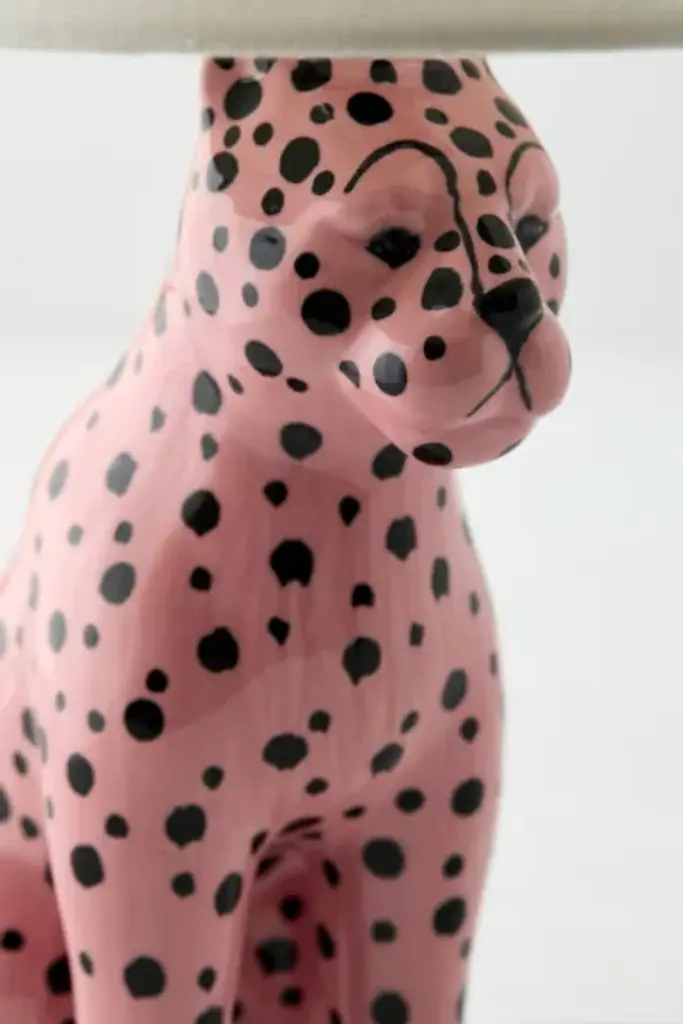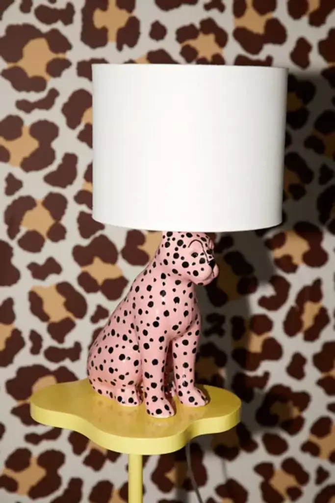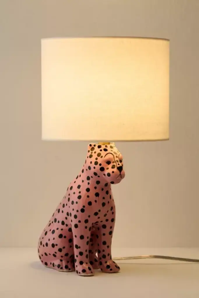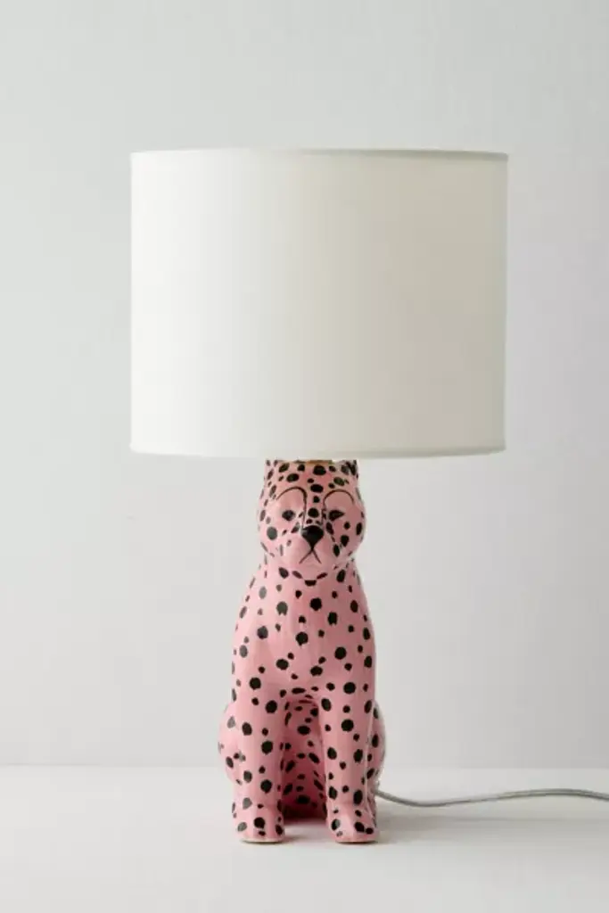 Like a regal cat, this unique cheetah table lamp brings boldly cool energy to your space. This ceramic table lamp features a hand-painted base shaped like a cheetah with a woven, cylindrical shade. Available exclusively at Urban Outfitters. **Features** \- Unique table lamp from UO Home \- Ceramic table lamp with a cheetah-shaped base \- One-of-a-kind, each lamp has unique hand-painted variance \- Woven drum shade \- Plug in \- Requires one 60W bulb - not included \- UO exclusive **Content + Care** \- Ceramic, fabric, iron \- Wipe clean \- Imported \- Made in compliance with US electrical standards. To use this item outside of the US, pair with an outlet adapter and voltage converter made specifically for use in your location. **Size** \- Overall dimensions: 9"l x 9"w x 17"h \- Base dimensions: 4"l x 8"w x 9.75"h \- Shade dimensions: 9"dia x 7"h \- Cord length: 98.43" \- Wattage: 60W \- Weight: 4.14 lbs \- Shipping package dimensions: 13"l x 13"w x 15"h \- Shipping package weight: 11.02 lbs