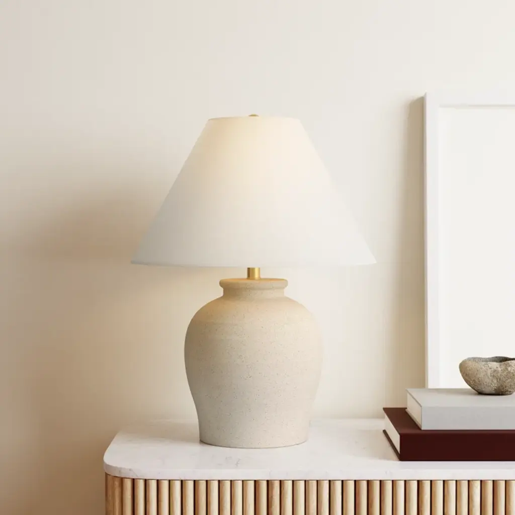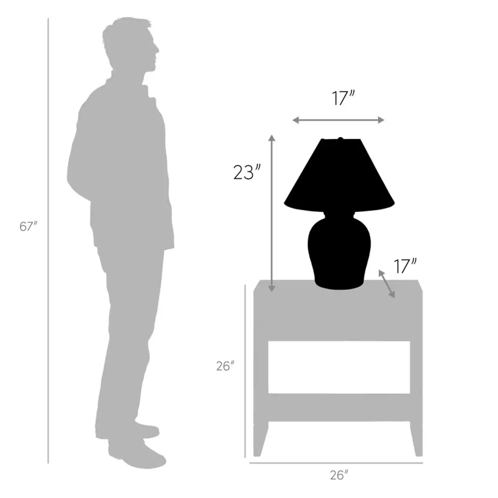 This table lamp brings together classic shape and tactile texture with its urn-inspired ceramic base and distinctive cone shade. A round ball finial tops it off with a polished detail, while the 3-way switch lets you adjust the light to suit your space using a single 150W max bulb (not included). Measuring 23" high with a 17" diameter, it’s scaled for end tables, nightstands, or entryway consoles. The plug-in design makes setup easy, offering a bold yet compact accent with everyday functionality.