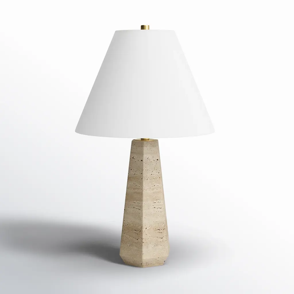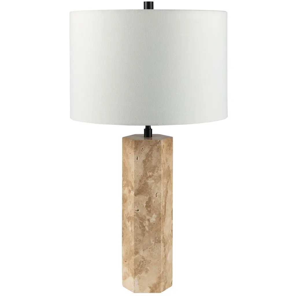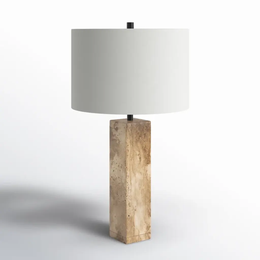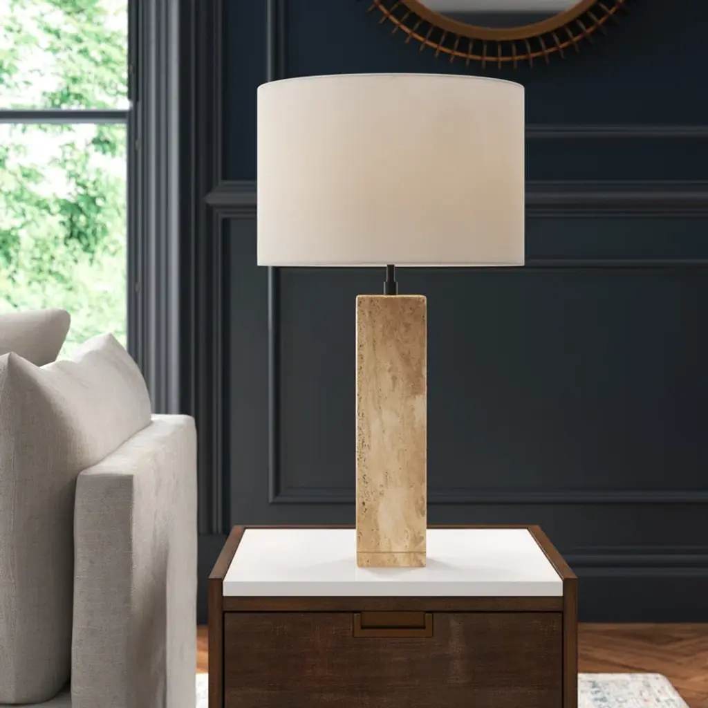 Sometimes you just need a table lamp that merges industrial and rustic elements to create a bold, standout look. It features a stunning, rectangular travertine body with a swirling organic pattern, while up top is a metal ball finial for a decorative touch. A drum shade consists of an exterior linen covering and an interior polyester layer, tempering the ambient glow from a 100W max bulb (sold separately). And, bonus, it has a handy touch switch on the socket.