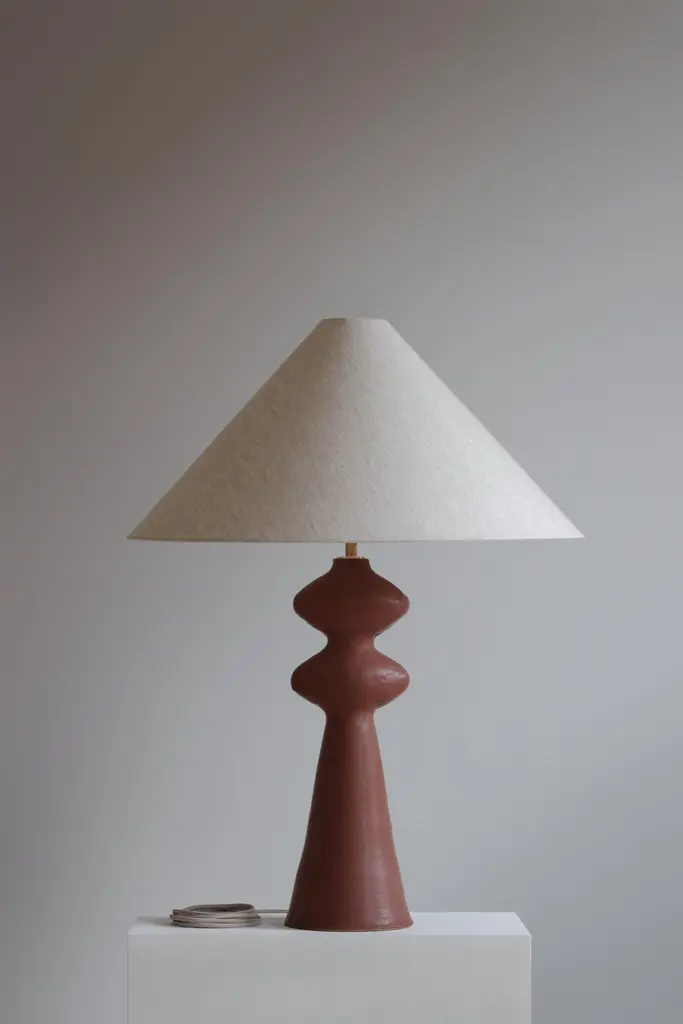 Chestnut Pollux 40 Table Lamp by Danny Kaplan StudioDimensions: ⌀ 72 x H 102 cmMaterials: Glazed Ceramic, Unfinished Brass, Wax PaperThis item is handmade, and may exhibit variability within the same piece. We do our best to maintain a consistent product, but honor the handmade craftsmanship. Dimensions may vary within an inch.UL Certification available upon request.All our lamps can be wired according to each country. If sold to the USA it will be wired for the USA for instance.Danny Kaplan Studio is a ceramic studio based in Brooklyn focused on lighting and sculptural furniture. Everything is handmade to order.