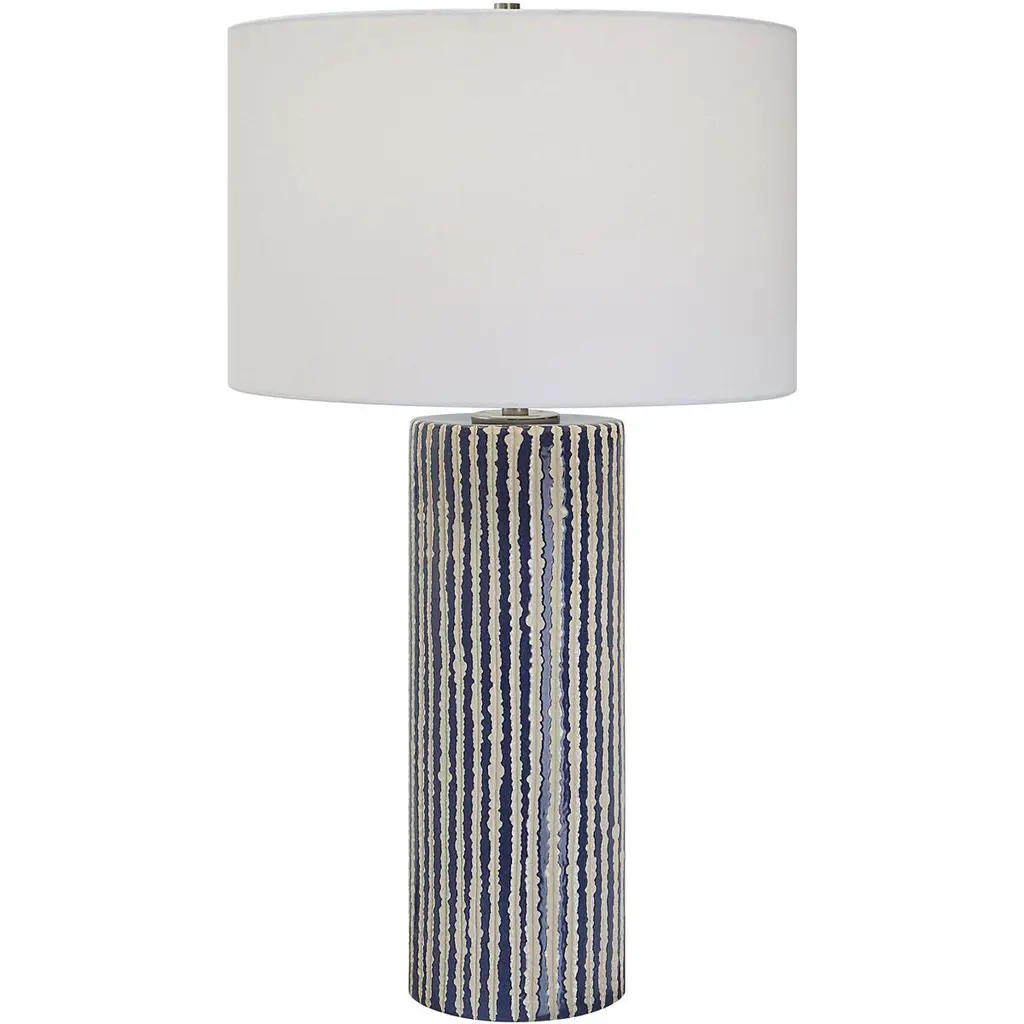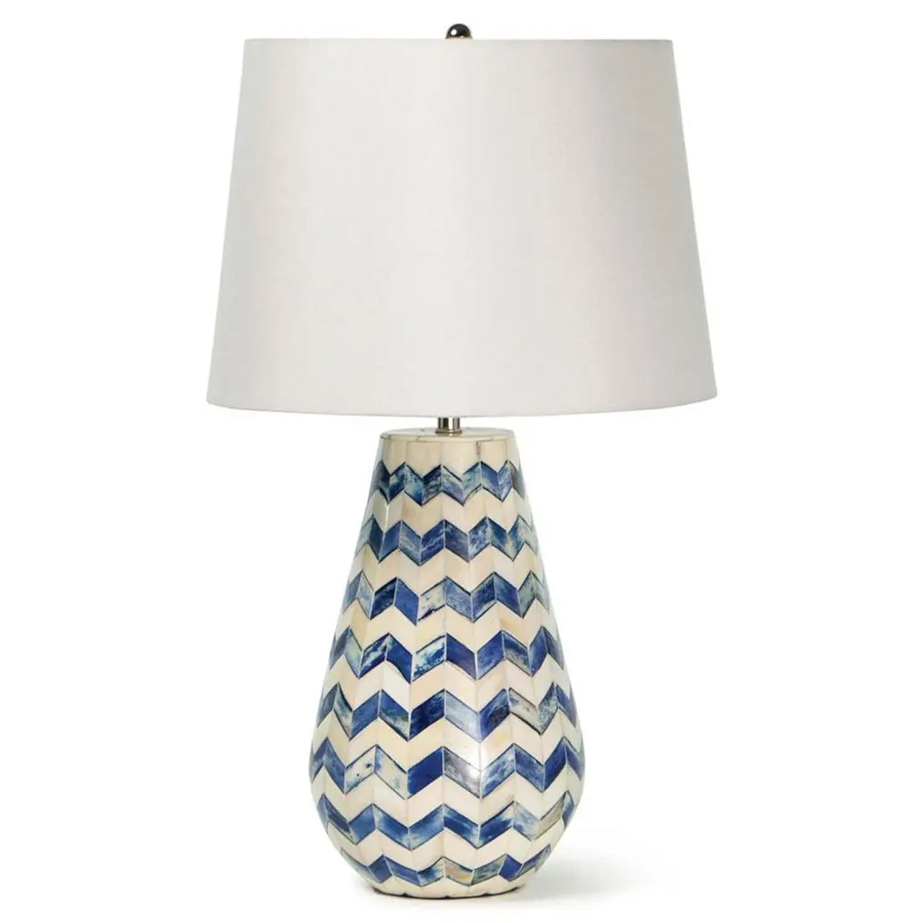 The idea for this stunning lamp arose while exploring markets in the Northern Gangetic Plains of India, close to foothills of the Himalayas. Chevron patterns emerged as a market motif, peppered on many flat surfaces, giving our team the idea to explore the pattern on a rounded surface. On the Chevron Bone Table Lamp, each piece of bone is cut into a specific size and shape, then glued to cover the entire base, a work of art all its own. All the elements of this unique lamp come together perfectly: the intricate inlaid bone, the classic chevron pattern, the soft shape, the linen shade. Alternating between indigo and white, its familiar pattern and classic shape is a welcome addition to any space.Bulb Type: A Type Medium Base (E26)Wattage: 3-Way 100 Watt MaxNumber of Bulbs Needed: 1Bulb Included: No