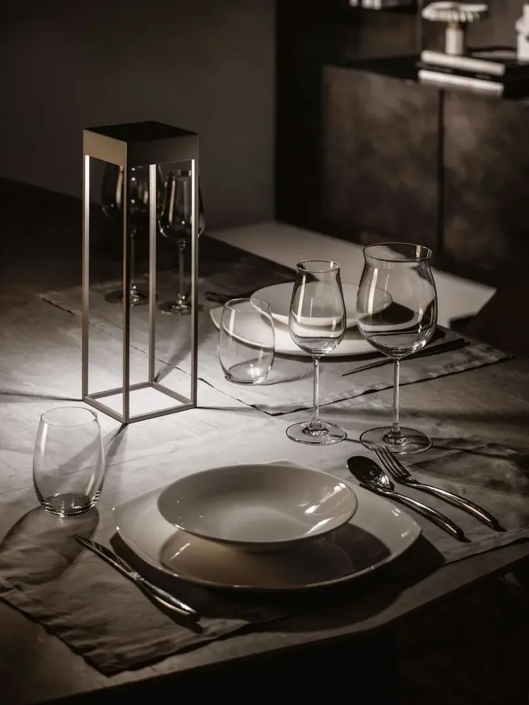 Inspired by the 16th Century Chia Tower by the sea in Sardinia, Chia is a stylish and evocative wireless table lamp, fitted with a lithium battery with a range of up to 15 hours of operation, whose shapes recall those of a lantern that has been reinterpreted with a contemporary twist.Light-weight, almost suspended silhouettes, which define the space without occupying it, and where metal, which has been skilfully processed and expressed in various finishes, designs the lampshade in a clean-cut, harmonious manner. LED technology and warm light for the light source which can be adjusted to three brightness settings as well as a courtesy light setting. The lighting plate is placed at the top of the frame and it generates a romantic suffused light, just like a lantern.Its linear and emphatic shape, the fourteen different colour variants available for the powder- or liquid-coated metal and its wireless portability make Chia perfect for any setting: the living room, the bedroom, a home office corner and, why not, it can also be used to accompany an al fresco dinner.Emphatic and smart, Chia can also be used to adorn tables in cafés and restaurants or covered lounge gardens.Technical details:Warm light: 3000K - A ++Removable lithium battery: 5500 MA / h - 3.7 VUp to 15 hours of autonomyIP 333 + 1 light intensity: max 3.6 Watt - 410 lmBattery charger includedMagnetic lamp