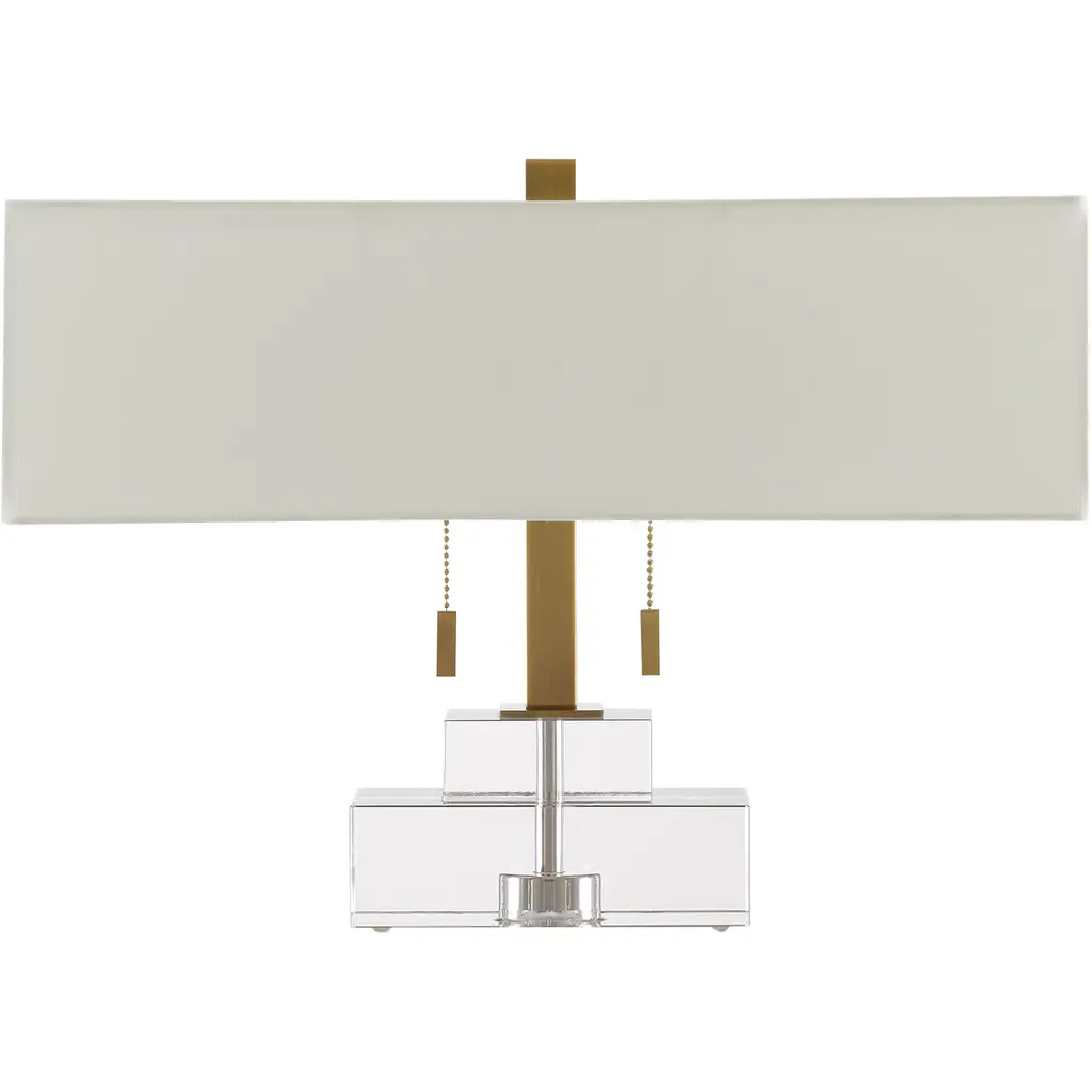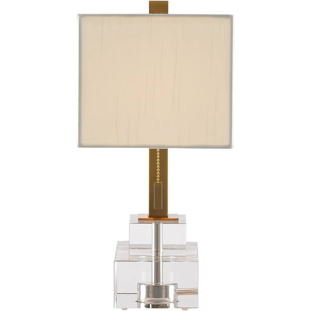 Rectangles of clear optic crystal make the Chiara Table Lamp luminous. Contrasting the pale stacked body are the antique brass finish on the metal and the off-white shantung shade.