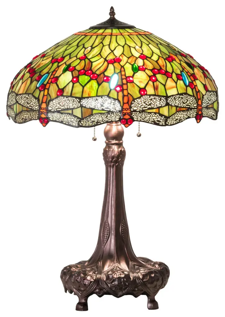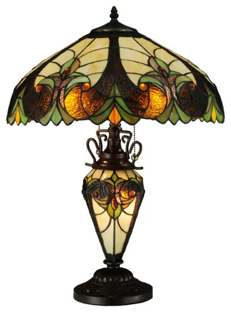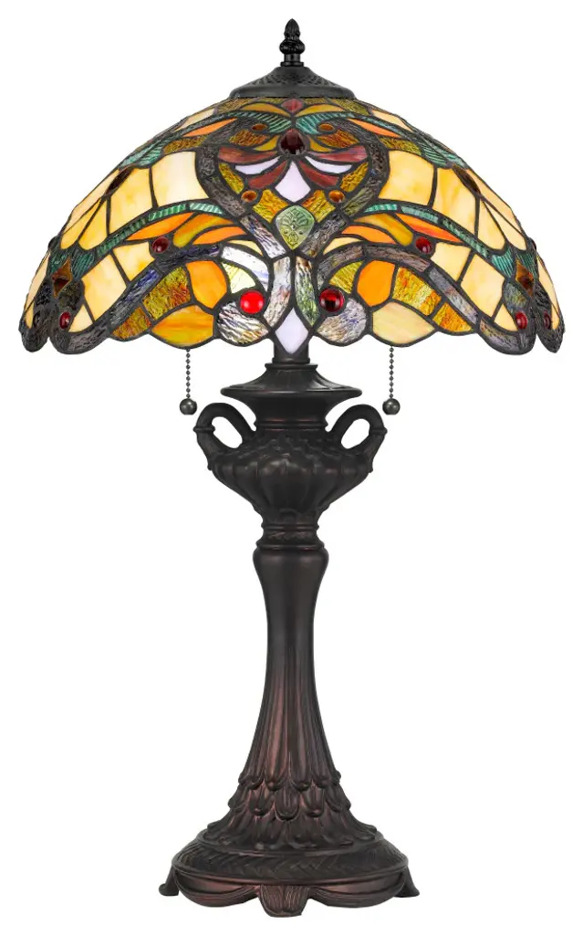 A beautiful combination of color and texture, our Chiara Tiffany Table Lamp is sure to be a hit in any room. This unique fixture features a generously sized bell shade with a background of wedge-shaped art glass pieces in sunny light amber separated by bold filigree. A wide band of agate stones in earth tones runs around the bottom edge of the shade. We added iridescent art glass shells throughout for added texture and sparkle. The metal base, finished in Antique Bronze, features a flat pedestal with ball feet. 2 side arms flank the center column and wrap around a lighted orb that is crafted of art glass in complementary tones. At the top, a matching crown finial is surrounded by art glass pieces in matching tones to add balance to the overall design. Perfect when displayed in pairs on matching end tables or nightstands, our Chiara Tiffany Table Lamp will provide your family with years of artistically reliable lighting.