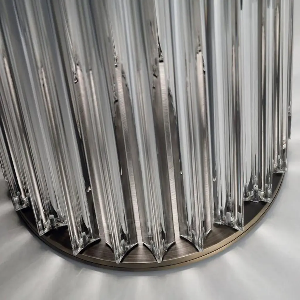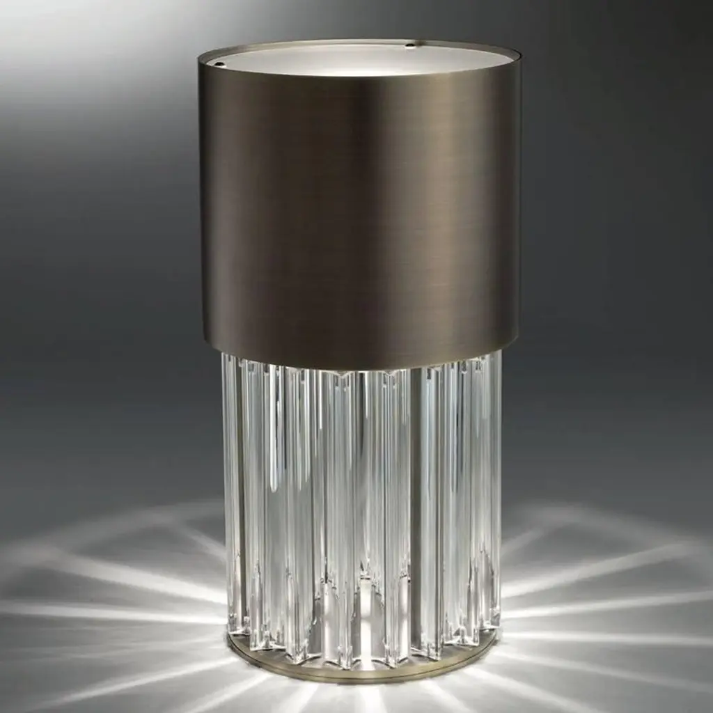 The sophisticated allure of this light comes from its precious materials and timeless lines that make an elegant and timeless Silhouette in the shape of a luminous cylinder with a dark bronze structure on top, supported by a series of trihedrons made in crystal with an amber or smoke grey finish. The result is an object that reflects and diffuses light through its crystal elements and creates unique effects on whichever table or console it is placed.