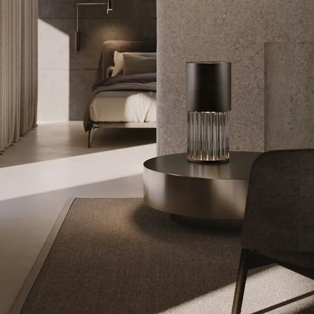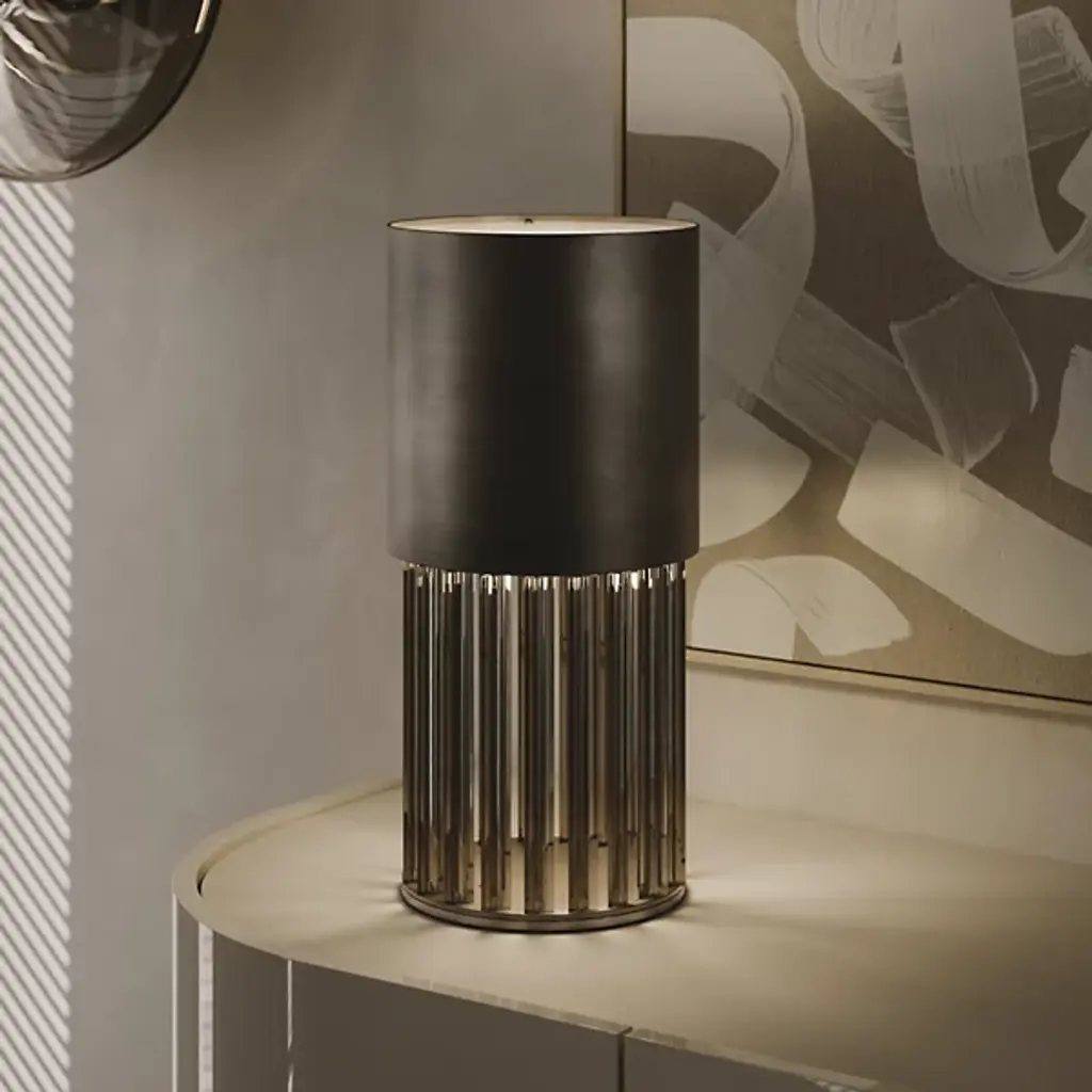 The Chic Table Lamp from Venicem is defined by its bronze composition and striped accents at the base and lampshade. It features Murano glass trihedrons that allow LED light to emanate throughout your living space effortlessly. This contemporary lighting solution is expertly crafted in Italy and represents the height of contemporary design. Your versatile lamp complements a variety of interiors and makes a handsome and luminous addition to your table.