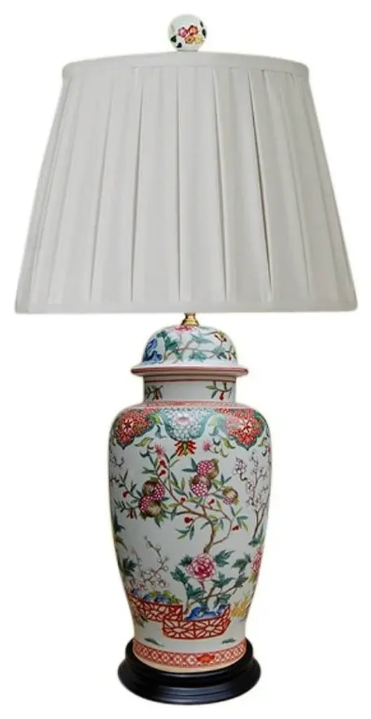 Please note : As most of our porcelain pieces are hand made and hand painted they may be slightly different from the photo in both shape and the way it is even colored! We do our best to find the one that is most common but sometimes they will be slightly different (around 10% in size and design). we do not consider these reasons to be defects. We will always try to find the best matching pair if you purchase two and notify you of any discrepancies if we catch them. Chinese Porcelain Scallop Ginger Jar Table Lamp Bird Floral Motif 27"Country of Origin: China Dimensions (in inches): Height: 27" Length: 18" With shade (150 max wattage) 3 Way SwitchNumber of Bulbs: 1UL LISTED: YESBulbs Not IncludedComes with Shade and Finial
