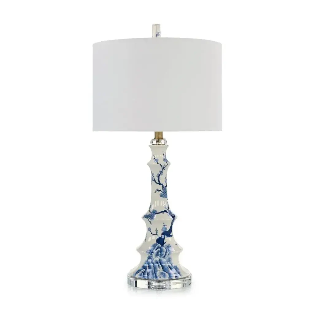 The Chinoiserie Table Lamp displays classic motifs through a contemporary silhouette. Crafted from glazed porcelain, the lamp showcases a towering form of tapered ripples overlain with stunning florals in traditional tones of blue and white. The piece rests upon a round crystal base, with a matching accent at the neck, as well as brass hardware. The look is completed by a porcelain peg finial and a white drum shade with rolled edges.