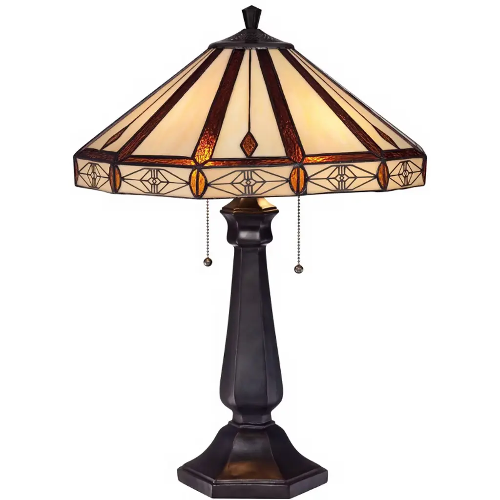 This Tiffany-style Mission design 2-light table lamp features an antique bronze finish that will complement many decors throughout your home. Hand crafted from individually hand cut pieces of copper-foiled stained glass that will add color and beauty to any space.(2) 100 Watt max E26 Type A Bulb (not included)Pull chain16pcs glass cutDownlightIndoor SettingSince these are hand crafted products, the exact color of glass pieces may vary. Colors of the glass will appear darker and less vibrant when not illuminated. Handmade glass will vary from one piece to the other; glass made at different times will also vary. Light bulbs used in lamps or ambient lighting may affect the appearance of the products. Stained glass product has been protected with mineral oil as part of the finishing process. Please use a soft dry cloth to remove any excess oil.