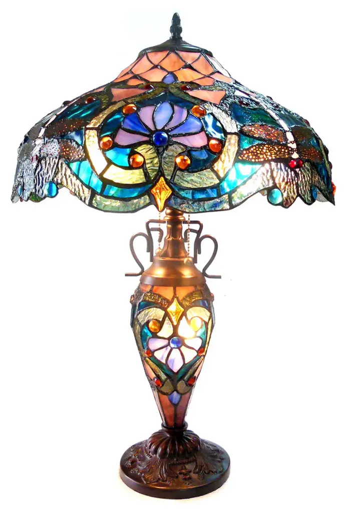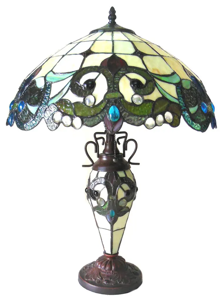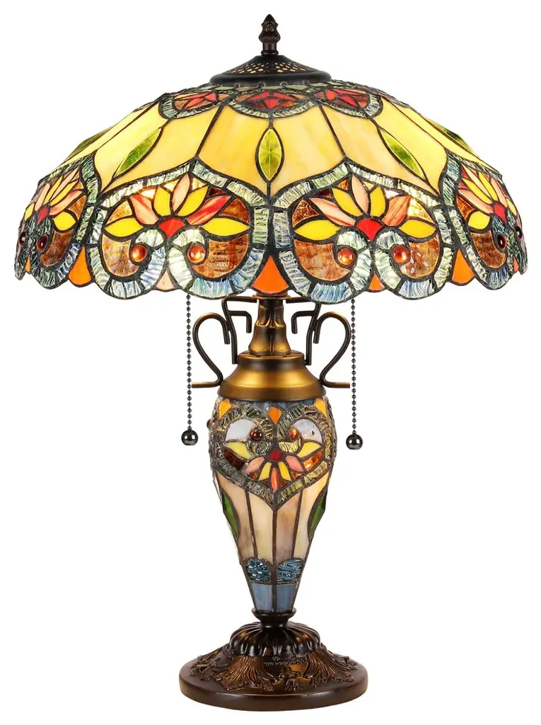 DULCE, a Victorian double lit table lamp is handcrafted with pure stained glass, with gem tone, soft pedestals, as well as the Victorian motif.The warm color glow of the stained glass will create warmth to your home.With this table lamp you can make a soft romantic glow by using just the mid-section.(2) 100 Watt max E26 Type A Bulb + 1-Max 15 Watt E12 Type C Bulb (not included) Pull chain & on-cord rotary switch510pcs glass cut, 63 beadsDownlightIndoor SettingSince these are hand crafted products, the exact color of glass pieces may vary. Colors of the glass will appear darker and less vibrant when not illuminated. Handmade glass will vary from one piece to the other; glass made at different times will also vary. Light bulbs used in lamps or ambient lighting may affect the appearance of the products. Stained glass product has been protected with mineral oil as part of the finishing process. Please use a soft dry cloth to remove any excess oil.