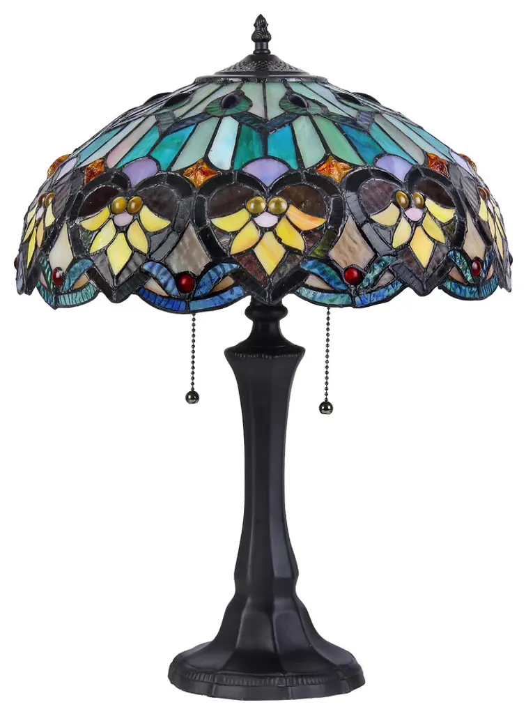 AMOR, Tiffany-style Victorian table lamp is handcrafted with pure stationed glass and gem tone. Each glass piece individually positioned to create the perfect look. Exquisite touches create warmth and serenity. Expertly crafted with top quality materials.(2) 60 Watt max E26 Type A Bulb (not included) Pull chain324pcs glass cut, 18 jewel beadsDownlightIndoor SettingFinish: Dark Antique Bronze