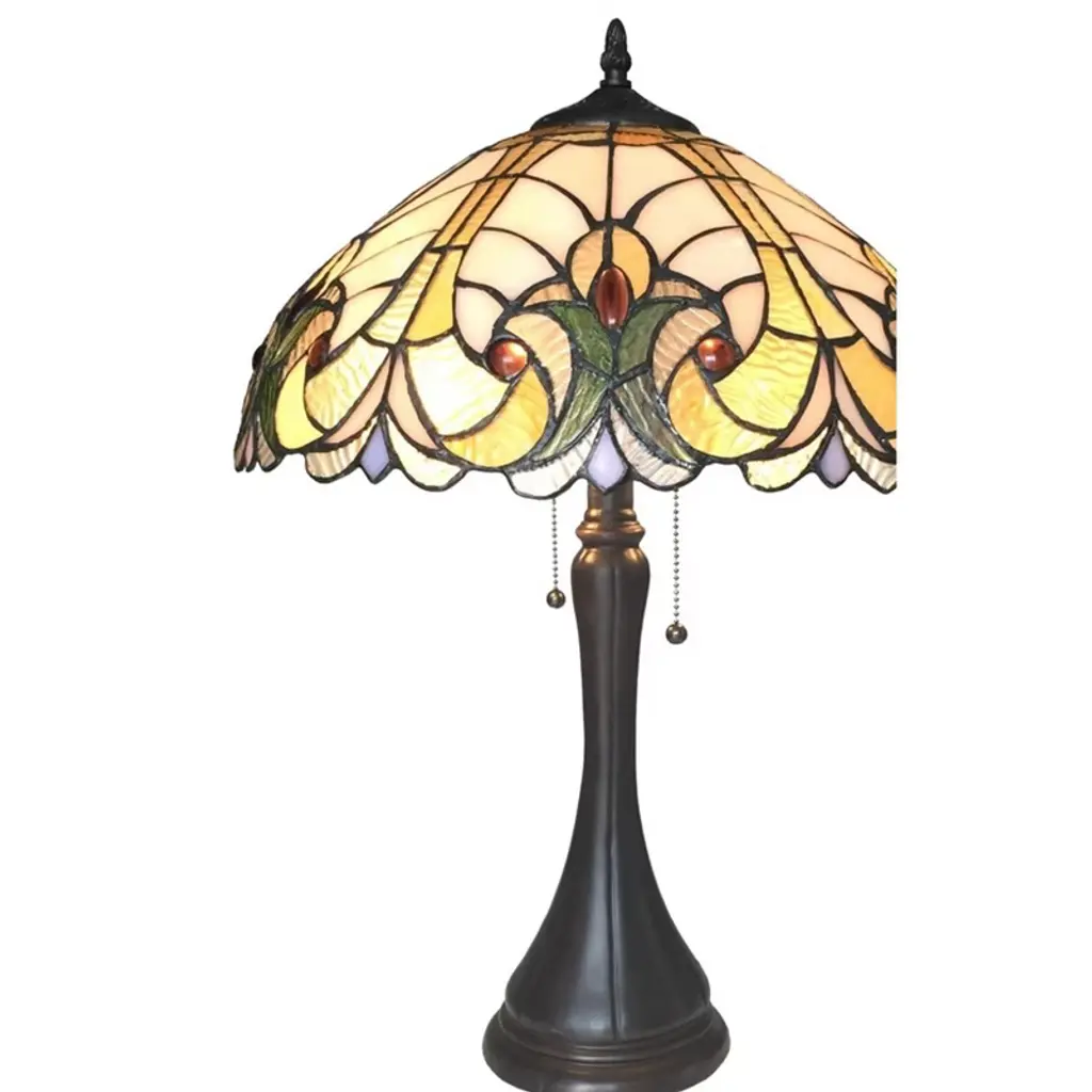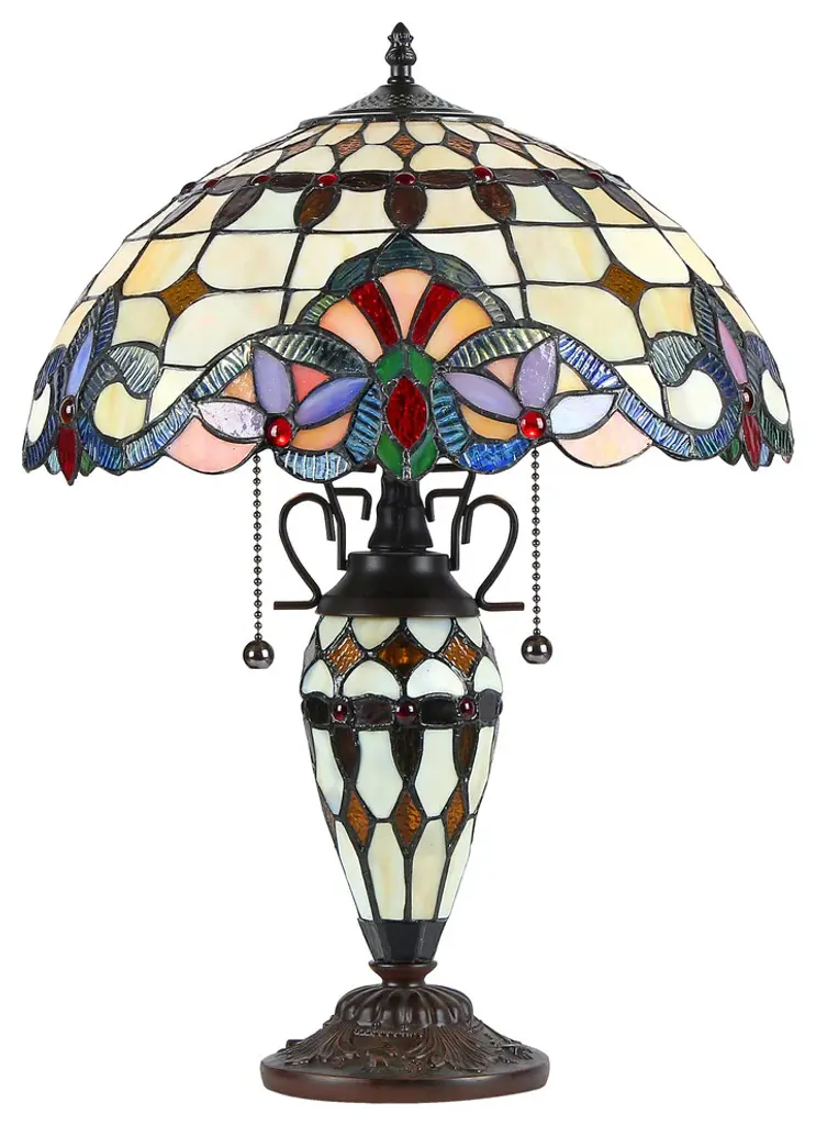 Add classic elegance to your home with the AMOR Tiffany-style Table Lamp, a Victorian-inspired lighting piece handcrafted with warmth and artistry. Its round 16-inch shade is adorned with 324 cuts of stained Tiffany-style glass and 18 rich jewel-tone glass beads, meticulously arranged for vintage charm and vibrant beauty. Key Features Victorian-style table lamp with stained Tiffany glass and gem tones Features 324 hand-cut glass pieces and 18 decorative glass beads Uses (2) 100W max E26 Type A bulbs (not included) with pull chain switch Dimensions: 22" H × 16" W × 16" D; 72" cord length UL and cUL Listed; ideal for indoor use with wall plug power source