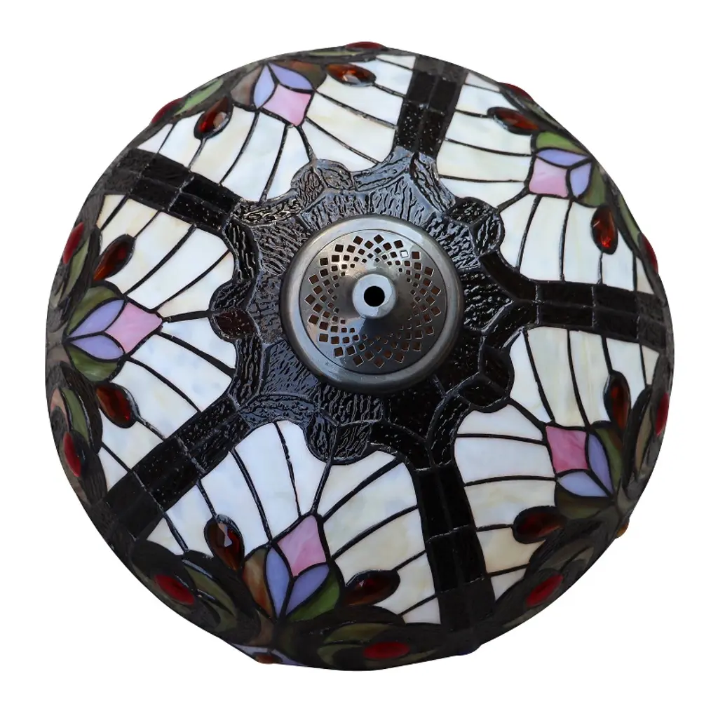 Lennon is a stunning 3 light double-lit table lamp, featuring a beautiful victorian shade. This piece would be perfect by a bed or in a foyer. Each shade is handcrafted, using the same methods developed by Louis Comfort Tiffany in the early 1900's. This process entails using 418 hand cut stained art glass pieces and 36 glass beads, each wrapped in fine copper foil and soldered together at extremely high temperatures to form each unique piece. Exact size to the nearest inch may vary, and exact color of each glass piece may vary due to each piece being handcrafted. First image is with the light shining through, second image is with no light. Dry listed and recommended for an indoor setting.