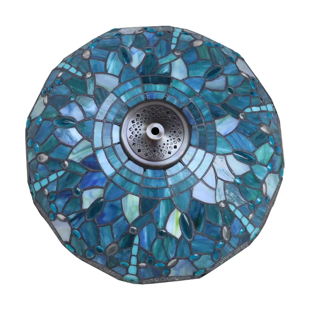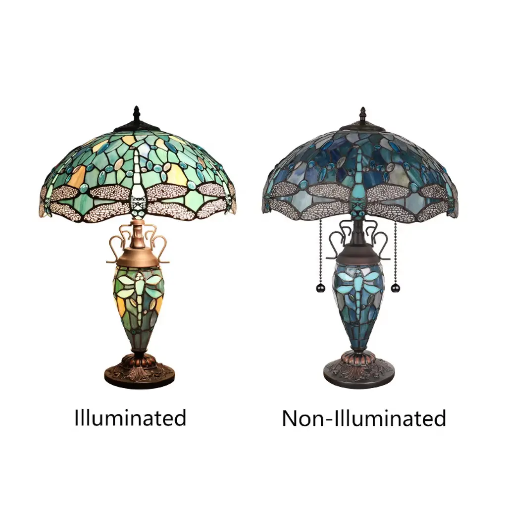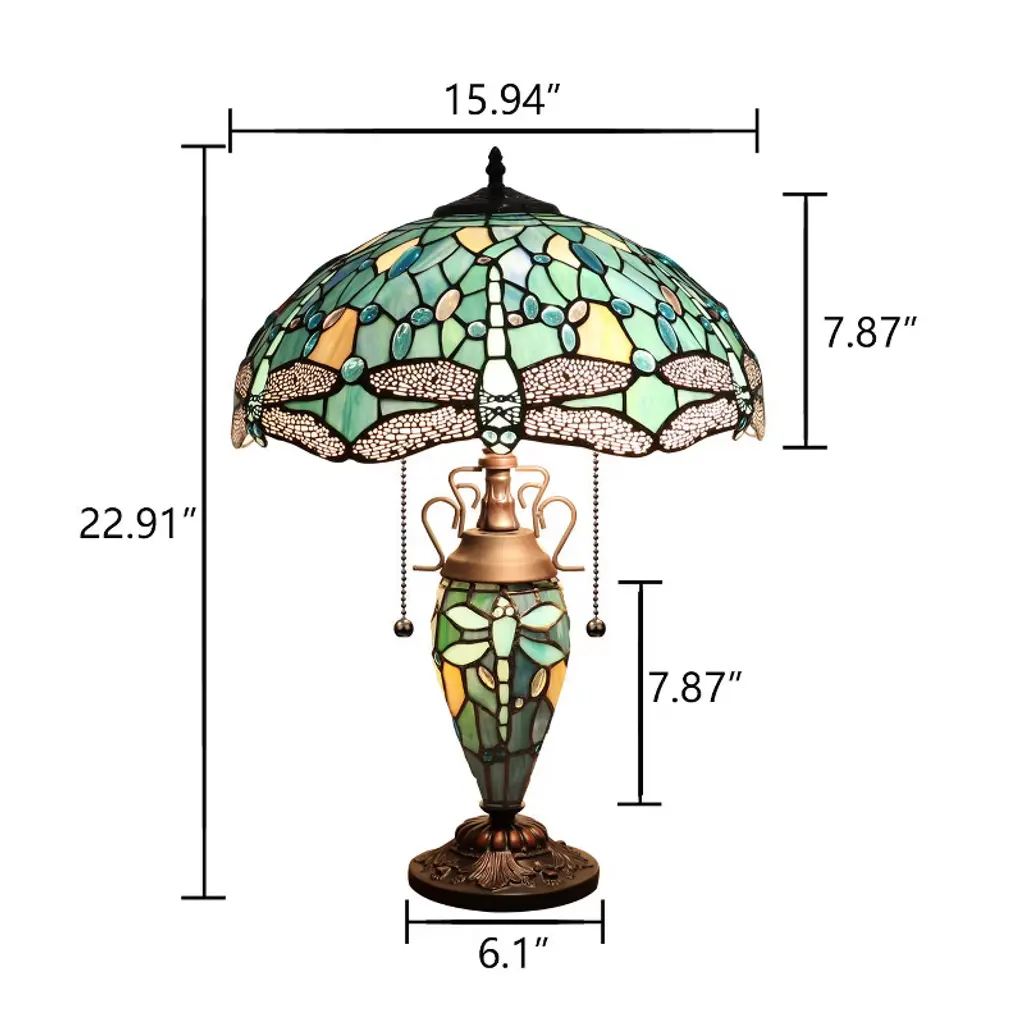 Sunniva is a stunning 3 light double lit table lamp, featuring a beautiful dragonfly shade. This piece would be perfect by a bed or in a foyer. Each shade is handcrafted, using the same methods developed by Louis Comfort Tiffany in the early 1900's. This process entails using 363 hand cut stained art glass pieces, and 126 glass beads, each wrapped in fine copper foil and soldered together at extremely high temperatures to form each unique piece. Exact size to the nearest inch may vary, and exact color of each glass piece may vary due to each piece being handcrafted. First image is with the light shining through, second image is with no light. Dry listed and recommended for an indoor setting.