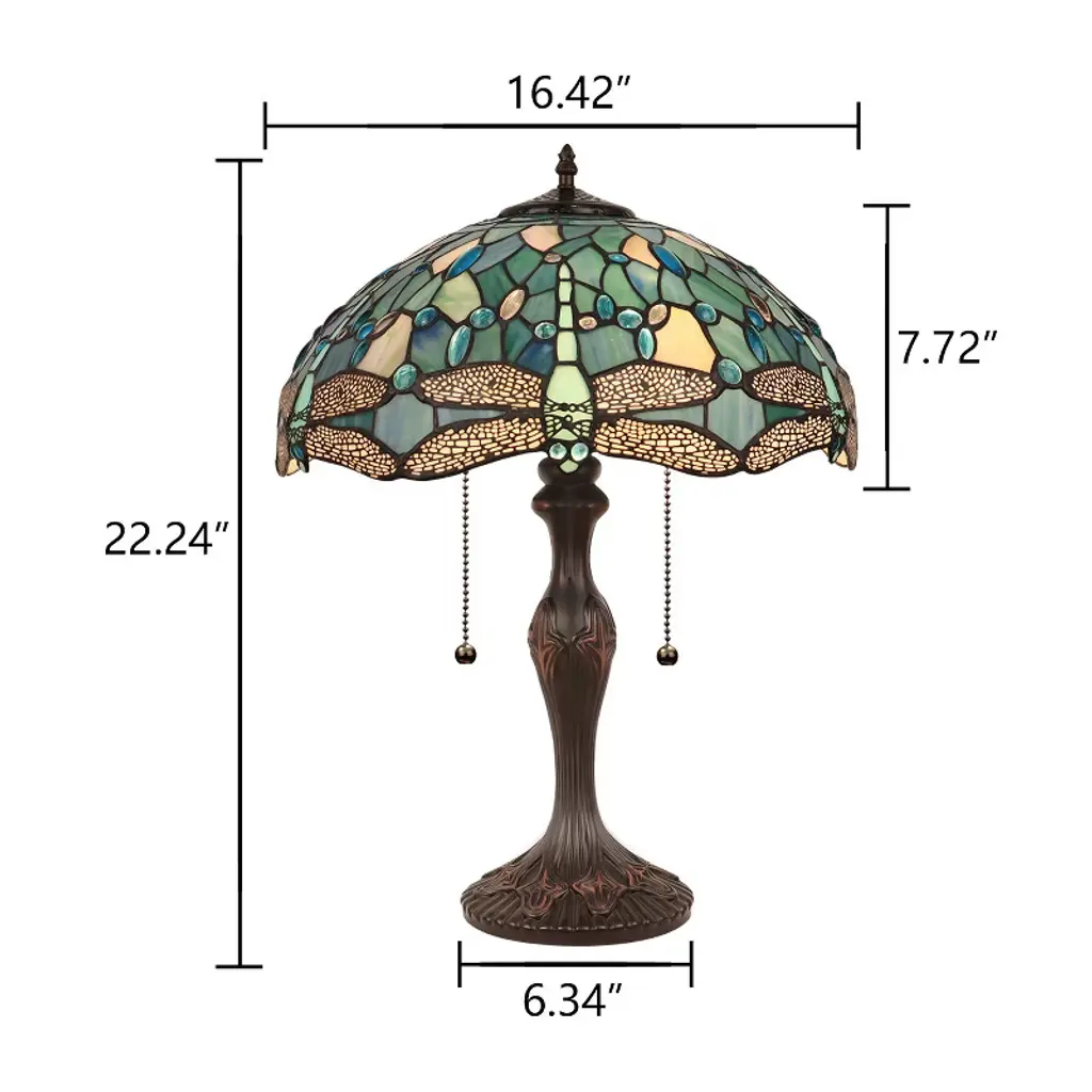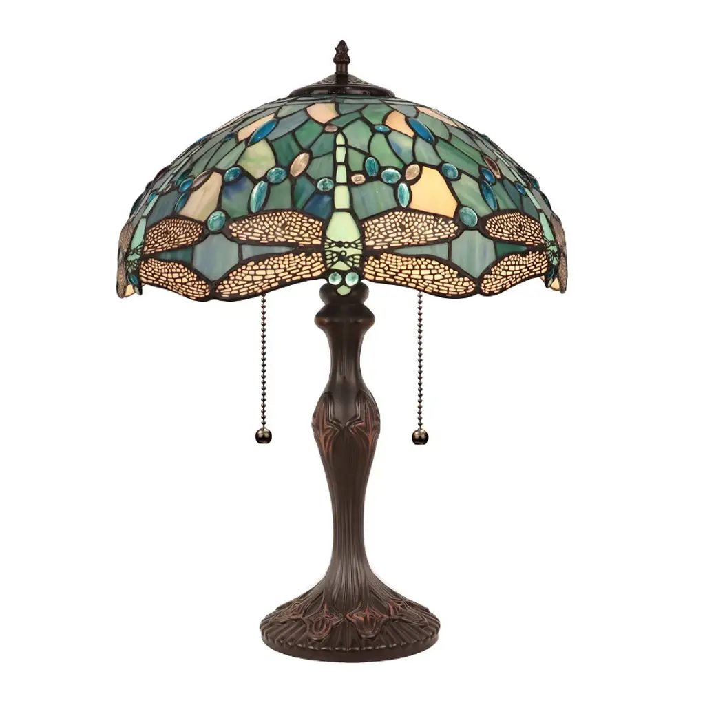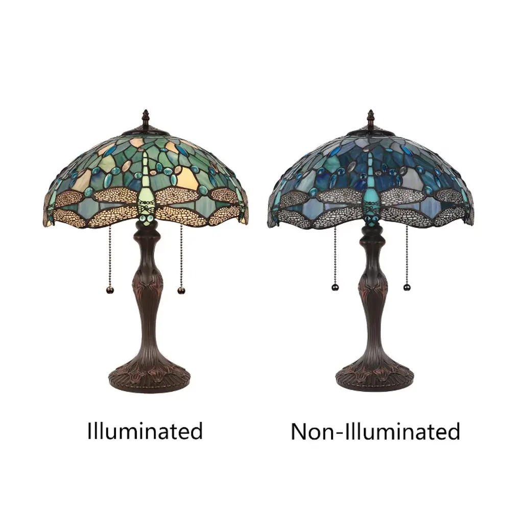 Sunniva is a stunning 2 light table lamp, featuring a beautiful dragonfly shade. This piece would be perfect by a bed or in a foyer. Each shade is handcrafted, using the same methods developed by Louis Comfort Tiffany in the early 1900's. This process entails using 252 hand cut stained art glass pieces, and 96 glass beads, each wrapped in fine copper foil and soldered together at extremely high temperatures to form each unique piece. Exact size to the nearest inch may vary, and exact color of each glass piece may vary due to each piece being handcrafted. First image is with the light shining through, second image is with no light. Dry listed and recommended for an indoor setting.