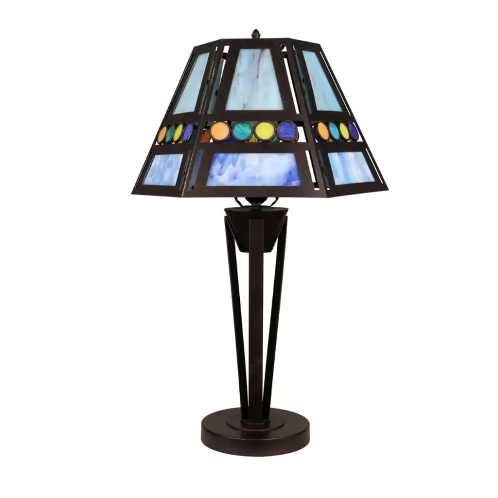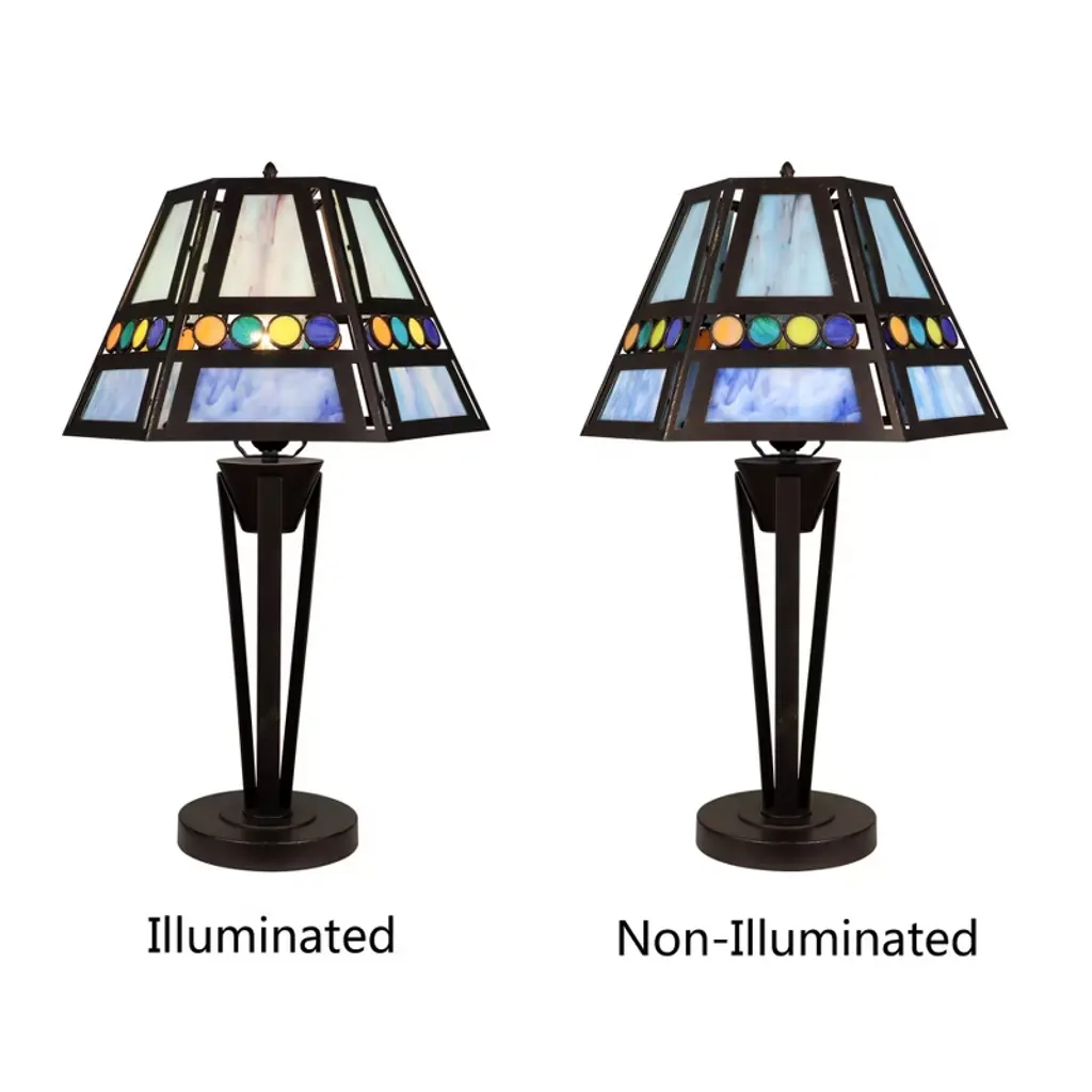 New to the Chloe spotlight is the beautiful Retro-Style line! These lamps are made up of stained glass pieces that are carefully inserted into metal frames, no soldering! This lamp is made up of 36 pieces of hand-cut art glass and features a unique base design, sure to complement your modern home decor. The exact color of each glass piece may vary due to each piece being handcrafted. First image is with the light shining through, second image is with no light. Dry listed and recommended for an indoor setting.