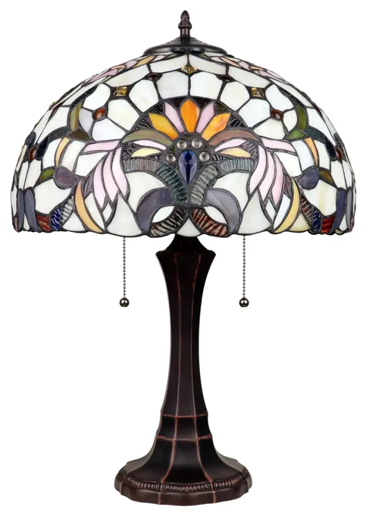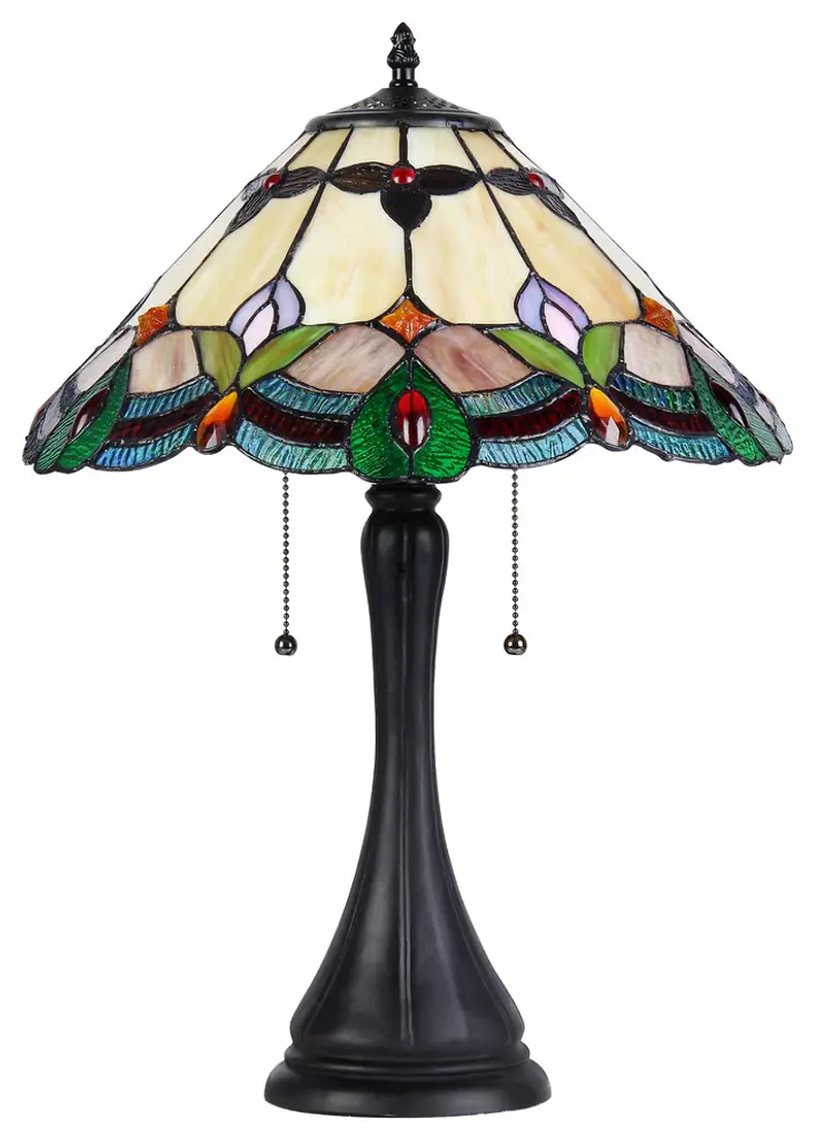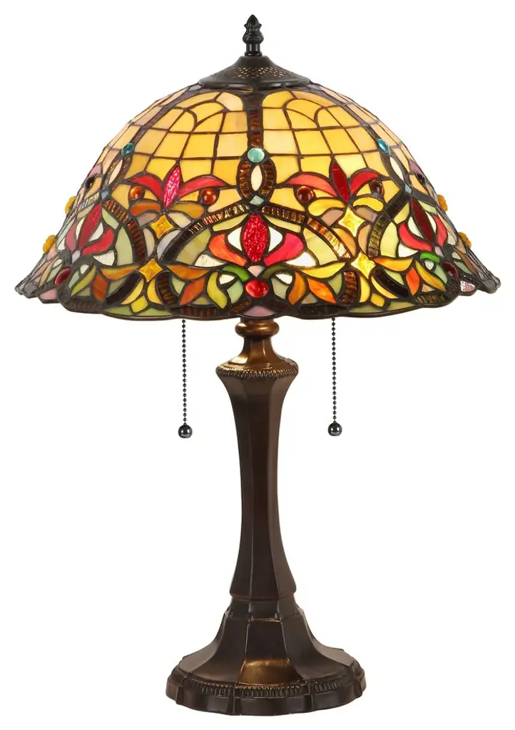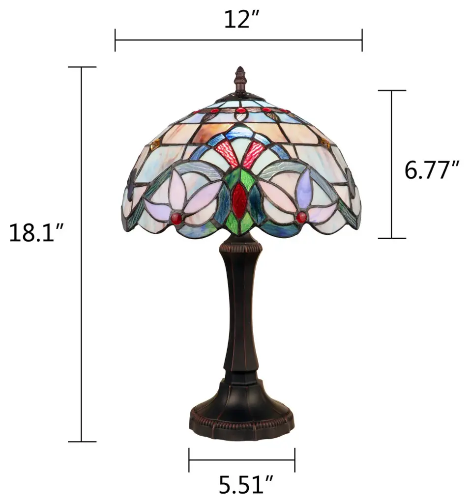 This Victorian design 2-light Tiffany-style table lamp would be a perfect fit in a bedroom, office, and living room! The shade is hand-crafted, using the same methods developed by Louis Comfort Tiffany in the early 1900s. This process entails using 465 hand-cut stained art glass pieces, 33 glass beads, and 12 crystals, each wrapped in fine copper foil and soldered together at extremely high temperatures to form each unique piece. The exact size to the nearest inch may vary, and the exact color of each glass piece may vary due to each piece being hand-crafted. The first image is with the light shining through, the second image is with no light. Dry-listed and recommended for an indoor setting.