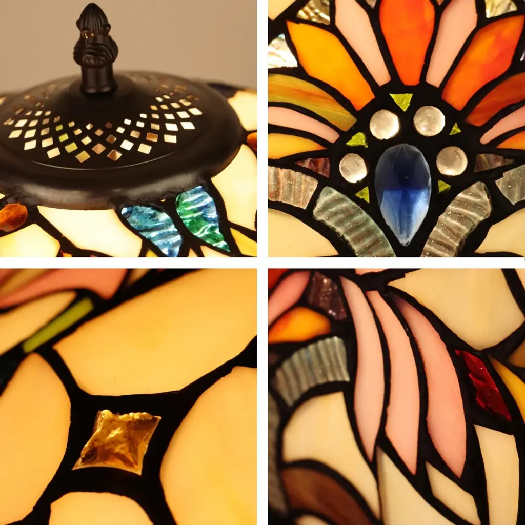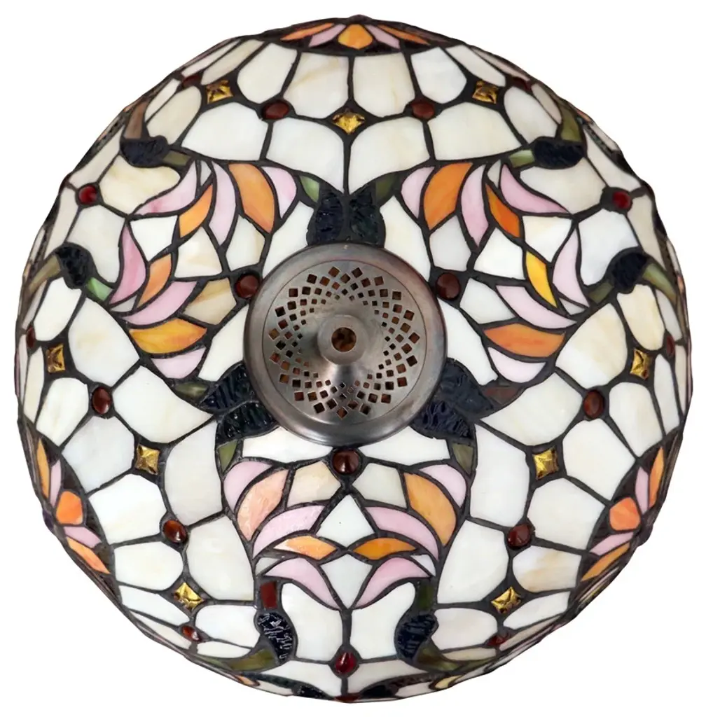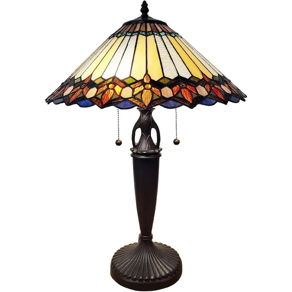 This Victorian design 2-light Tiffany-style table lamp would be a perfect fit in a bedroom, office, and living room! The shade is hand-crafted, using the same methods developed by Louis Comfort Tiffany in the early 1900s. This process entails using 465 hand-cut stained art glass pieces, 33 glass beads, and 12 crystals, each wrapped in fine copper foil and soldered together at extremely high temperatures to form each unique piece. The exact size to the nearest inch may vary, and the exact color of each glass piece may vary due to each piece being hand-crafted. The first image is with the light shining through, the second image is with no light. Dry-listed and recommended for an indoor setting.