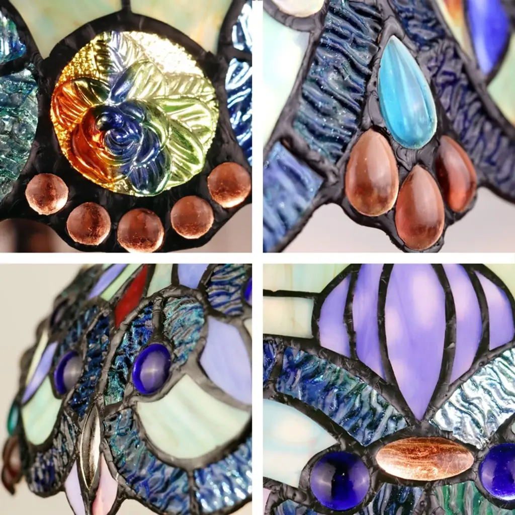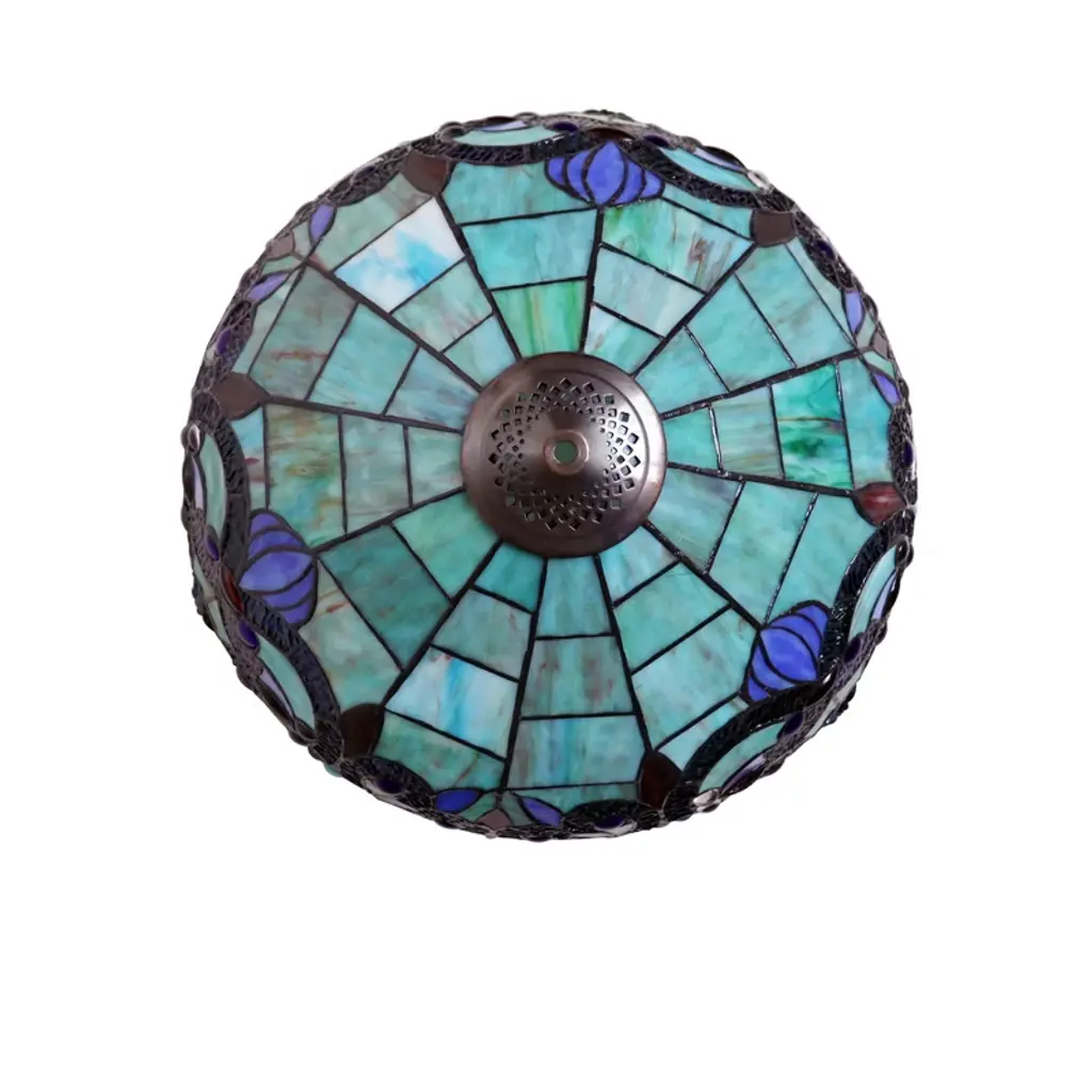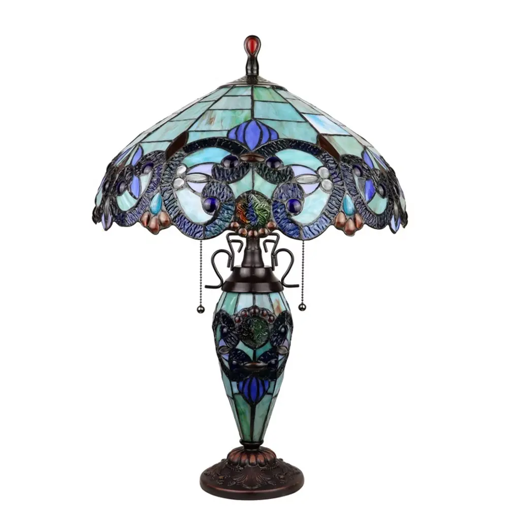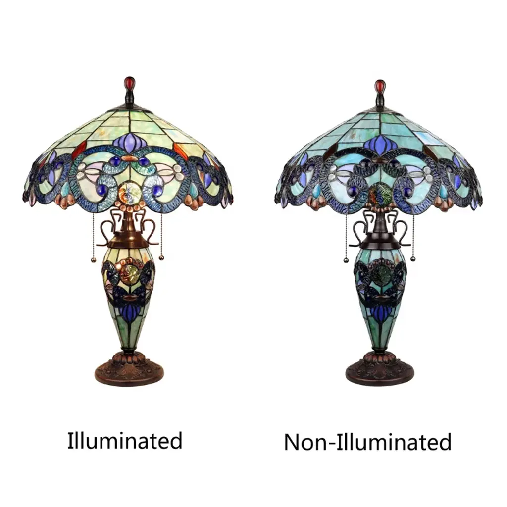 The Demetra Aurora Tiffany-style table lamp is a dazzling homage to Victorian artistry, featuring an 18" hand-cut glass shade in intricate patterns of amber, blue, and red tones. This double-lit design houses two E27 bulbs for primary lighting and a single E12 candelabra bulb within the stained glass base, offering a warm inner glow for added ambiance. Key Features Features (2) E27 Type A bulbs (60W max) + (1) E12 candelabra bulb (15W max); bulbs not included Tiffany-style hand-cut stained glass shade with 434 glass pieces and 118 beads Elegant antique bronze resin base with a built-in night light in the base Pull chain and rotary cord switch; 72" electric cord for flexible placement Measures 24.5" H x 18" W; UL and cUL listed for safe indoor use