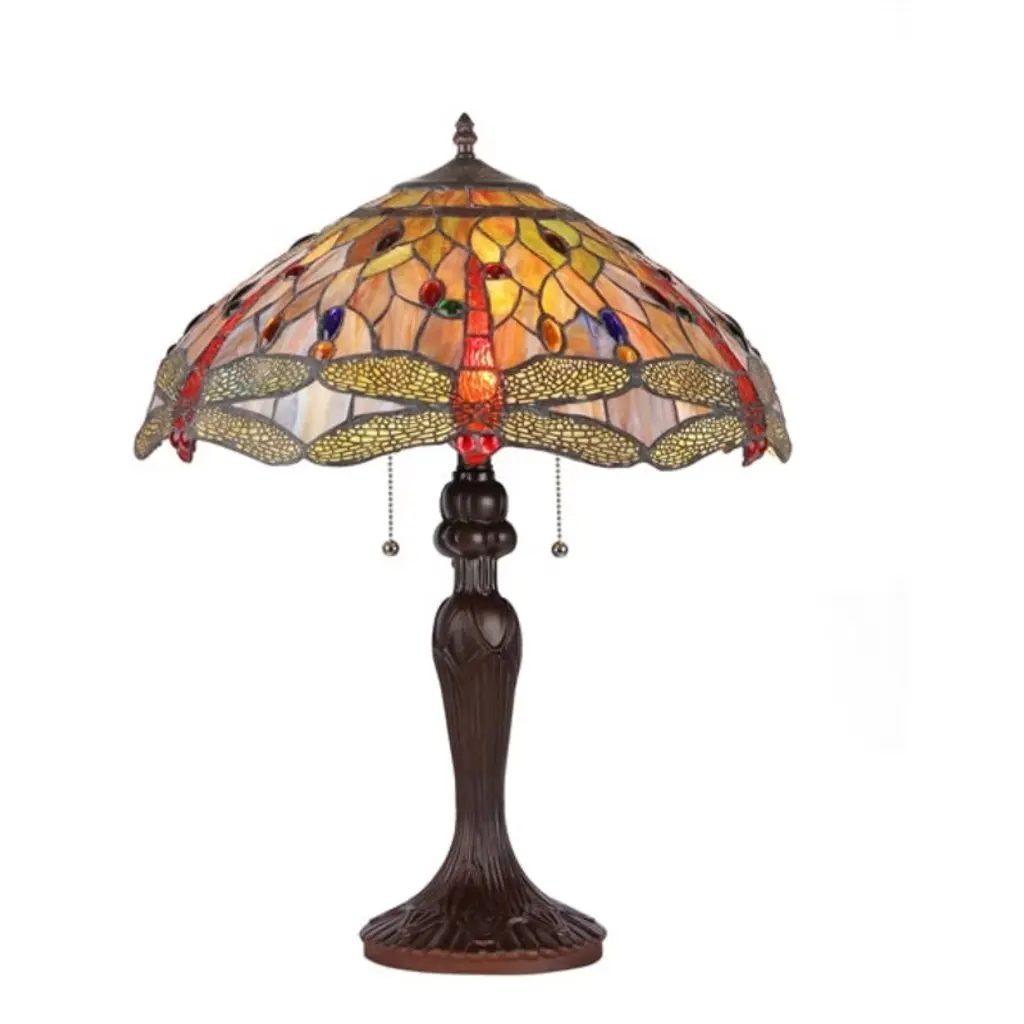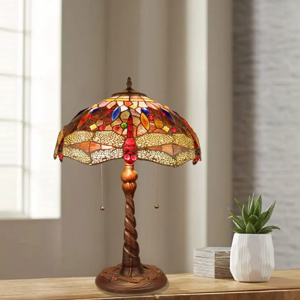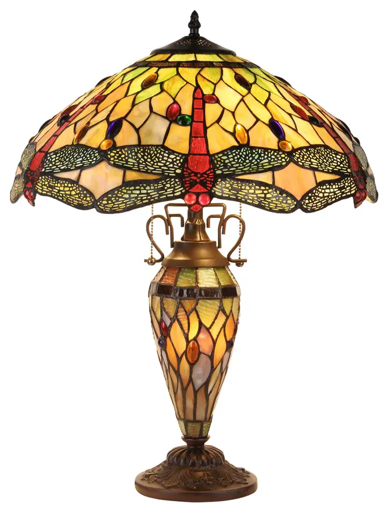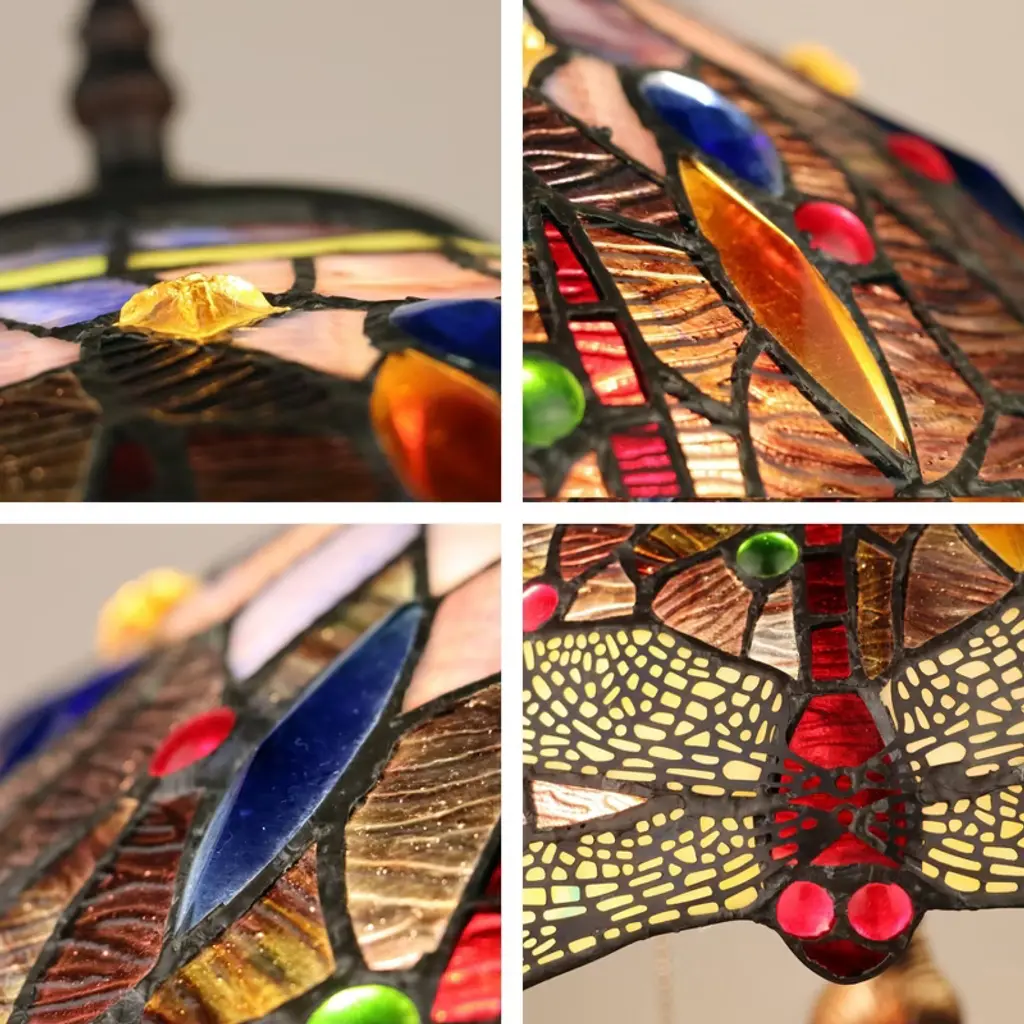 Enhance your space with the Chloe Lighting Dragan table lamp, a stunning piece that combines traditional craftsmanship with timeless design. The lamp features a handcrafted Tiffany-style shade adorned with vibrant stained glass in rich hues, showcasing intricate dragonfly motifs. The base is finished in dark antique bronze, complementing the colorful glasswork. Standing at 23 inches tall with a 16.4-inch diameter shade, this lamp provides a warm, inviting glow, making it perfect for living rooms, bedrooms, or reading nooks. Its classic design seamlessly blends with various décor styles, adding both functionality and beauty to your home. Key Features: Shade Material: Handcrafted Tiffany-style stained glass Base Material: Resin with a dark antique bronze finish Dimensions: 23" H × 16.4" W × 16.4" D Weight: 8.8 lbs Bulb Requirements: (2) 100W max E26 Type A bulbs (not included) Switch Type: Pull chain Glass Cuts: 330 pieces Glass Beads: 48 Crystals: 18 Light Direction: Downlight Mounting: Corded-electric with a 6-foot fabric-covered cord Certifications: UL and cUL Listed Assembly: No assembly required