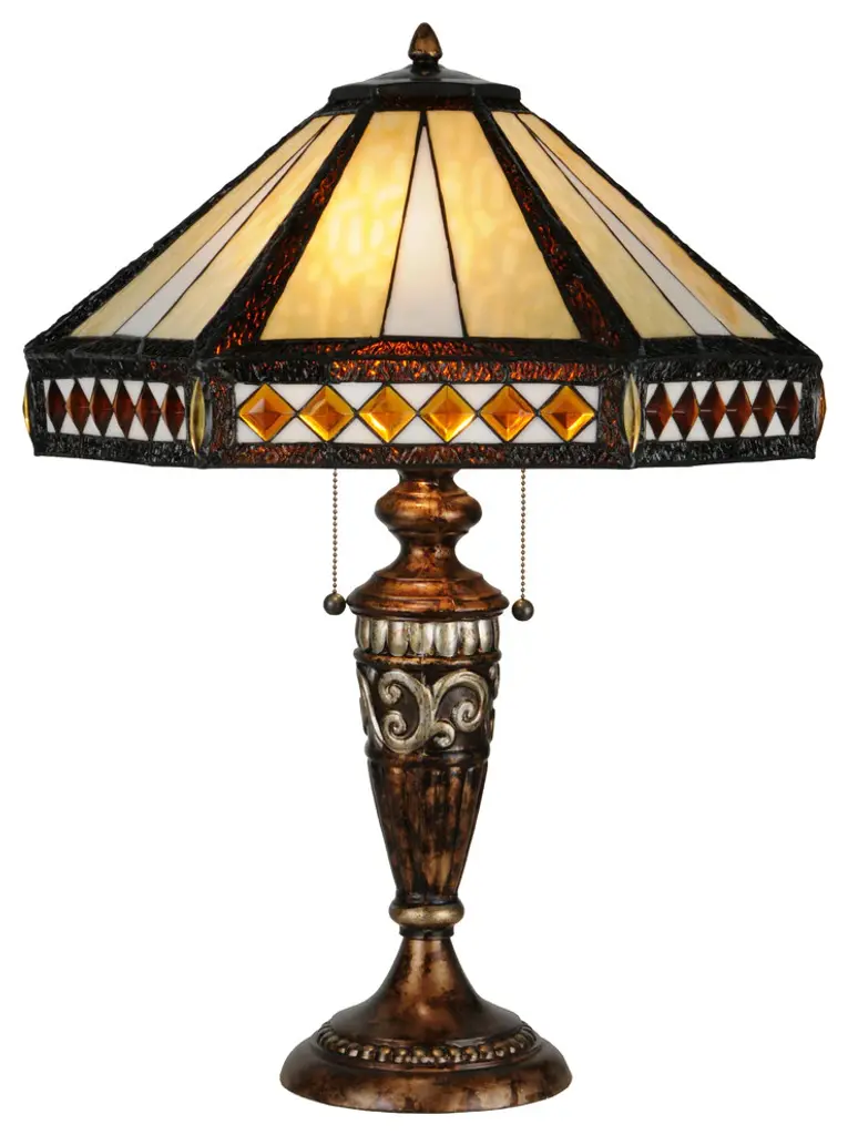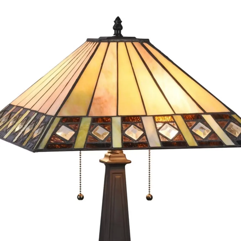 GILES, a Mission Tiffany-style 2 light blackish-bronze Mission table lamp will surely complement your home with its warm charm. Hand crafted from over 190 pieces of art glass and 24 beads that will add color and beauty to any space. Main colors are yellow, green and brown. Handcrafted using the same techniques that were developed by Louis Comfort Tiffany in the early 1900s, this beautiful Tiffany-style piece contains hand-cut pieces of stained glass, each wrapped in fine copper foil