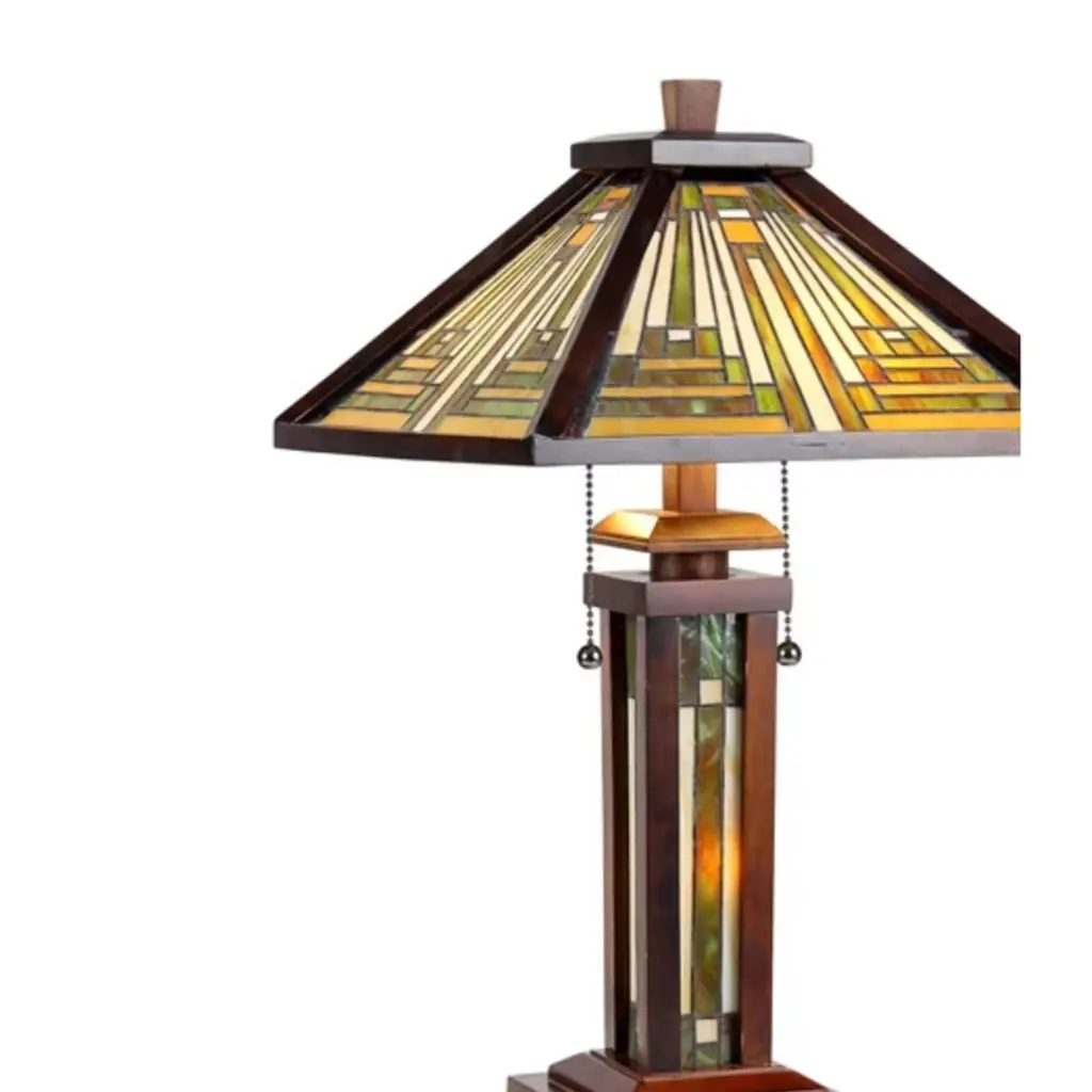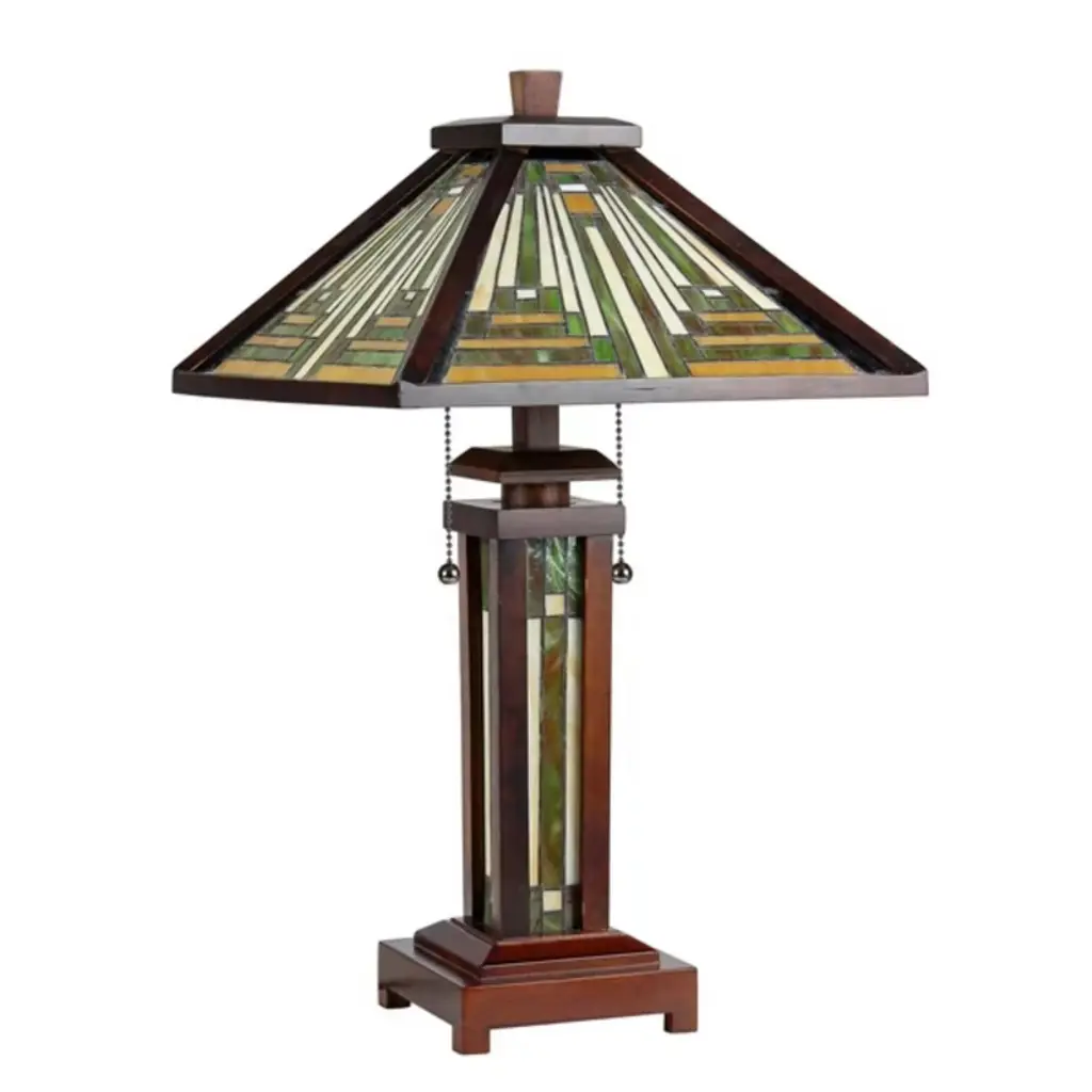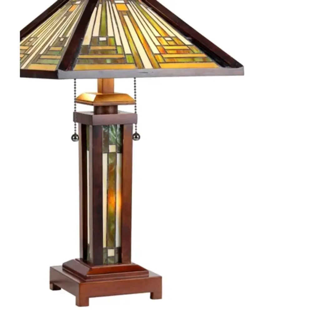 The Innes Mission-style table lamp combines rustic charm with artisan craftsmanship. Featuring a real stained glass shade and a warm dark walnut rubberwood base, this double-lit lamp offers soft ambient light from its lighted base and practical task lighting from the upper bulbs. A classic pull chain and rotary switch combination provides flexible illumination control. Ideal for living rooms, studies, or bedrooms, the Innes lamp serves as both a beautiful decor statement and a functional lighting solution. Key Features: Mission-inspired design with real stained glass and dark walnut wood finishDouble-lit functionality—main light plus lighted stained-glass basePull chain and on-cord rotary switch offer flexible light controlCrafted using traditional copper foil methods for stained glassDimensions: 25.6"H x 15"W x 15"D | Shade: 7.7"H x 15"W |Net Weight: 8.6 lbs A timeless blend of wood, stained glass, and ambient glow, perfect for warm interiors and artistic appeal.