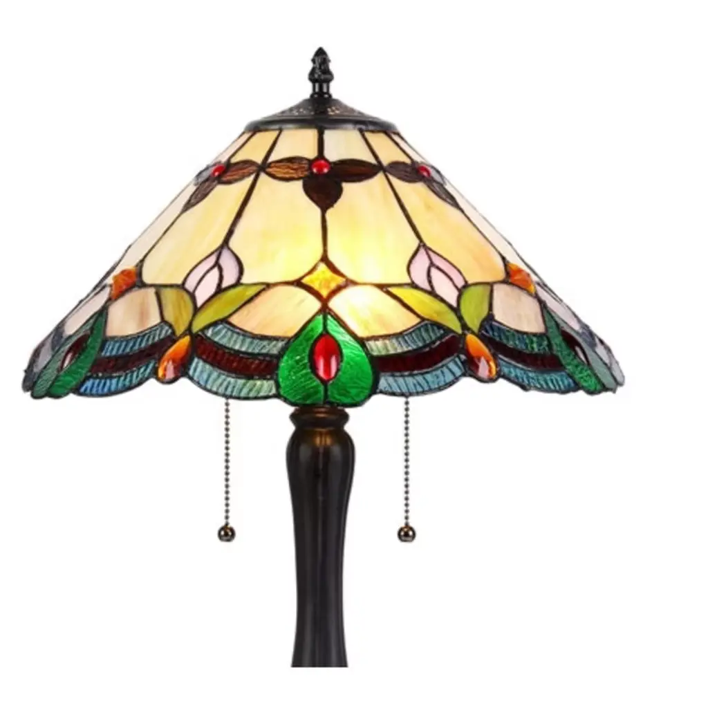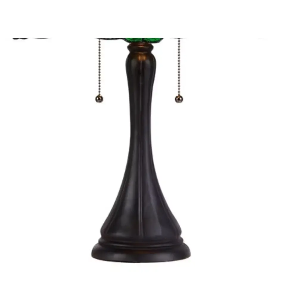 A stunning nod to early 20th-century artistry, the Jorgie Table Lamp showcases rich Victorian charm and intricate Tiffany craftsmanship. Hand-assembled from 156 pieces of art glass and 12 jewel-toned glass beads, this two-light lamp radiates timeless elegance. The warm glow filtered through its richly colored dome shade enhances any traditional or eclectic interior, while the dark antique bronze finish on its resin and metal base grounds the design in classic style. Key Features: Requires (2) 100W E26 Type A bulbs (not included) for rich, ambient lighting Handcrafted Tiffany-glass shade using copper foil technique for timeless detail Dark antique bronze finish provides a sophisticated vintage appeal Dual pull chain switches for convenient light control Dimensions: 21.3"H x 15.7"W | Net Weight: 7.3 lbs | 72" cord