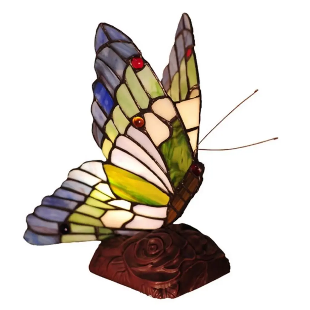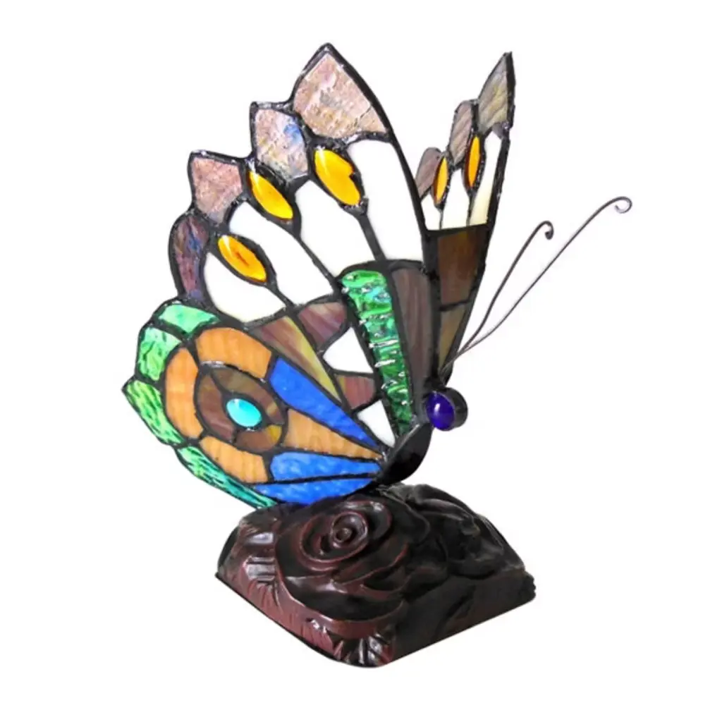 This Tiffany style butterfly design accent lamp contains hand cut pieces of stained glass with bronze finish base and will compliment many decors throughout your home