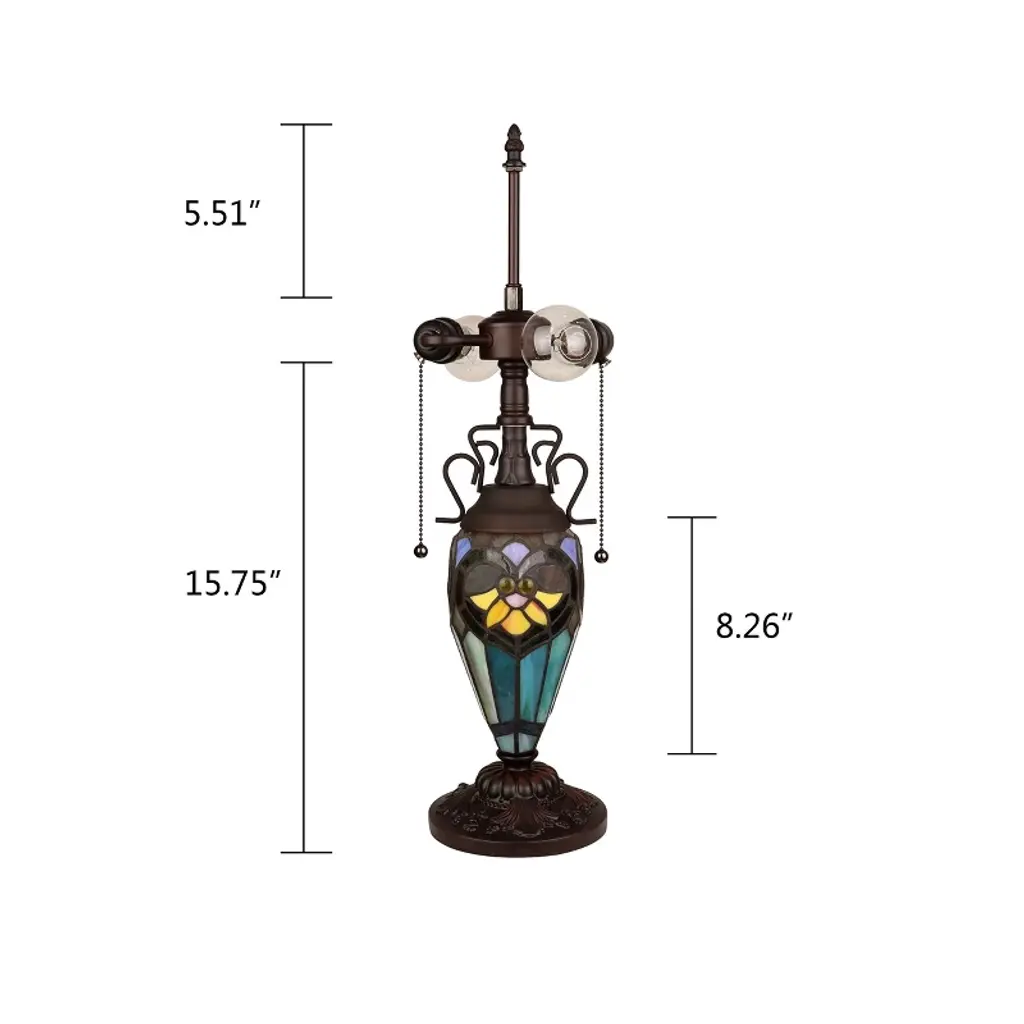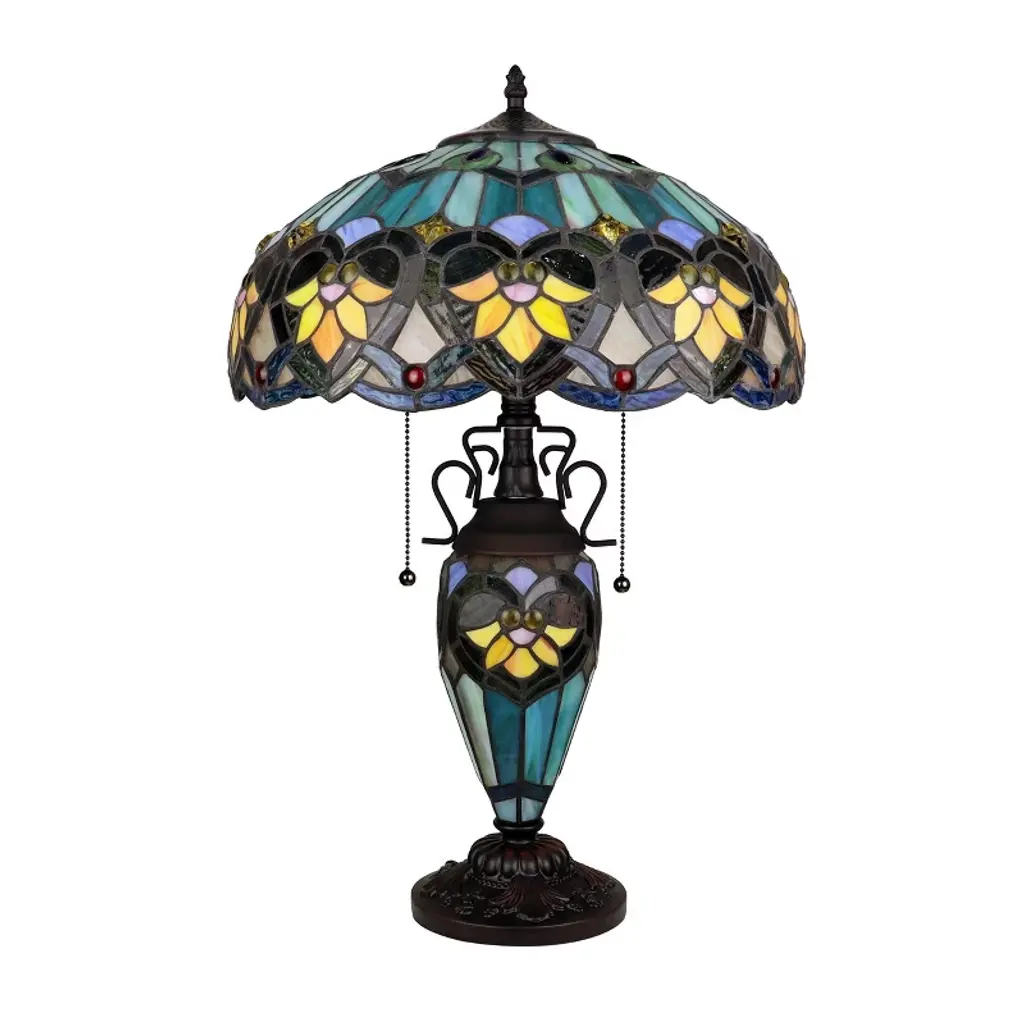 Kendall is a beautifully designed floral-style, stained glass double-lit table lamp. This lamp is made up of 517 pieces of hand-cut stained art glass and 56 glass beads, expertly pieced and soldered together to create each shade. Each shade is formed using the very same technique developed by Louis Comfort Tiffany in the early 1900s, using hand-cut stained art glass, each wrapped in fine copper foil and soldered together at extremely high temperatures to form each unique shade. The exact size to the nearest inch may vary, and the exact color of each glass piece may vary due to each piece being handcrafted. The first image is with the light shining through, the second image is with no light. Dry-listed and recommended for an indoor setting.