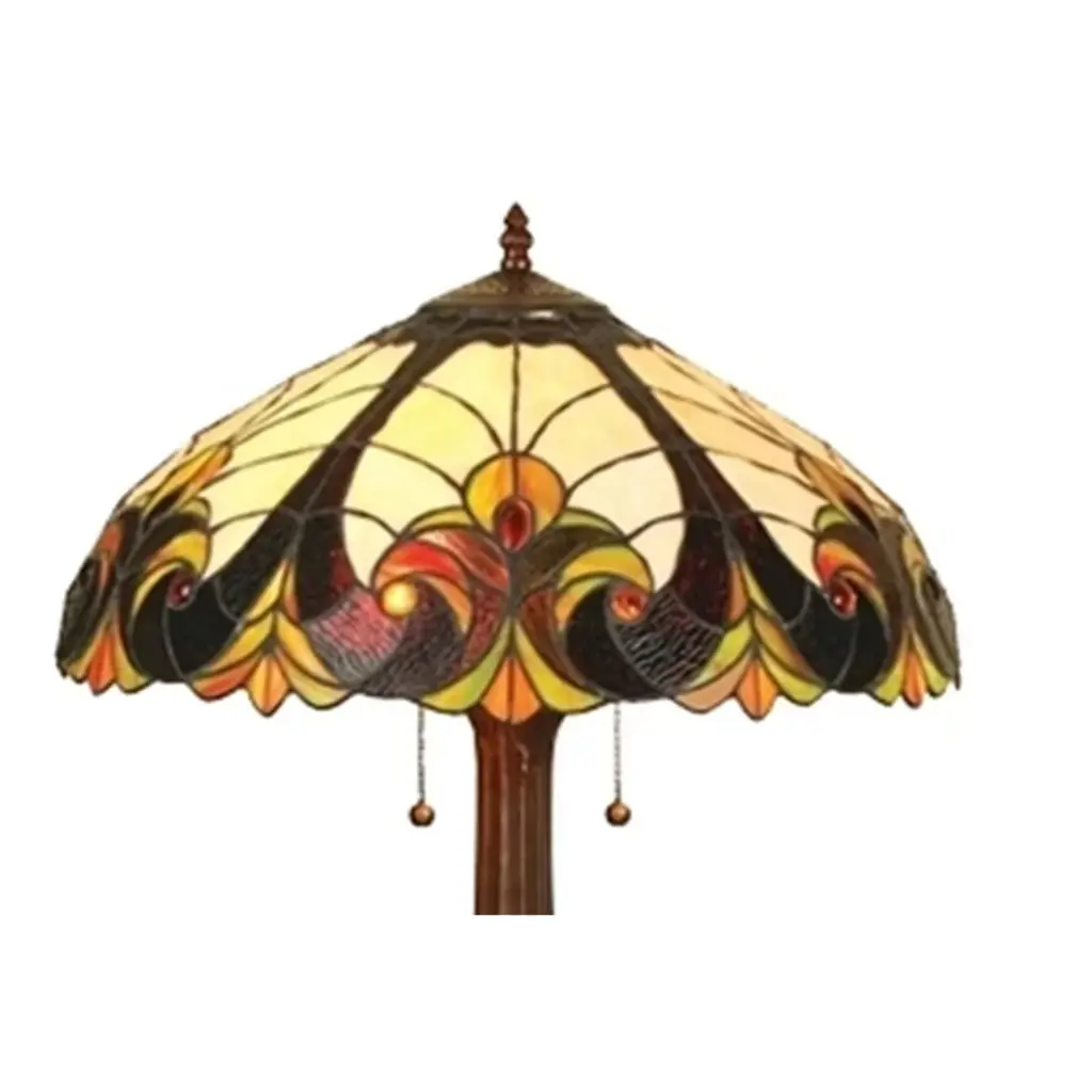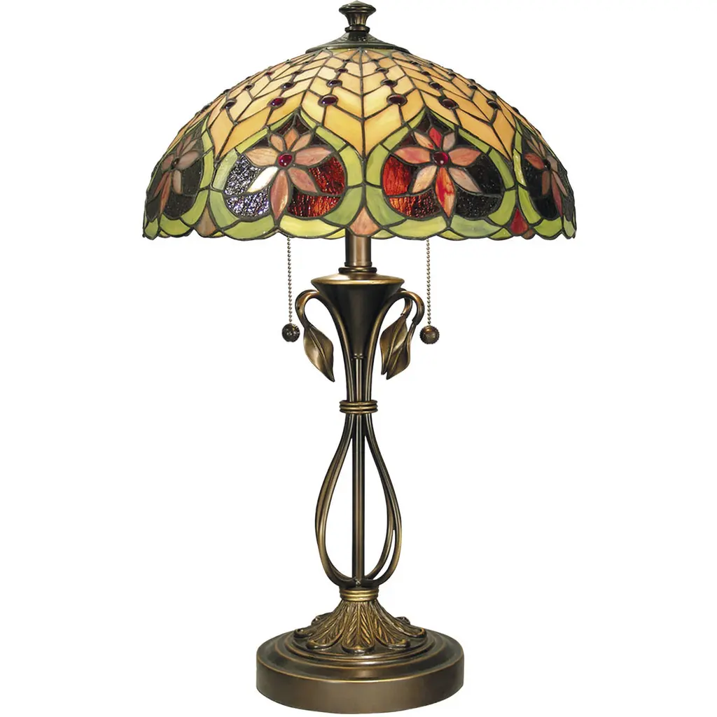 The Chloe Lighting CH18780VI18-TL2 "Liaison" Tiffany-style 2-Light Victorian Table Lamp features a handcrafted shade made from over 300 pieces of stained glass and 18 glass beads, each wrapped in copper foil and soldered together. This intricate design is inspired by the techniques developed by Louis Comfort Tiffany in the early 1900s